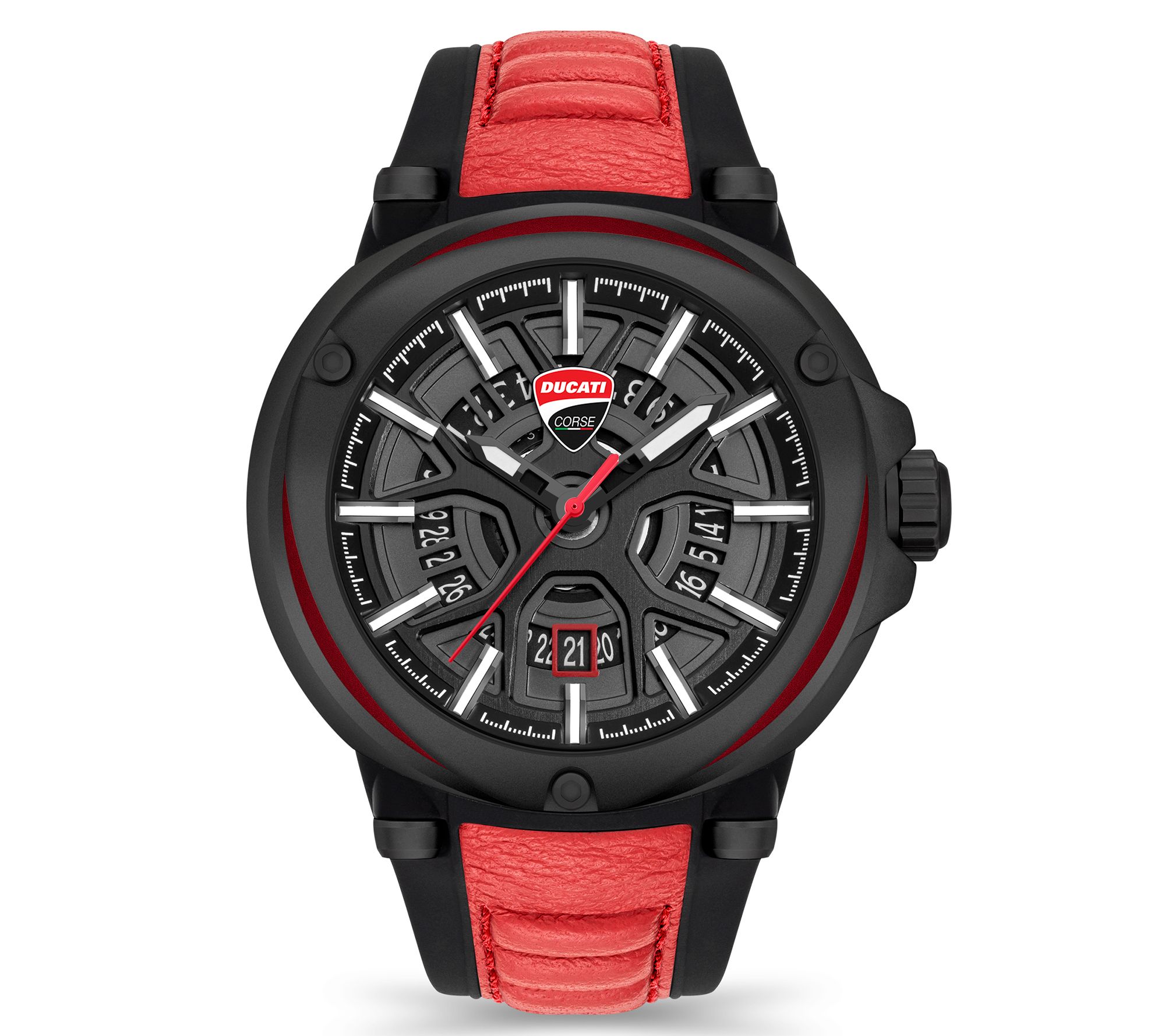 • Black layered dial; white indexes; Ducati Corse shield embellishment; skeleton calendar with date window at 6 o'clock