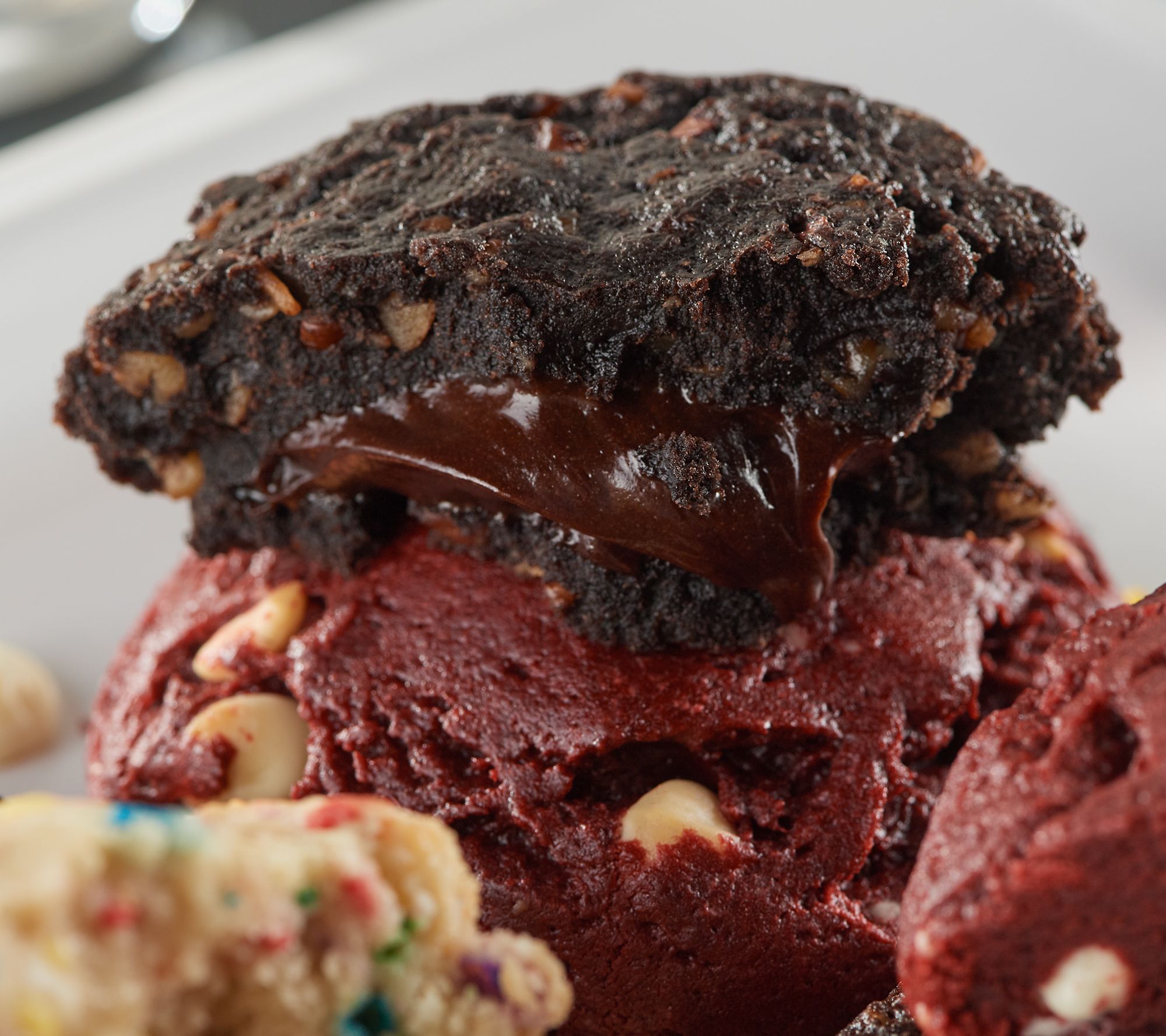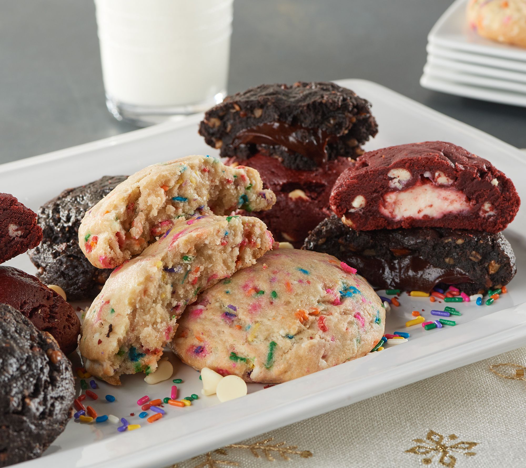 • Includes 12 5-oz jumbo stuffed cookies: four each of chocolate pecan fudge, red velvet cheesecake, and funfetti