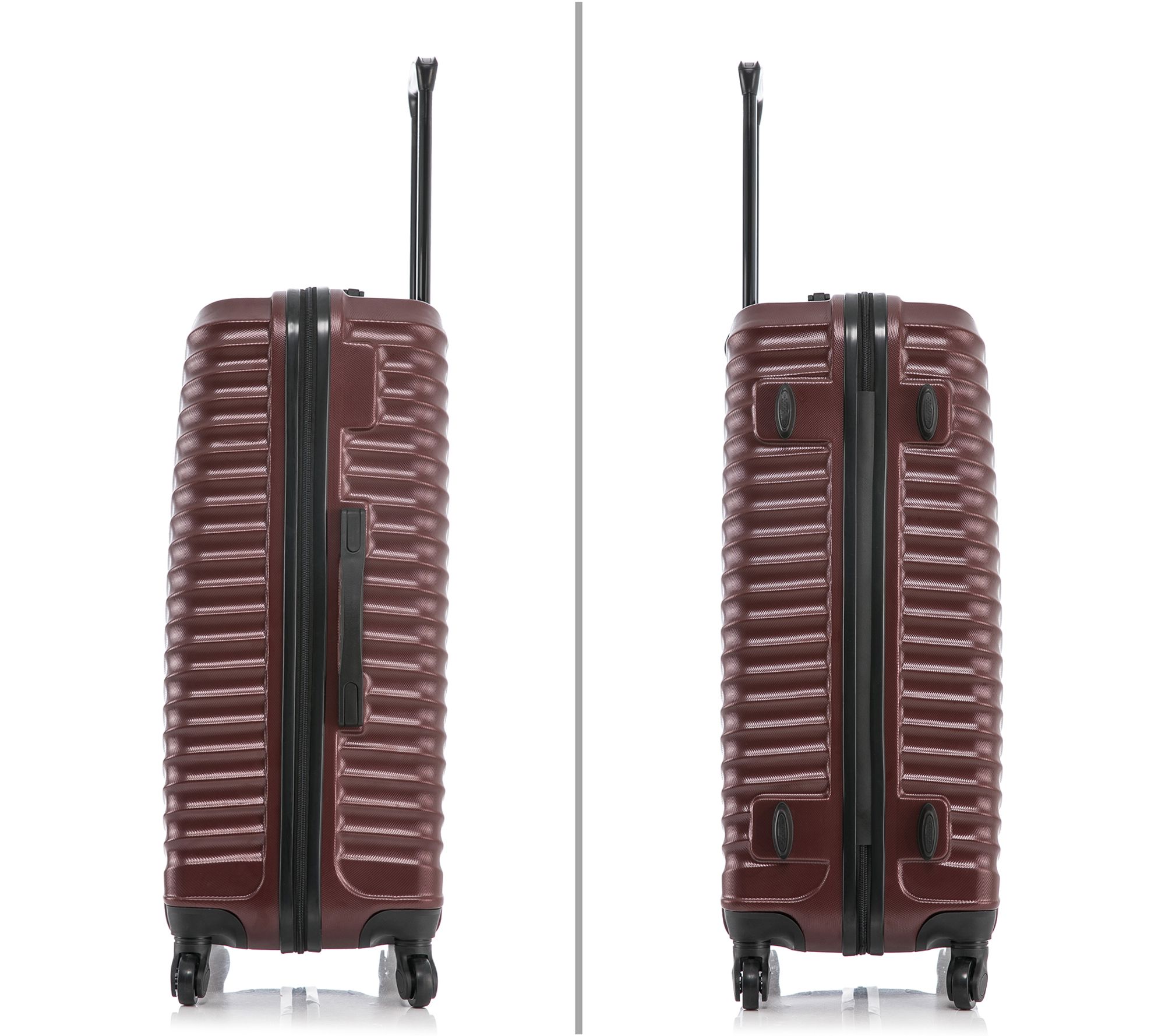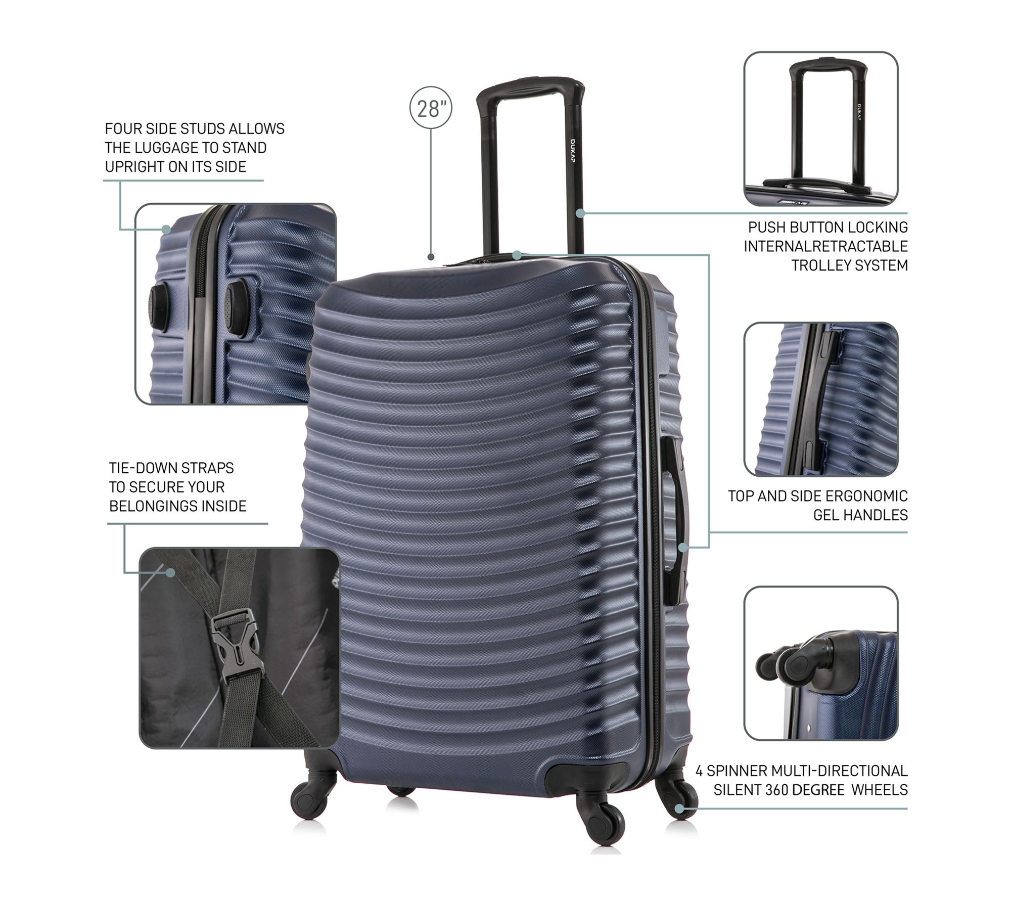• PC/ABS hardside exterior, push button locking internal retractable trolley handle, top and side gel handles, four spinner 360-degree wheels, smooth gliding oversized zipper, four side studs for upright standing