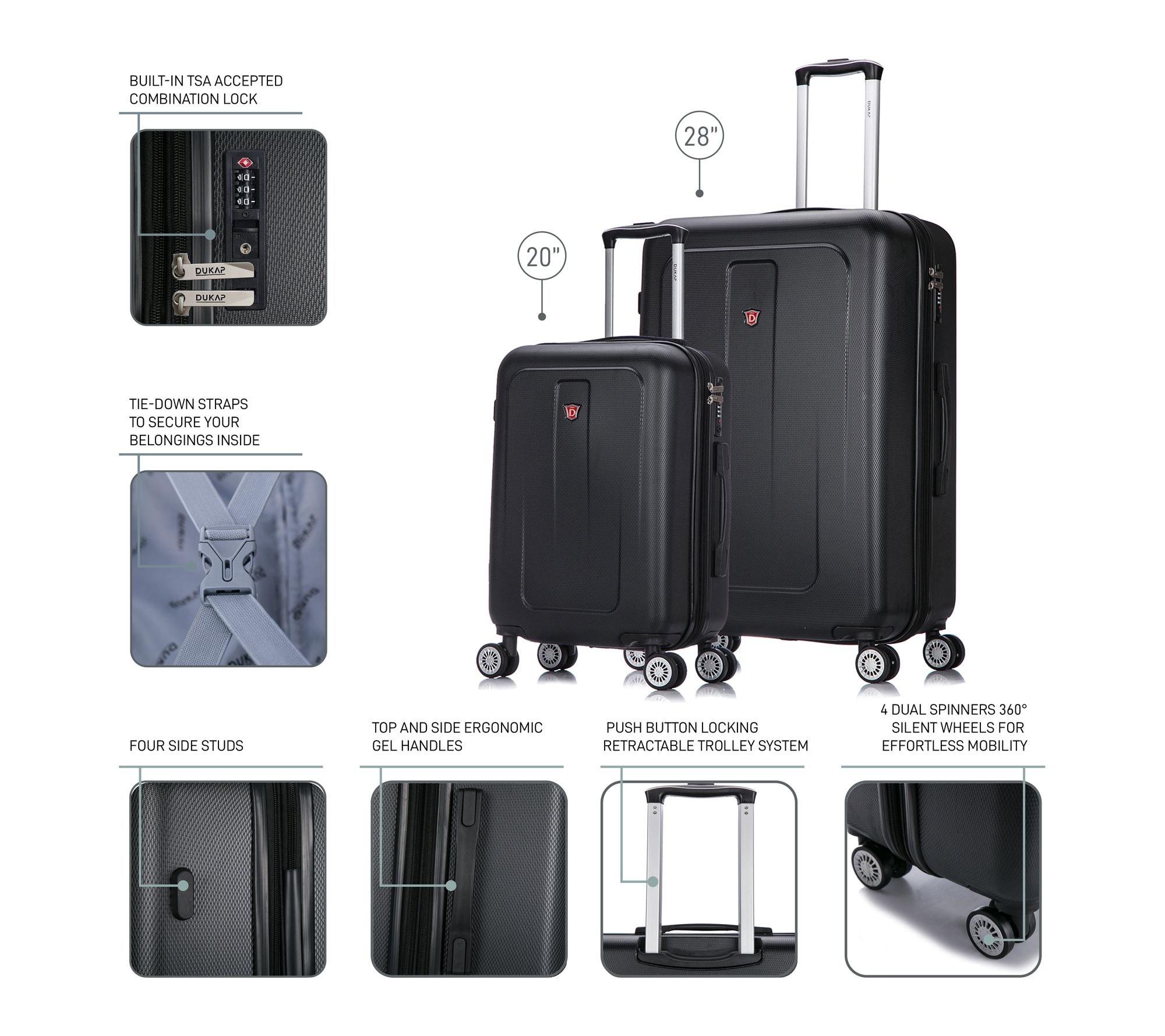 Traveling just got easier with this DUKAP Crypto lightweight hardside luggage set -- the ideal companion for business trips or family vacations. Glide smoothly through airports with four dual spinner wheels, stay organized thanks to the fully lined interior with zippered compartment and snap-on straps, and enjoy peace of mind from the built-in TSA-approved combination lock. From DUKAP.