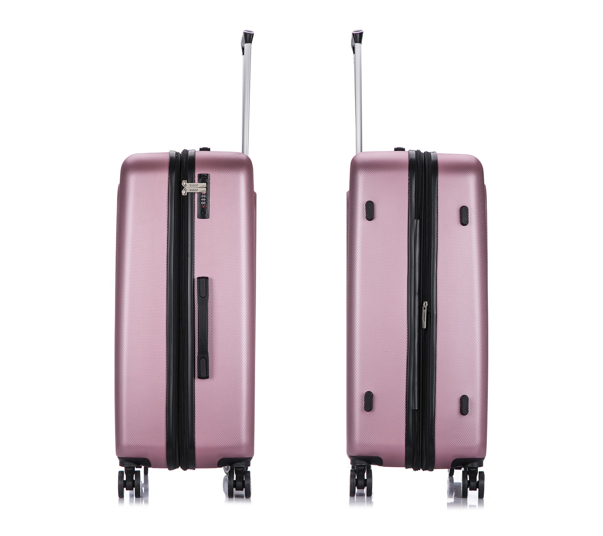 PC/ABS exterior with micro diamond finish, hard-flex construction, expands 2" for extra space, four dual spinner 360 silent wheels, top and side ergonomic GEL handle, four side studs, smooth gliding oversized zippers, push button locking internal retractable trolley handle, built-in 3-digit TSA-approved combination lock