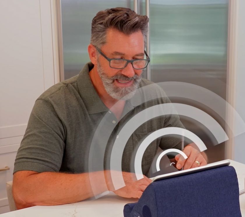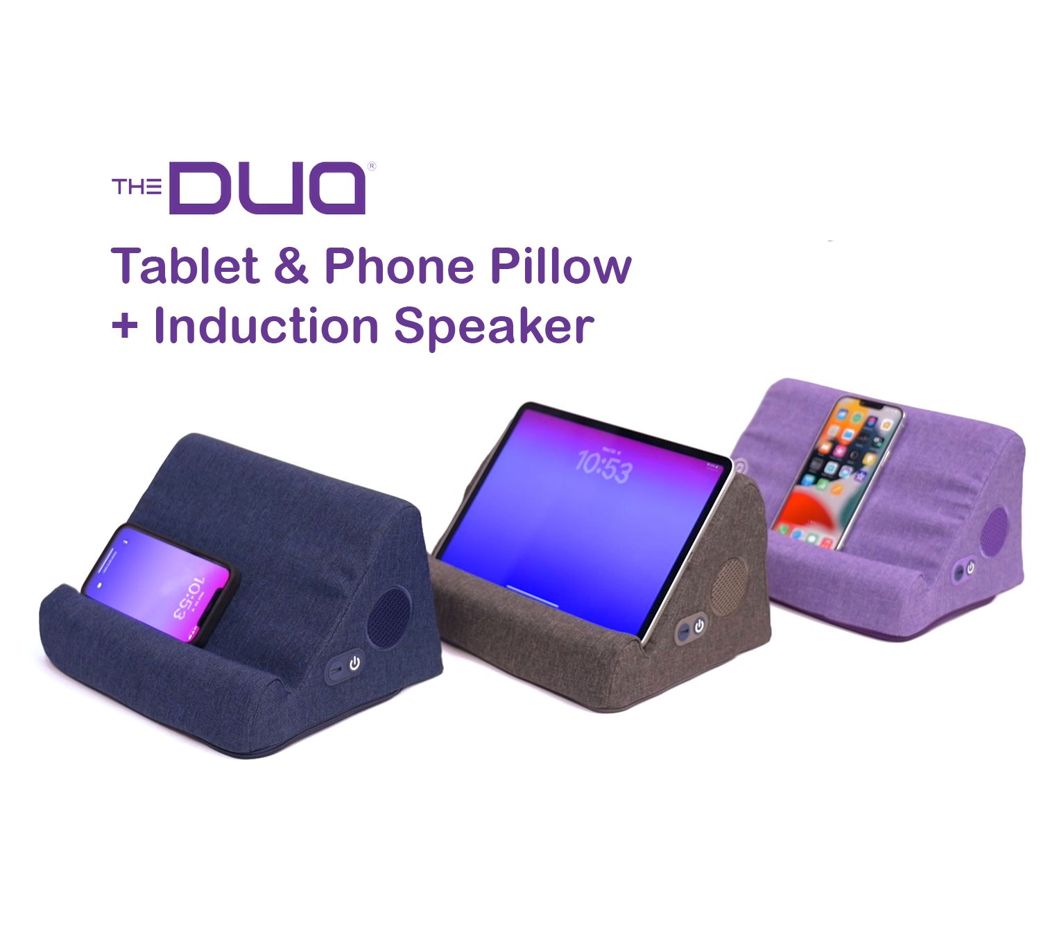 Watching movies, joining virtual meetings, or scrolling your favorite apps feels effortless with this induction speaker tablet pillow. A soft, cushioned stand props up your device at three comfy angles while built-in wireless speaker technology lets you enjoy clear sound anywhere. Keep your accessories stashed in the handy side pocket for a neat and tidy experience. From Duo.