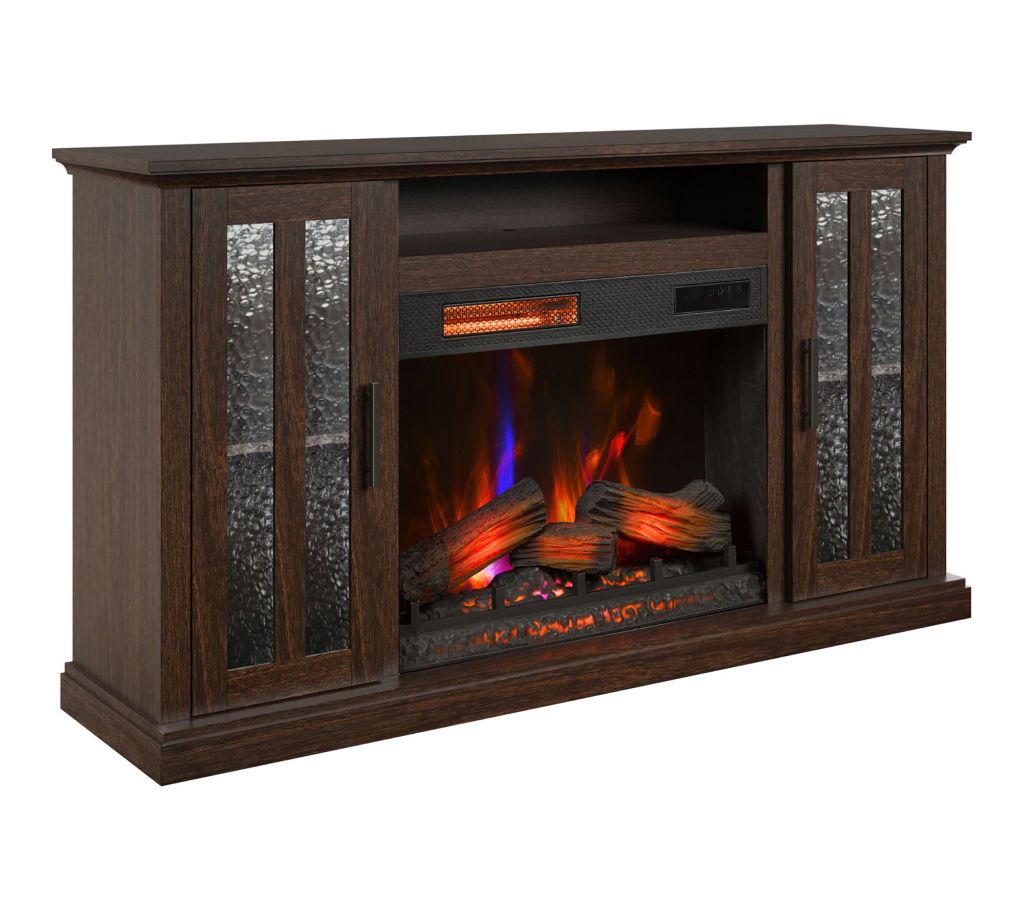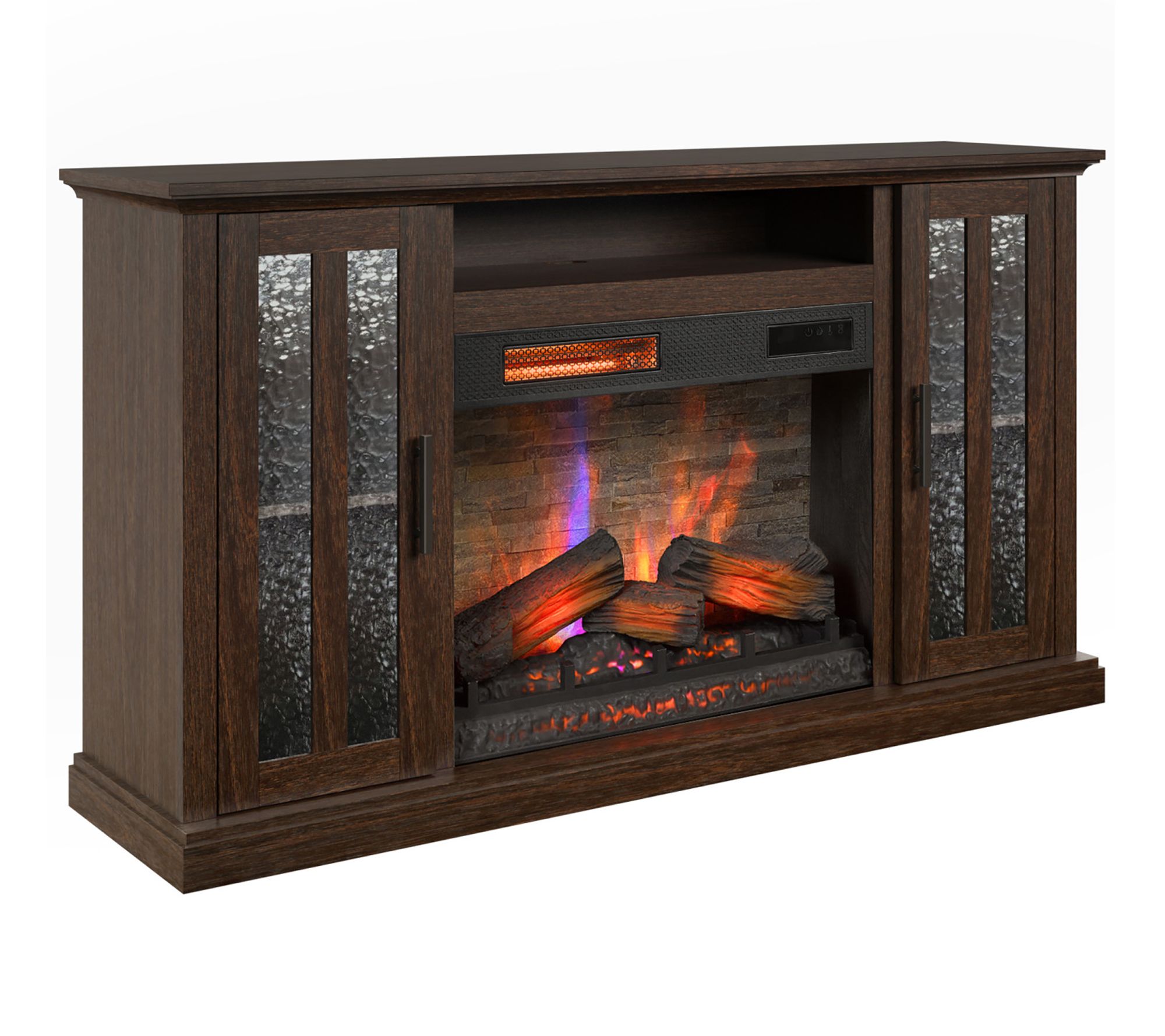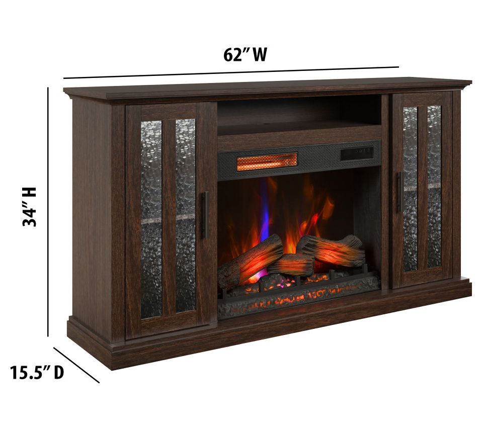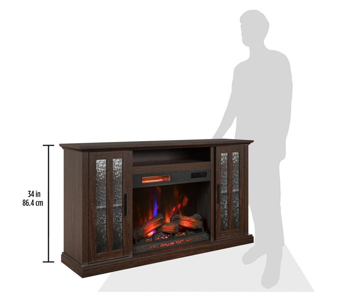 Transform your living room into a cozy retreat with this electric fireplace TV stand, blending style and convenience in one sleek package. Textured glass cabinets and a Stormburg Oak finish offer a seamless look, while the infrared heater's glowing logs and 3D flame effect create a welcoming ambiance for movie nights or family gatherings. From Duraflame.
