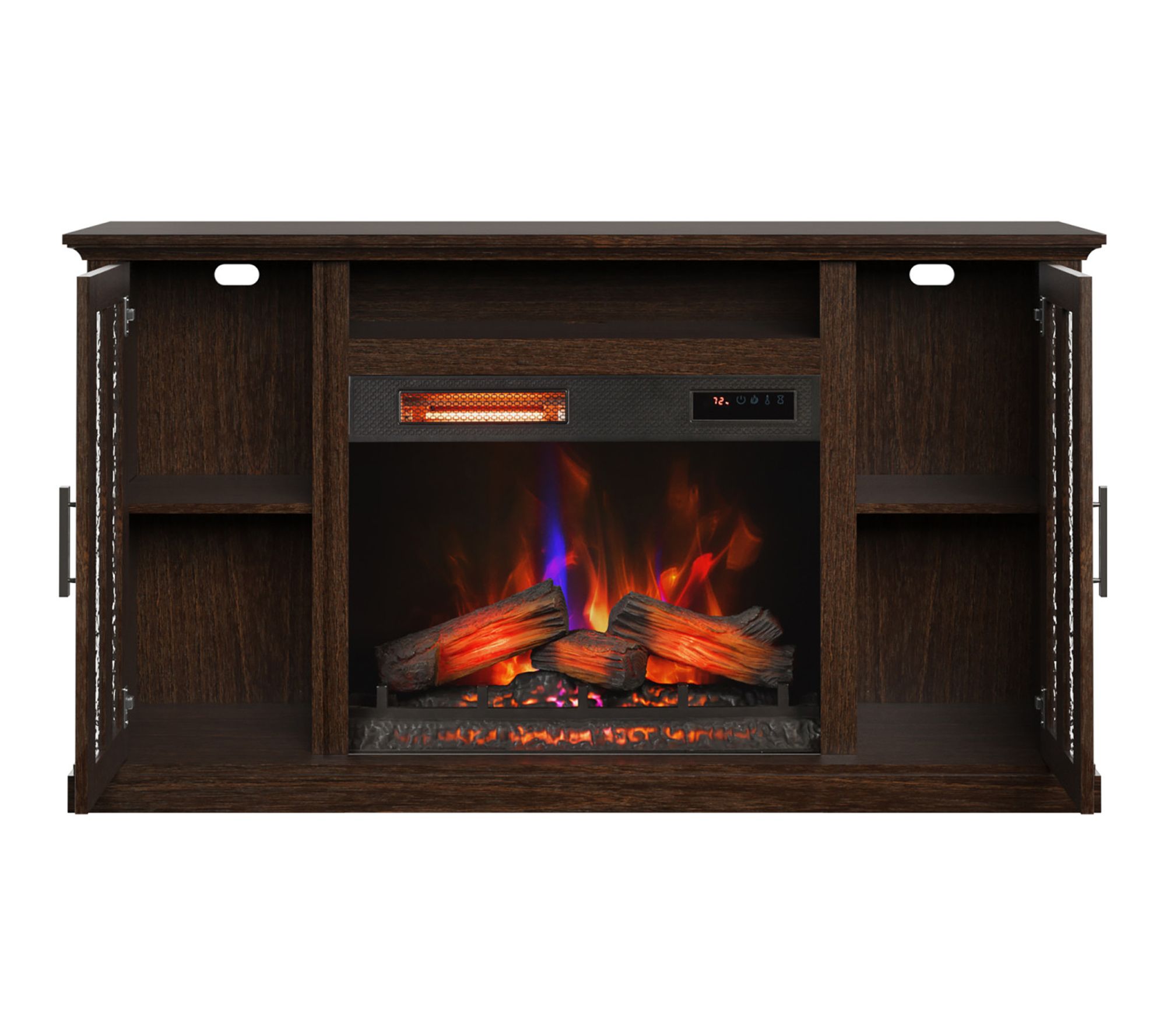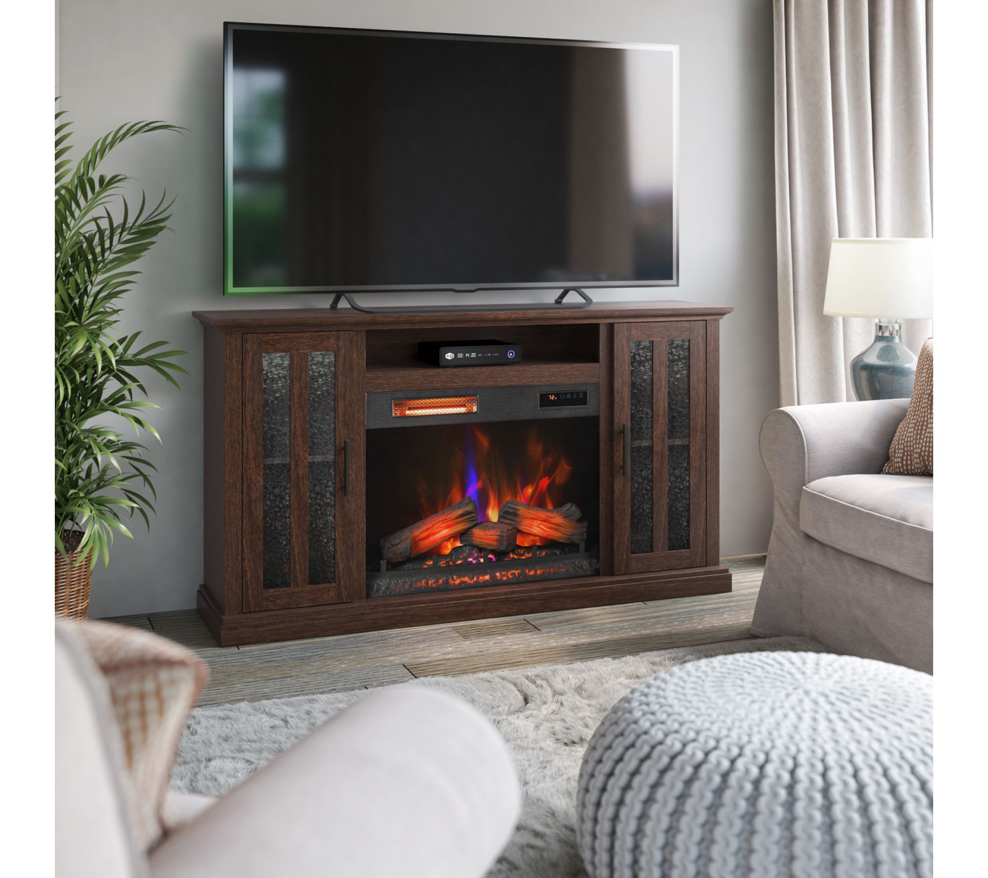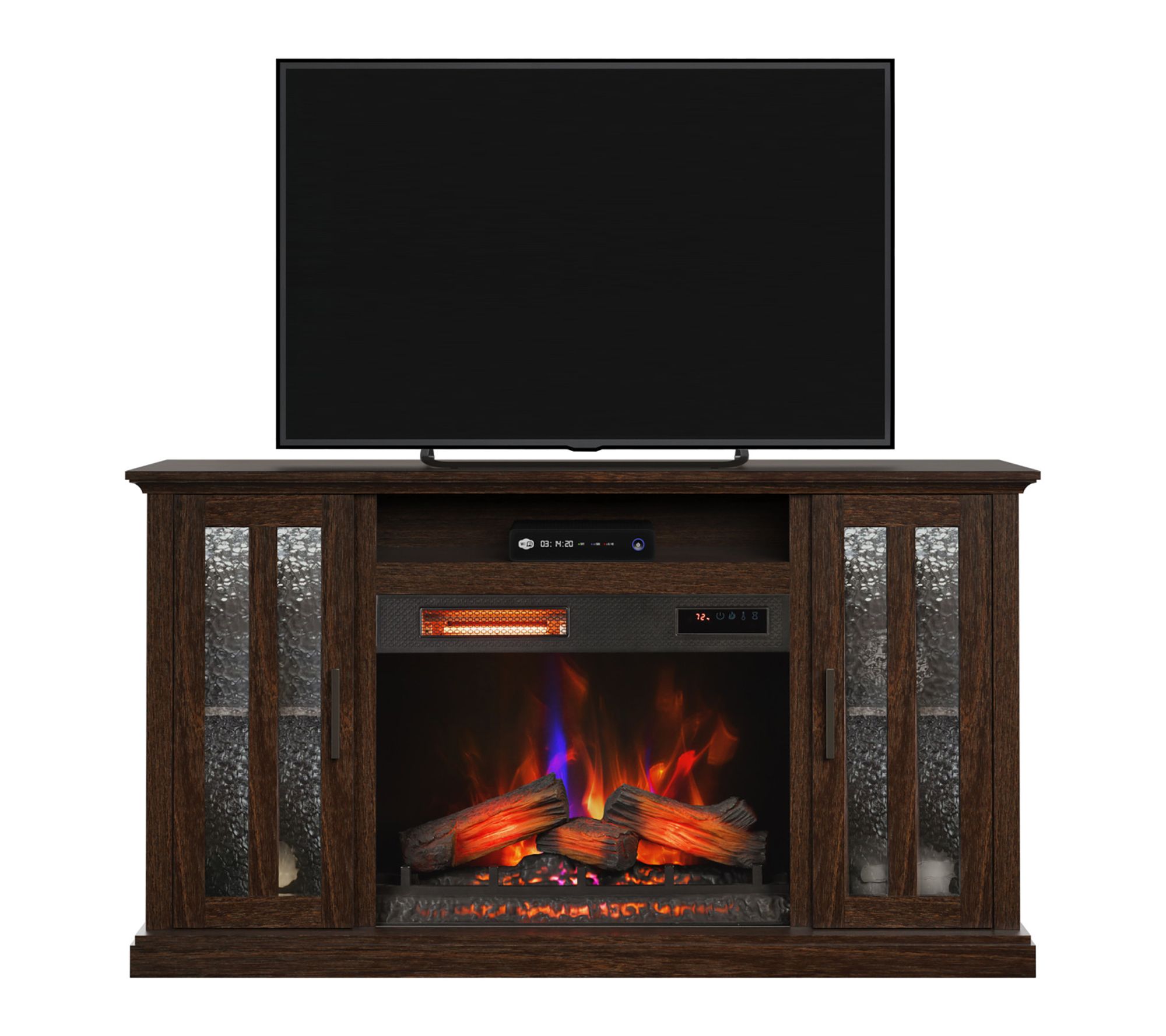 Transform your living room into a cozy retreat with this electric fireplace TV stand, blending style and convenience in one sleek package. Textured glass cabinets and a Stormburg Oak finish offer a seamless look, while the infrared heater's glowing logs and 3D flame effect create a welcoming ambiance for movie nights or family gatherings. From Duraflame.