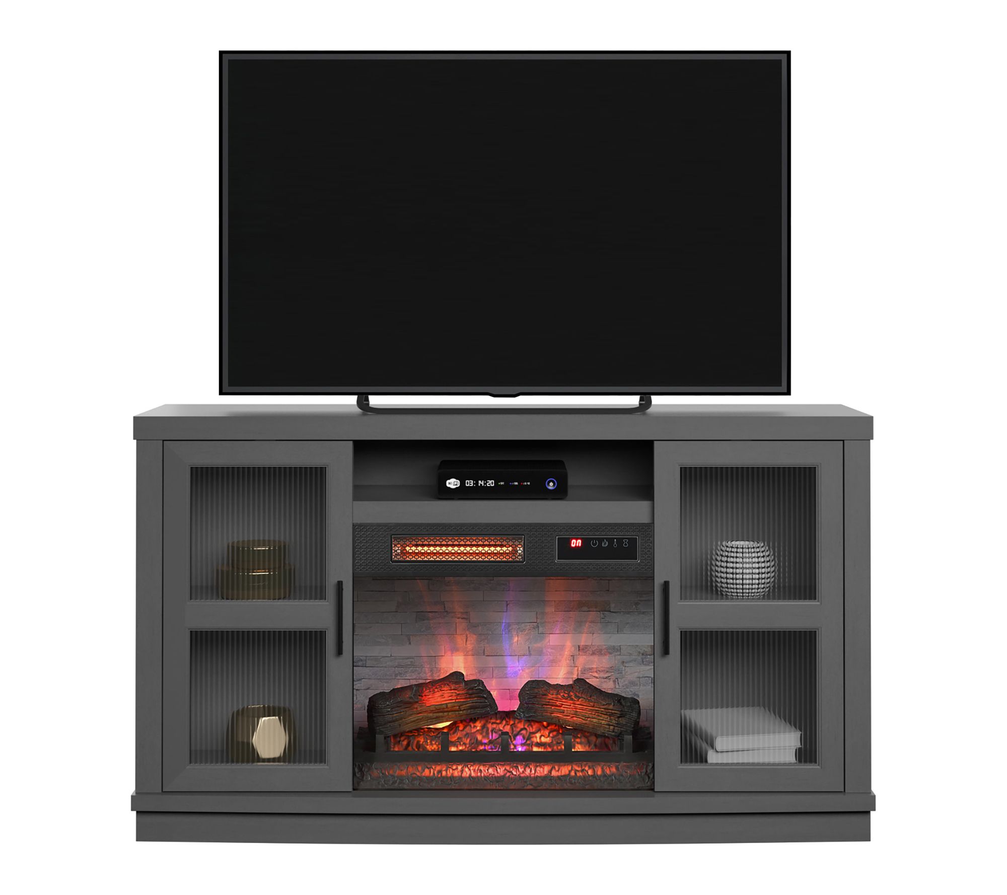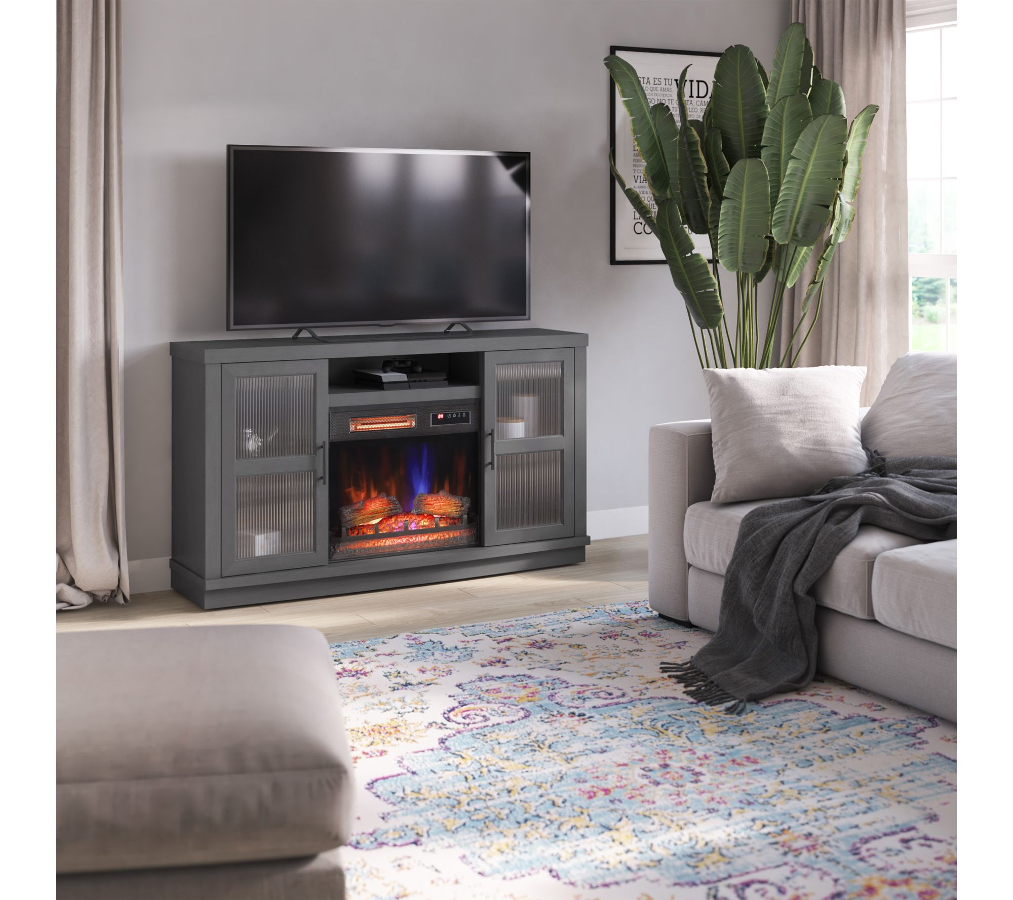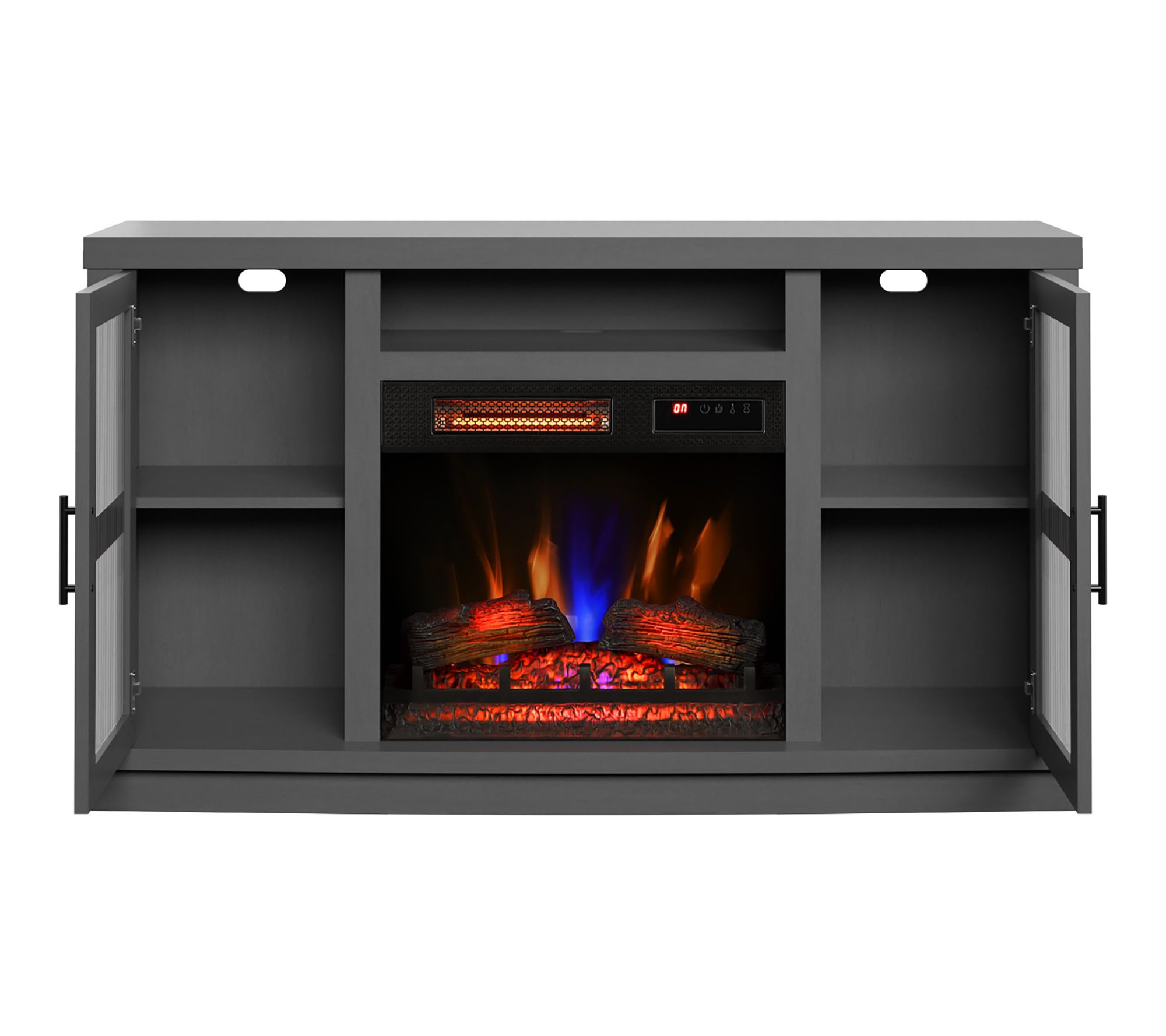 Transform chilly evenings into warm memories with this infrared fireplace entertainment console, designed for TVs up to 60". Adjustable 3D flame effects set a cozy backdrop, while powerful infrared heat quickly warms rooms up to 1,000 sq feet. From Duraflame.