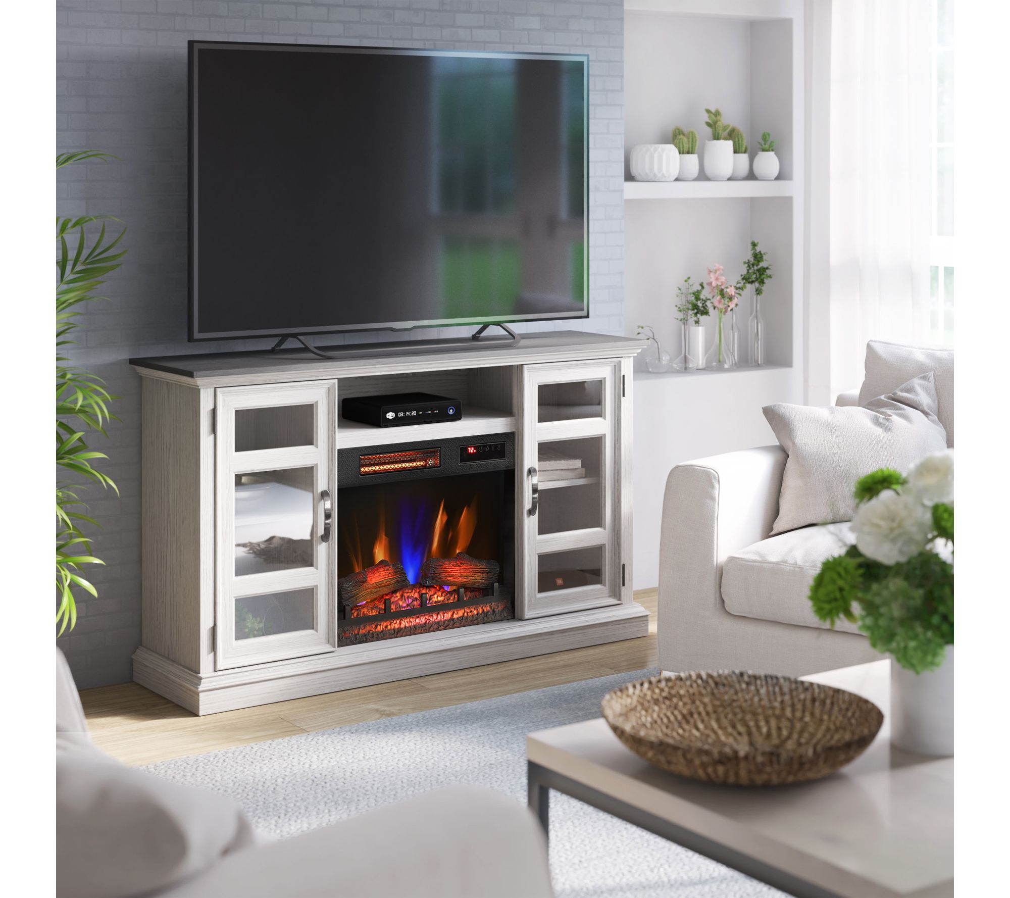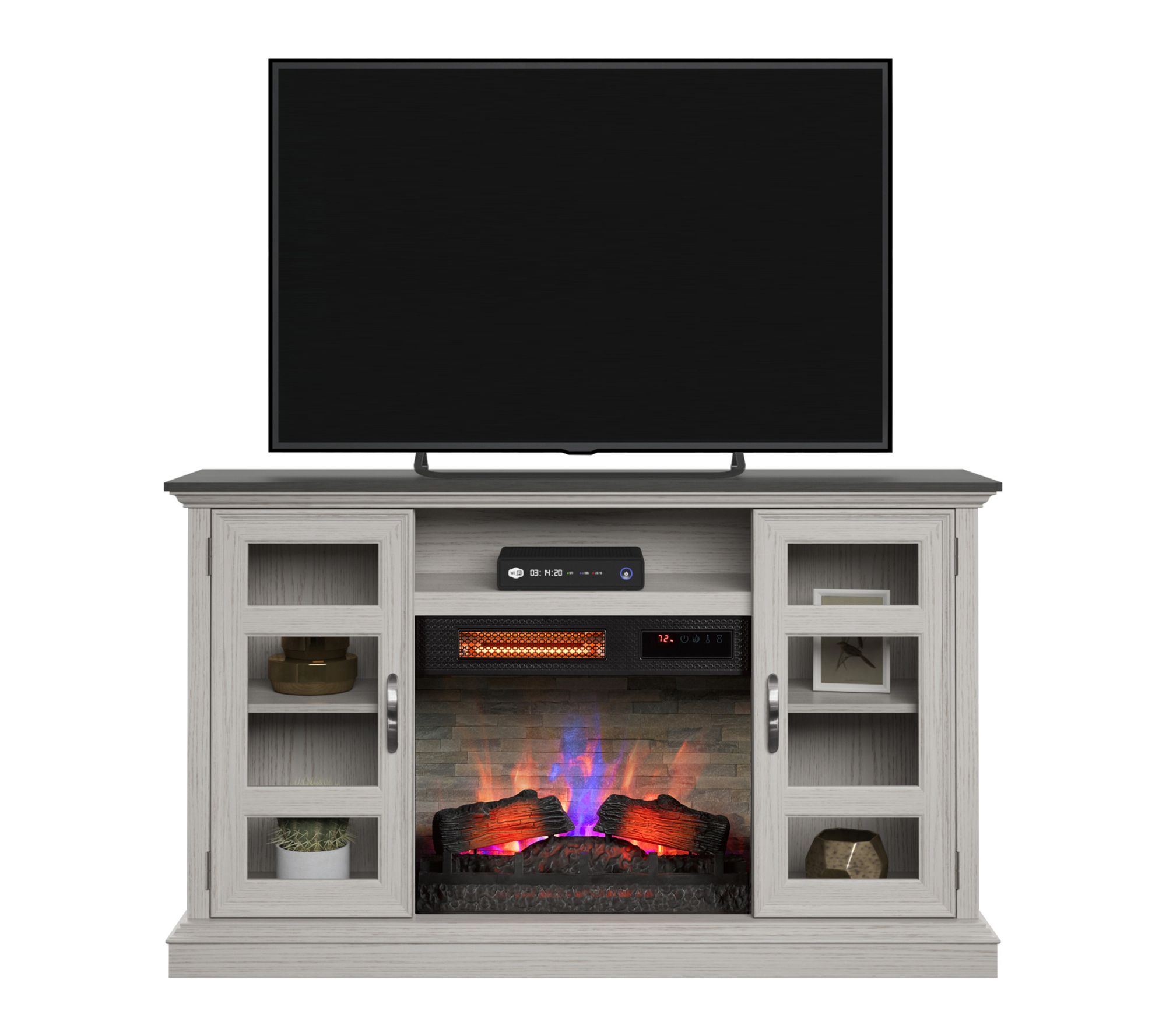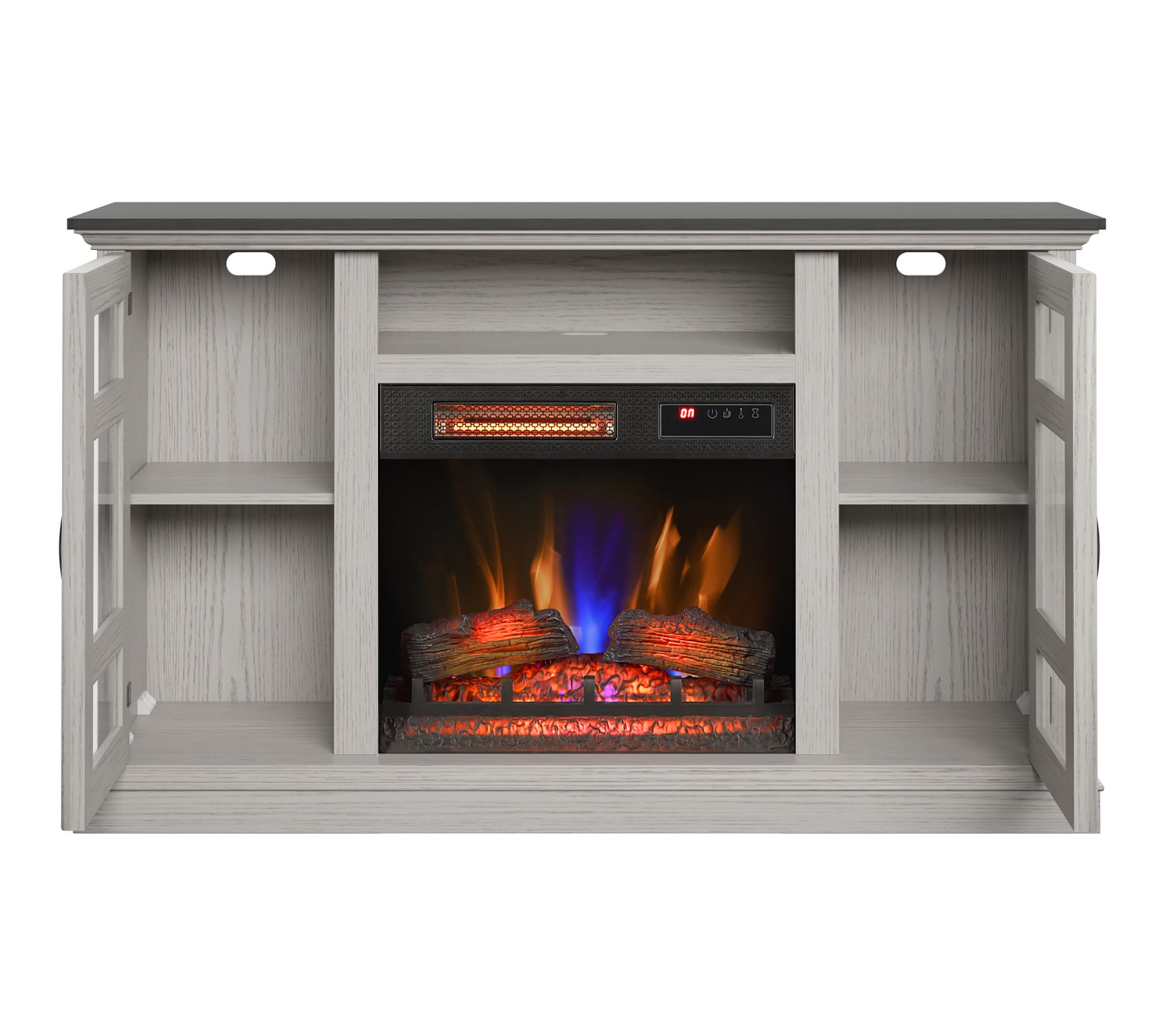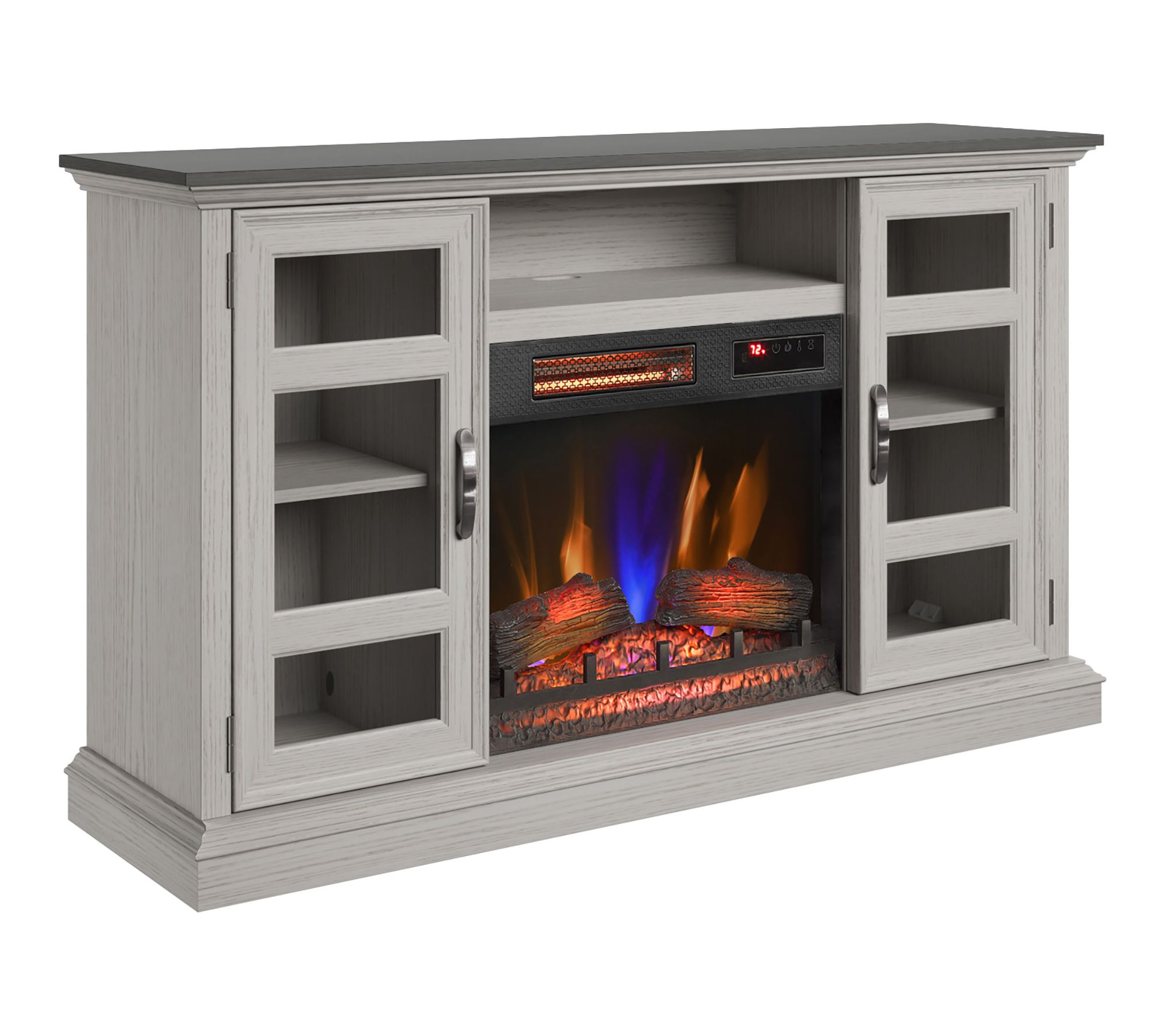 Movie nights, family gatherings, or quiet evenings take on a cozy new glow with this fireplace entertainment center. The infrared heater brings instant, adjustable warmth to large spaces, while glass cabinets neatly showcase your favorite decor or media. Make your living room the heart of your home with this freestanding piece. From Duraflame.