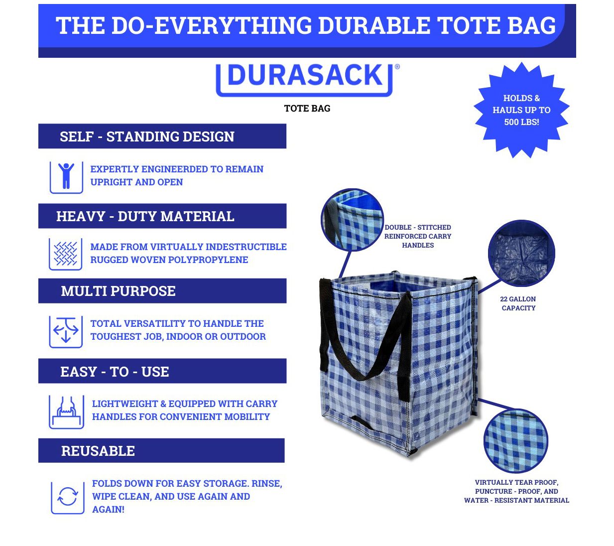 Perfect for storage, moving, and tidying up your home or yard, the DuraSack gingham yard tote is your new go-to utility bag. Featuring carry handles and long carry straps, it's designed to be reusable, durable, and easy to clean. From DuraSack.