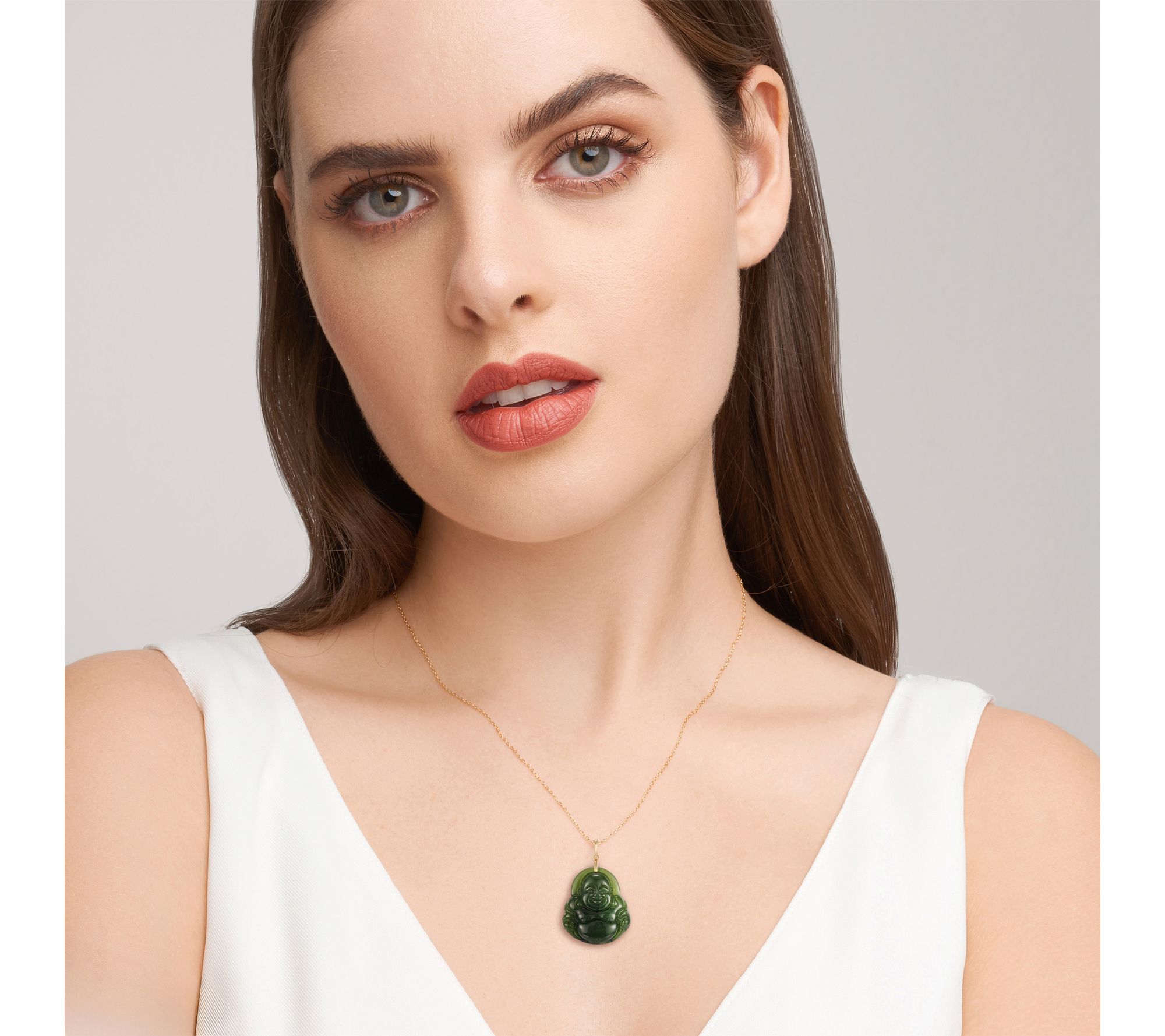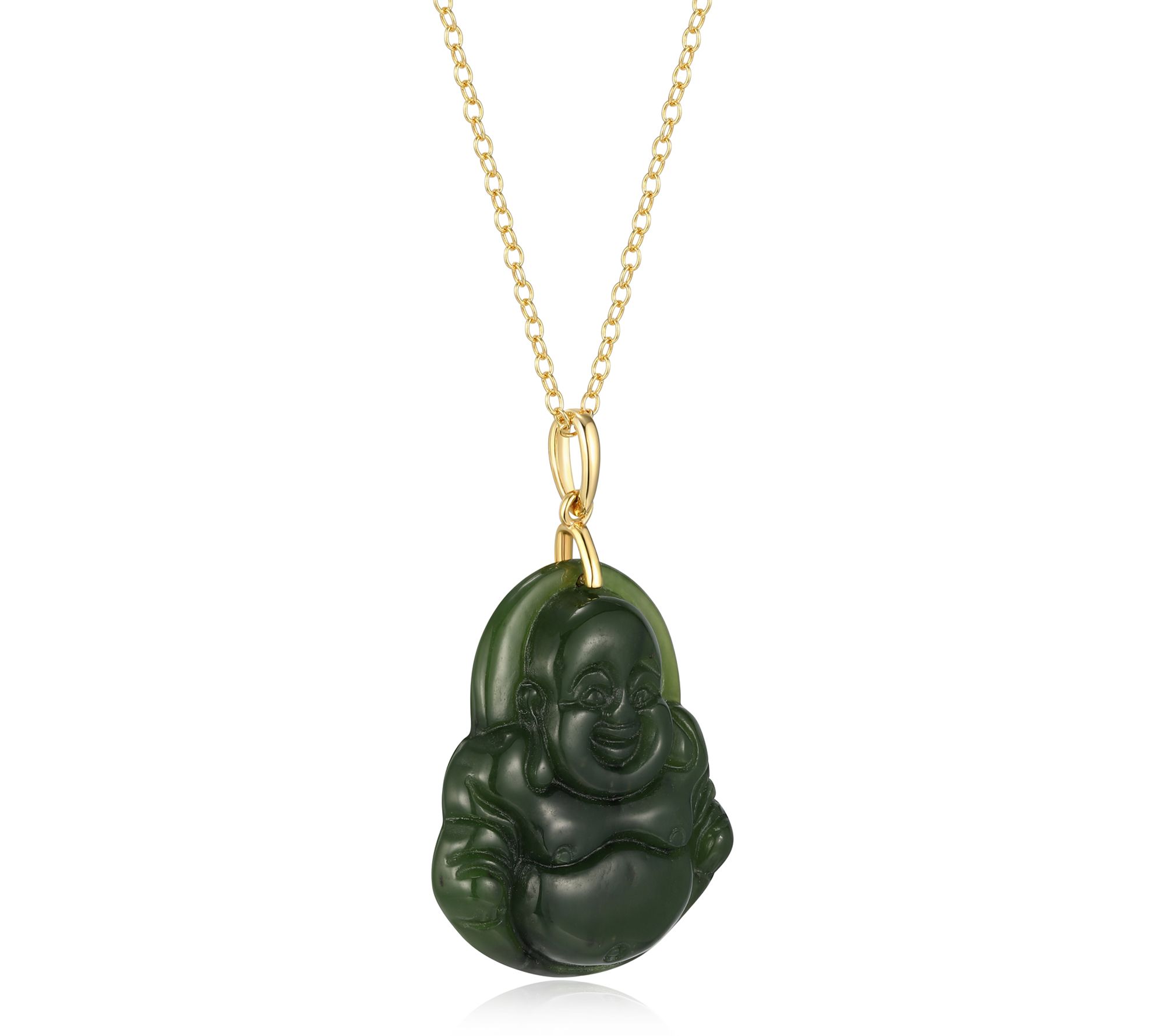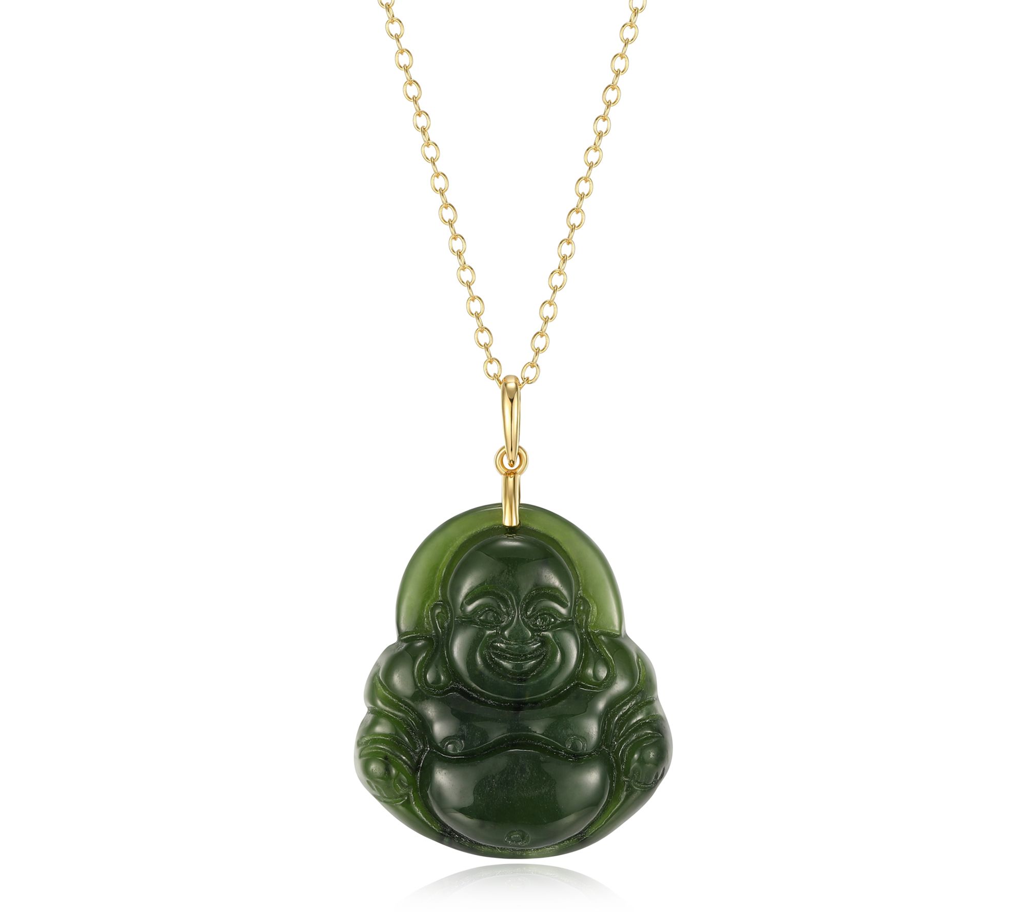 Whether dressing up for a special dinner or bringing a touch of serenity to your everyday look, this Buddha pendant necklace shimmers with tranquil elegance. Nephrite jade is intricately carved and paired with rich 18K gold-plated sterling silver, creating a timeless accent that holds meaning and beauty in every detail. From Dynasty Jade.