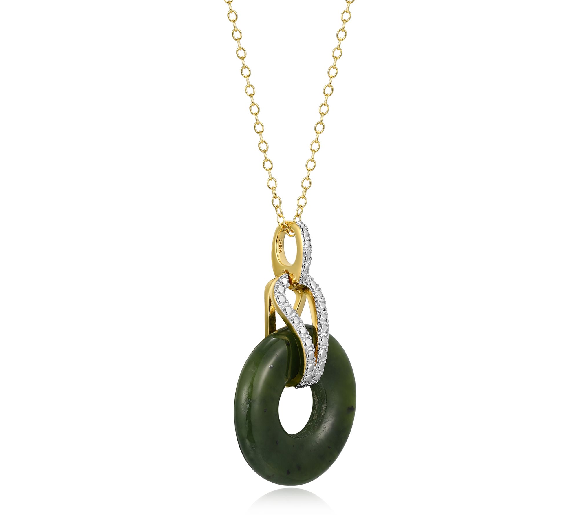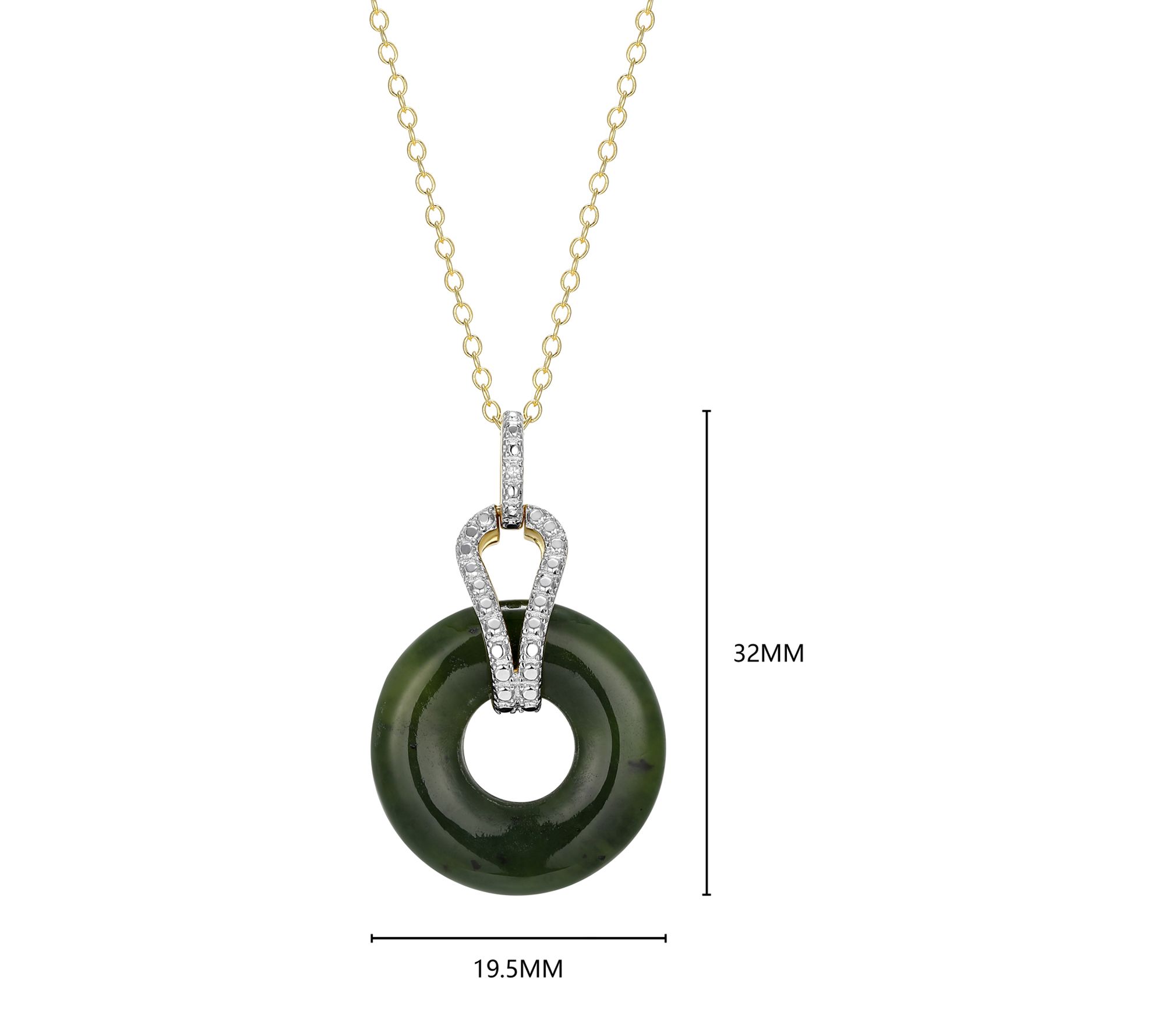 Open circle pendant of nephrite jade with diamond accents; pave and glue settings; polished finish; cable link chain