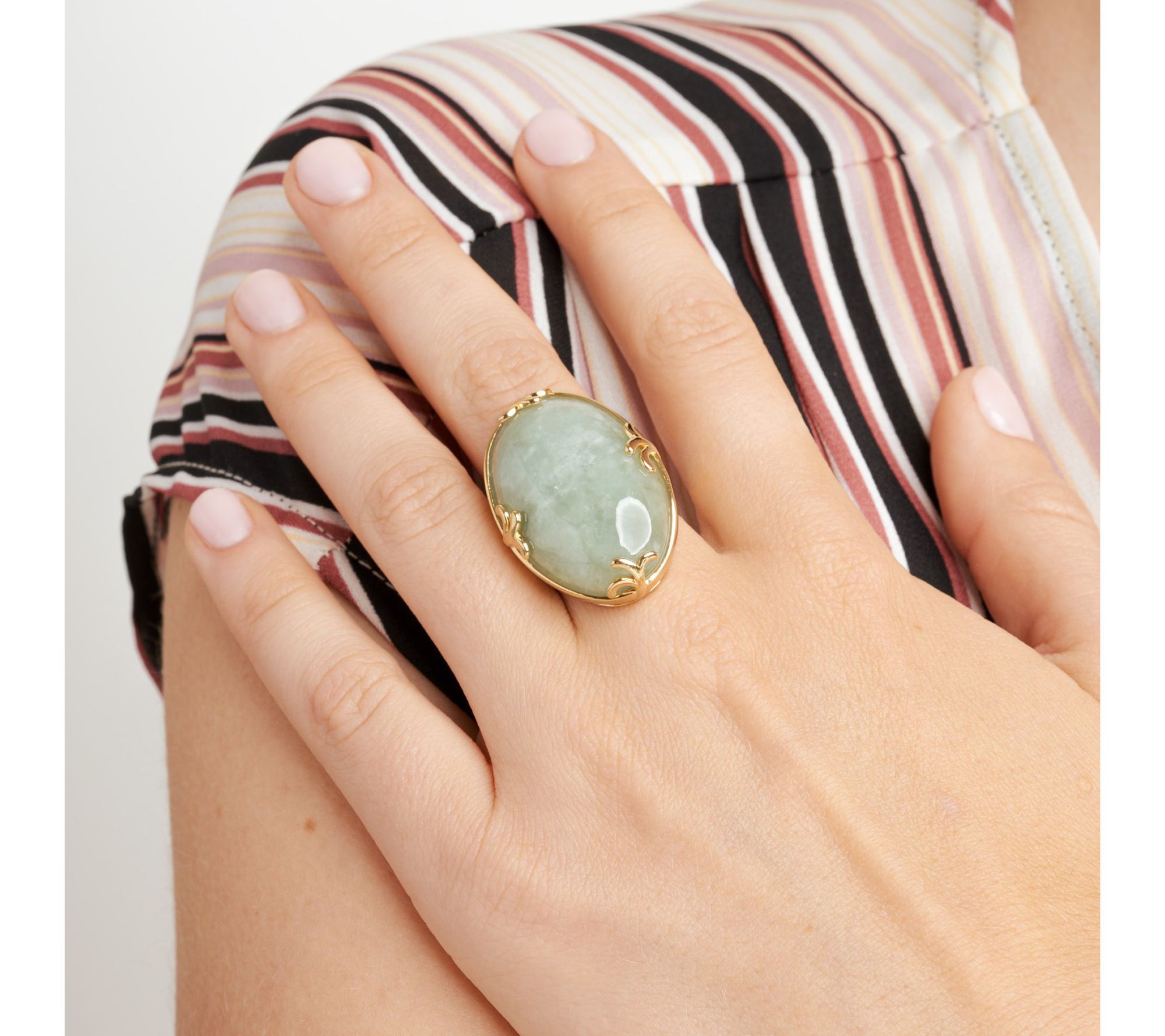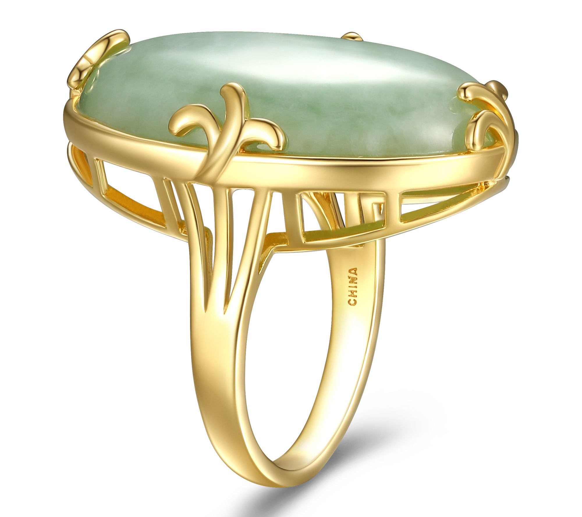 A night out or an important event becomes unforgettable as you display the sophisticated glow of this cocktail ring. An oval-cut green jade centerpiece set in gleaming 18K gold-plated sterling silver creates an elegant accent that instantly draws attention. From Dynasty Jade.