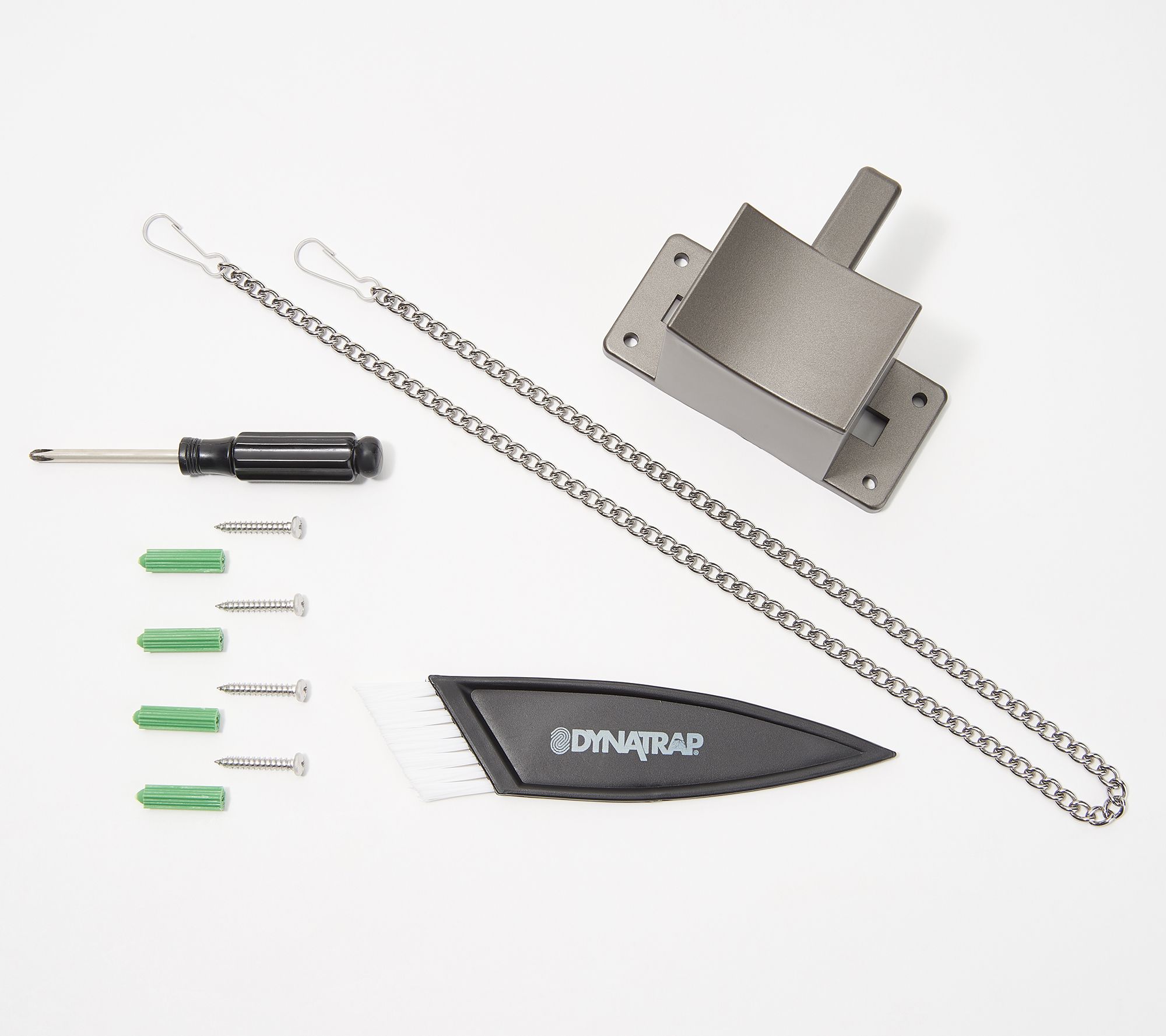 Includes DynaTrap XL insect trap, one installed Ultraviolet bulb, one additional Ultraviolet bulb, two Atrakta lures, hanging hardware, and bracket