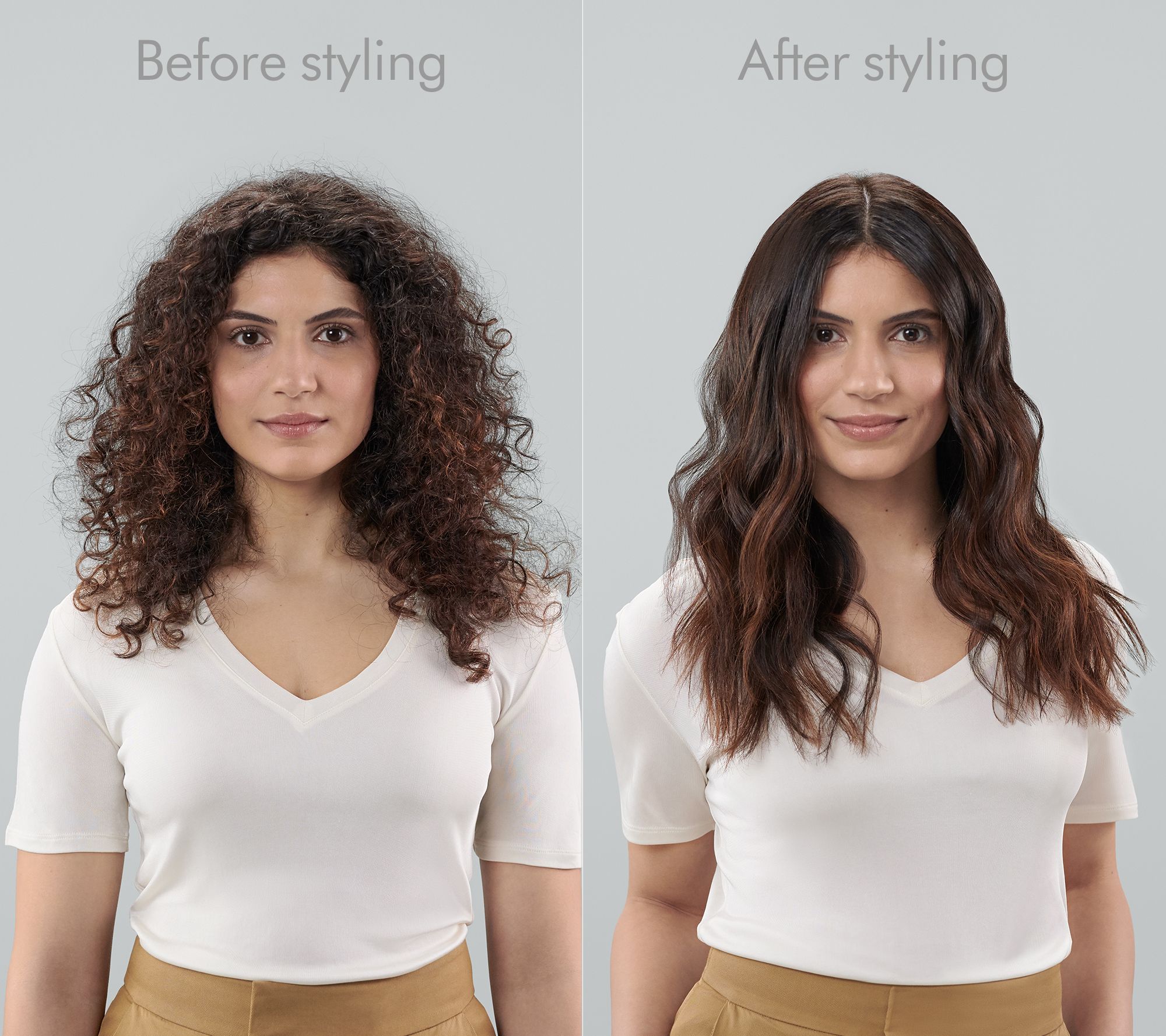 How do I use it: Before styling, ensure hair is detangled and completely dry. For best results, section hair. Begin at medium heat (365F) and adjust up or down depending on your hair type and texture. The flexing plates shape to gather your hair, letting the machine do the work for you. Ensure your hair is in the middle of the plates when styling. The perfect tress size will depend on your hair type. Try a few different section sizes and see what works best for you.