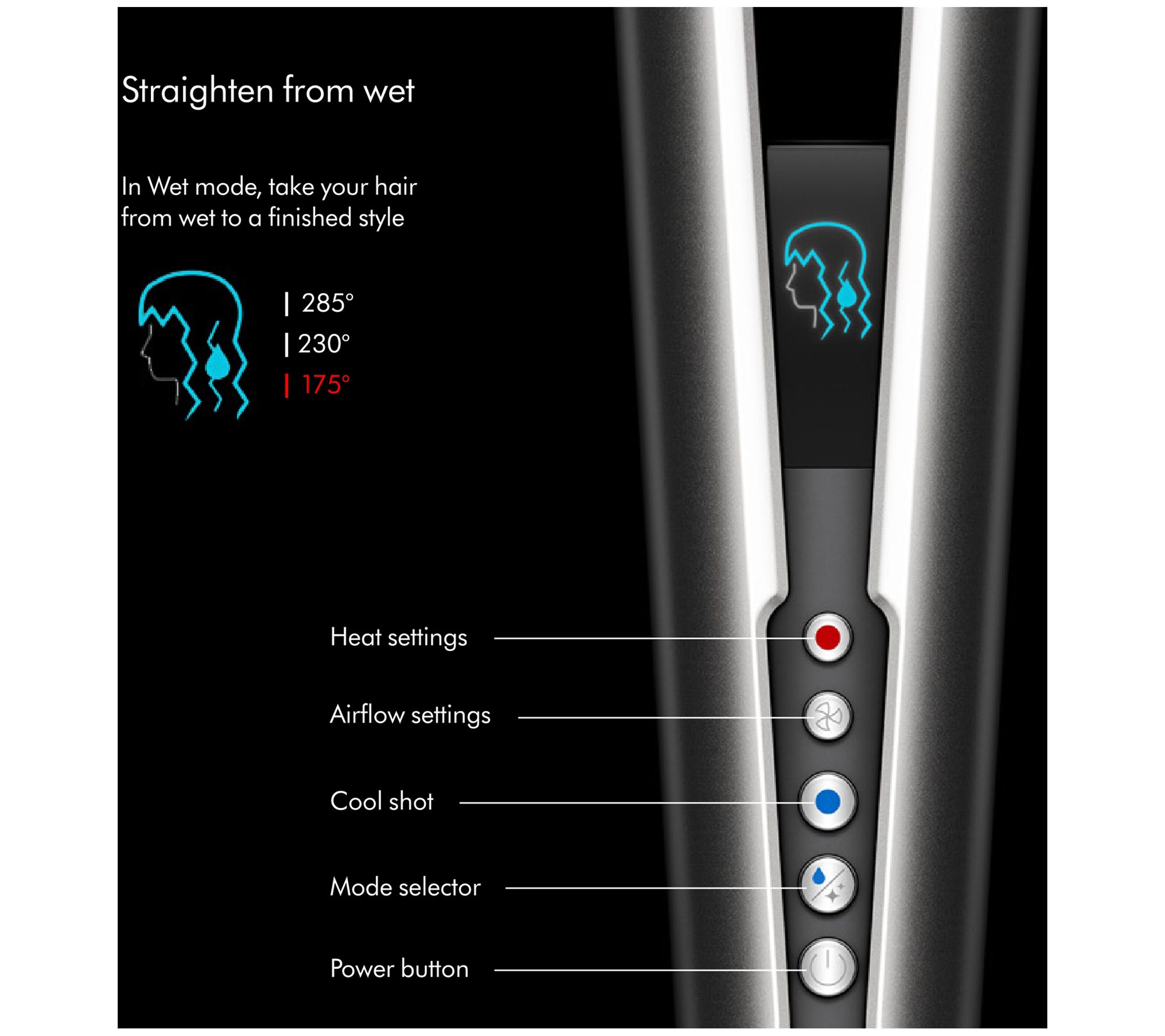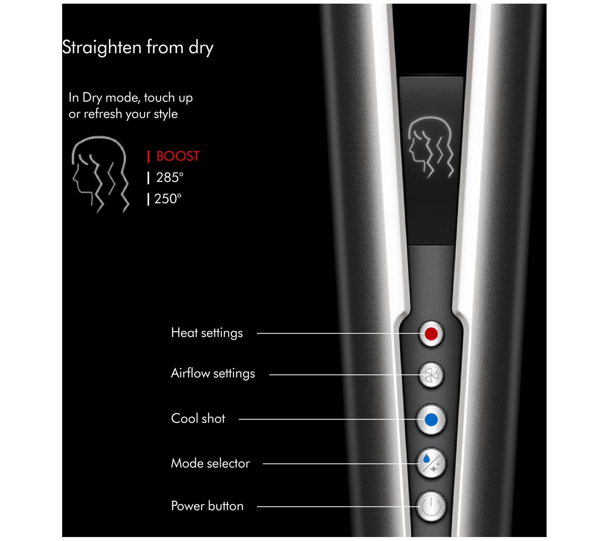 If straightening from dry, select dry mode to touch up and refresh your style. Select desired temperature and airflow. Set style with cool air.