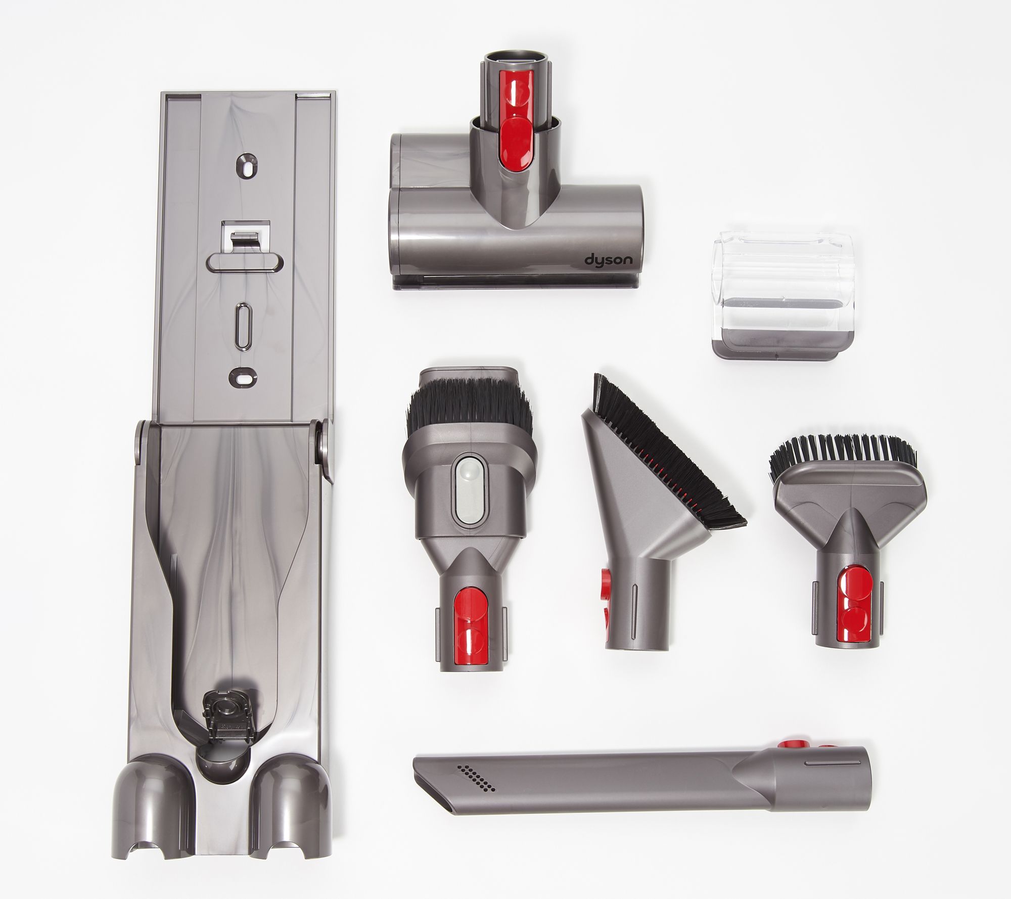 Includes V11 Torque Drive cordfree vacuum, wall docking station, charger, Dynamic Load Sensing torque drive cleaner head, combination tool, crevice tool, mini motorized tool, and stiff bristle brush