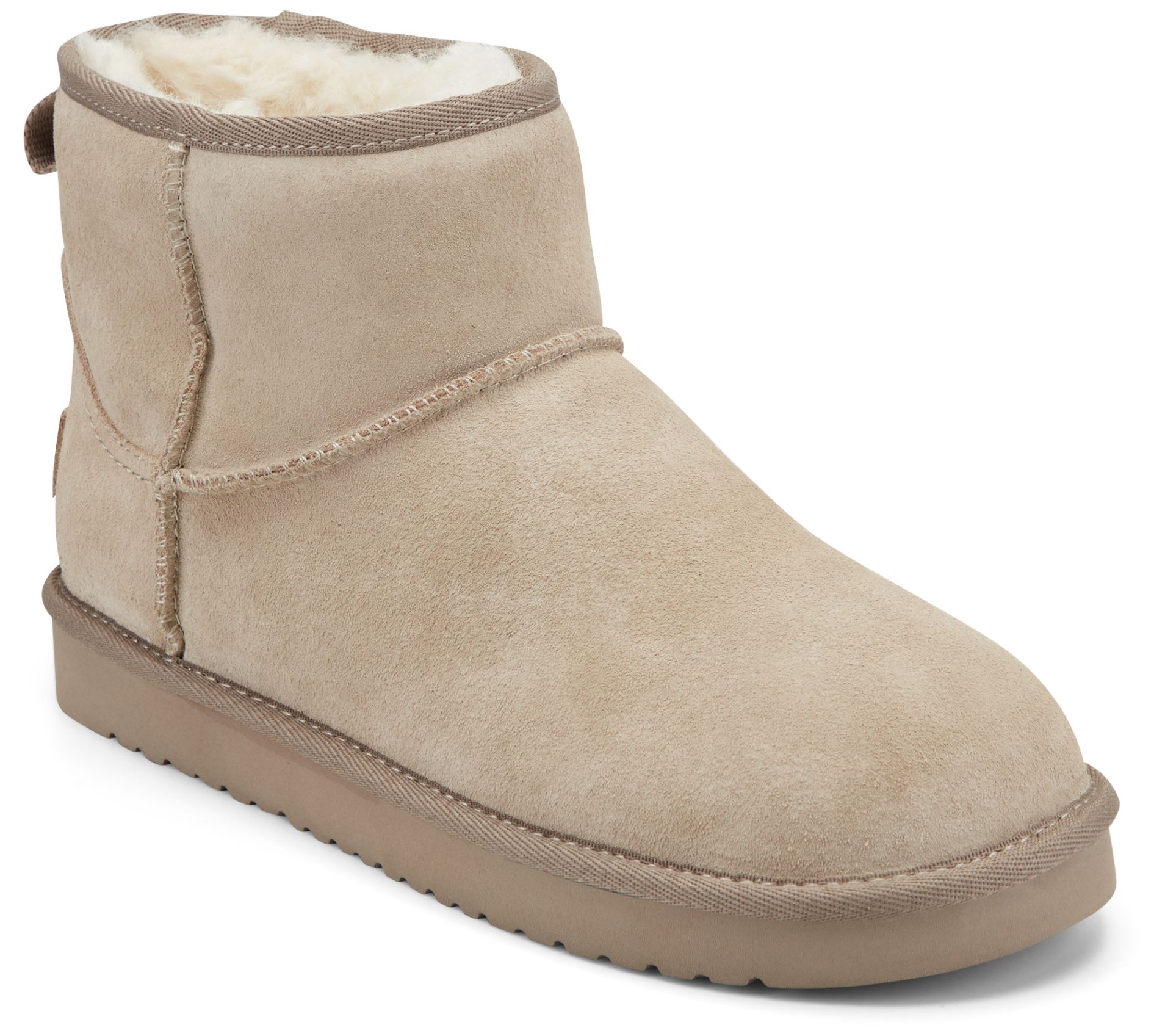 Suede upper, stitching details at ankle with seam, back tab for pull-on styling