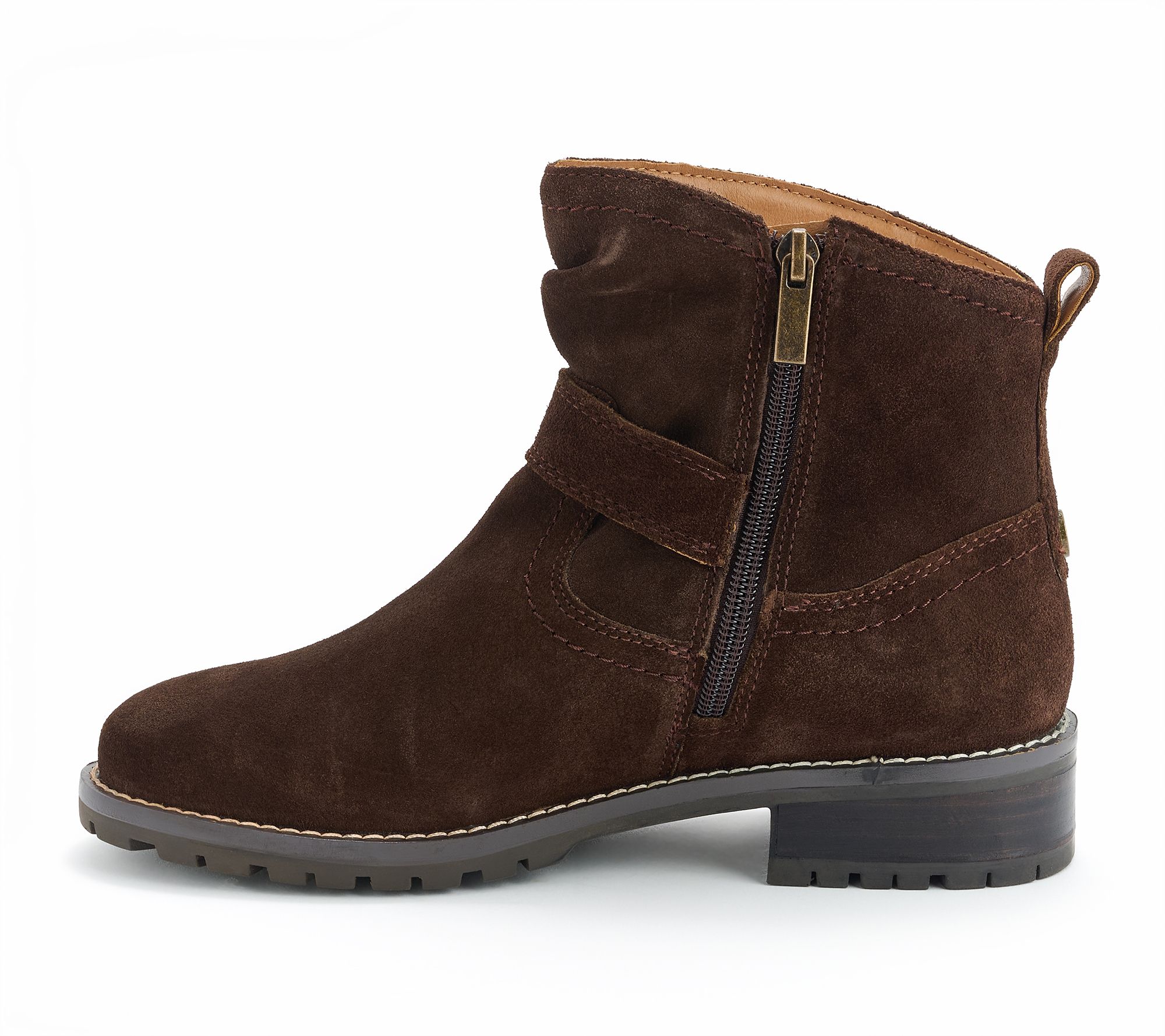 Slouchy suede upper, inside zipper, buckle detail, round toe