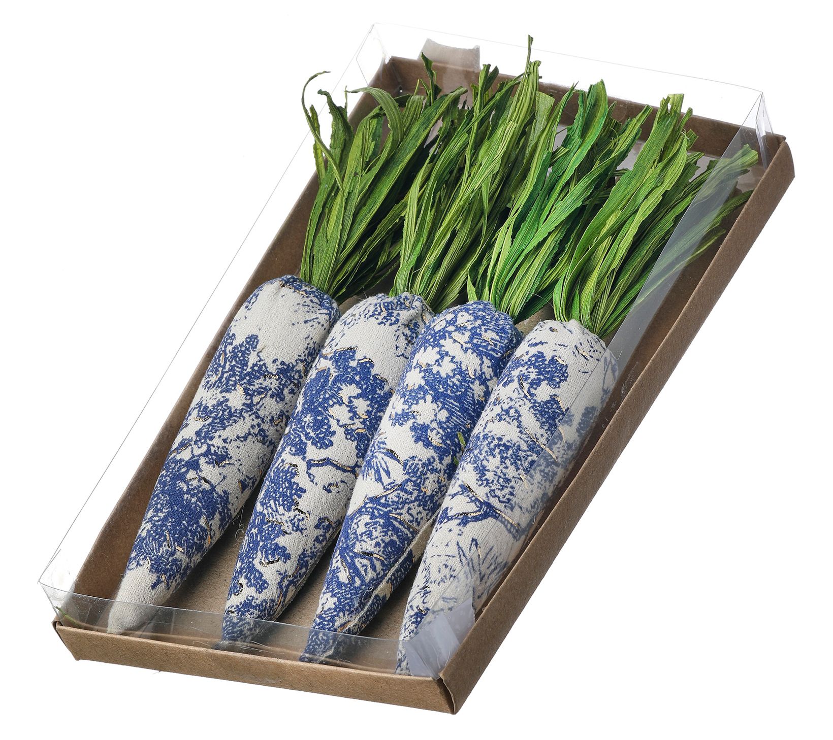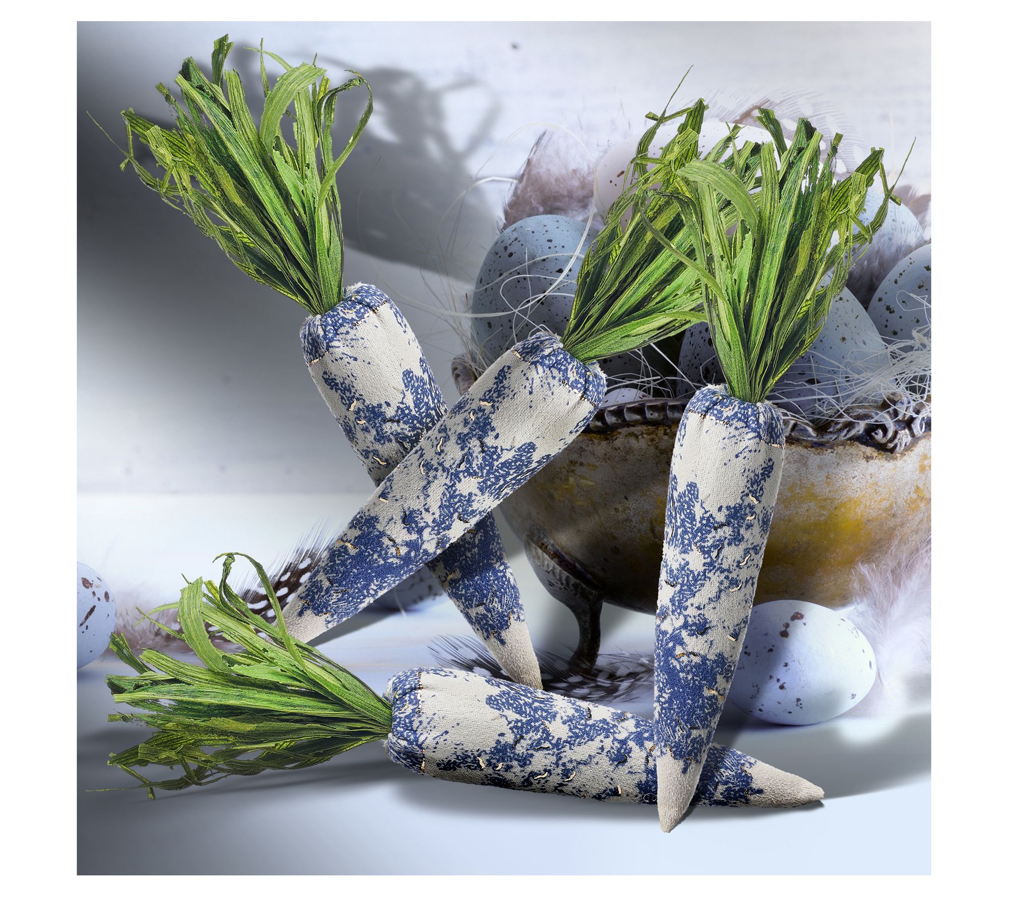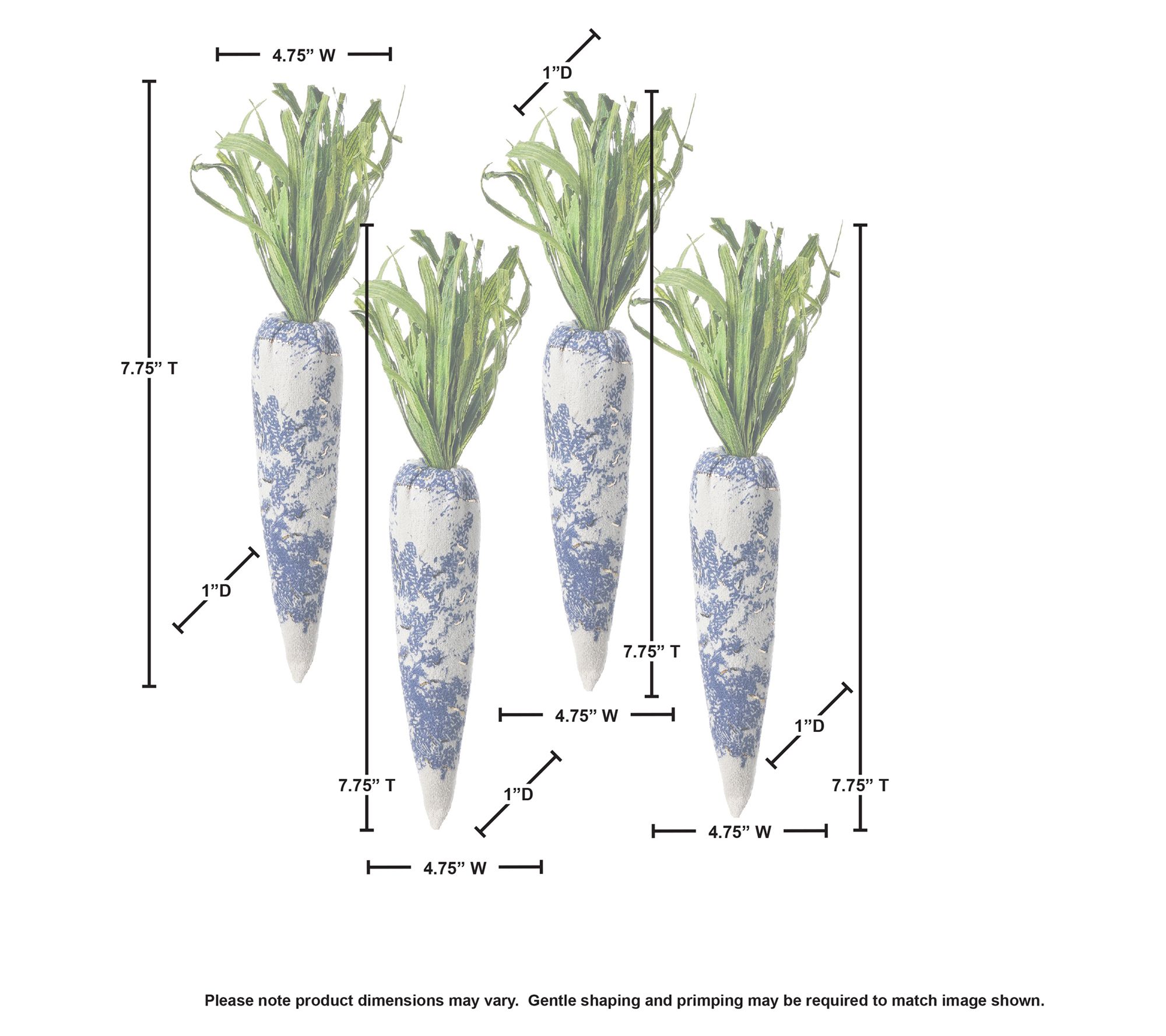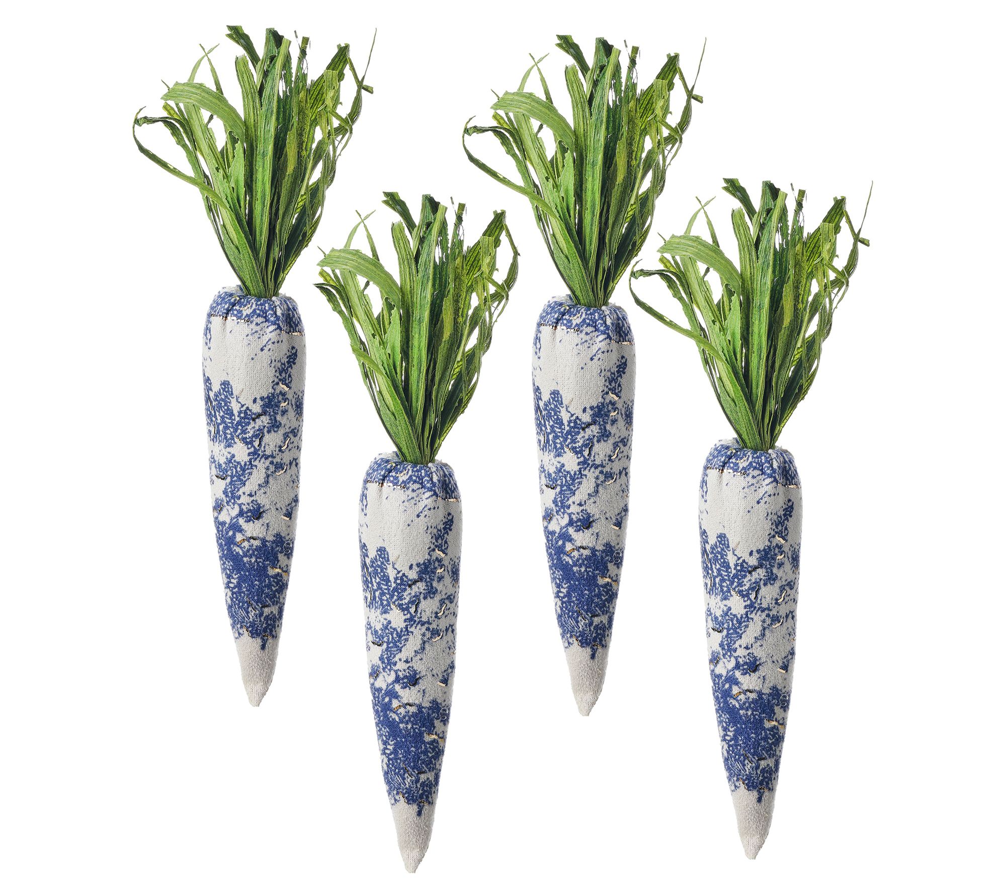 Harvest a fresh batch of charm for your springtime display with this set of eight carrots, each featuring a blue and white chinoiserie design accented by green corn husk tops. From the Valerie Parr Hill Collection.
