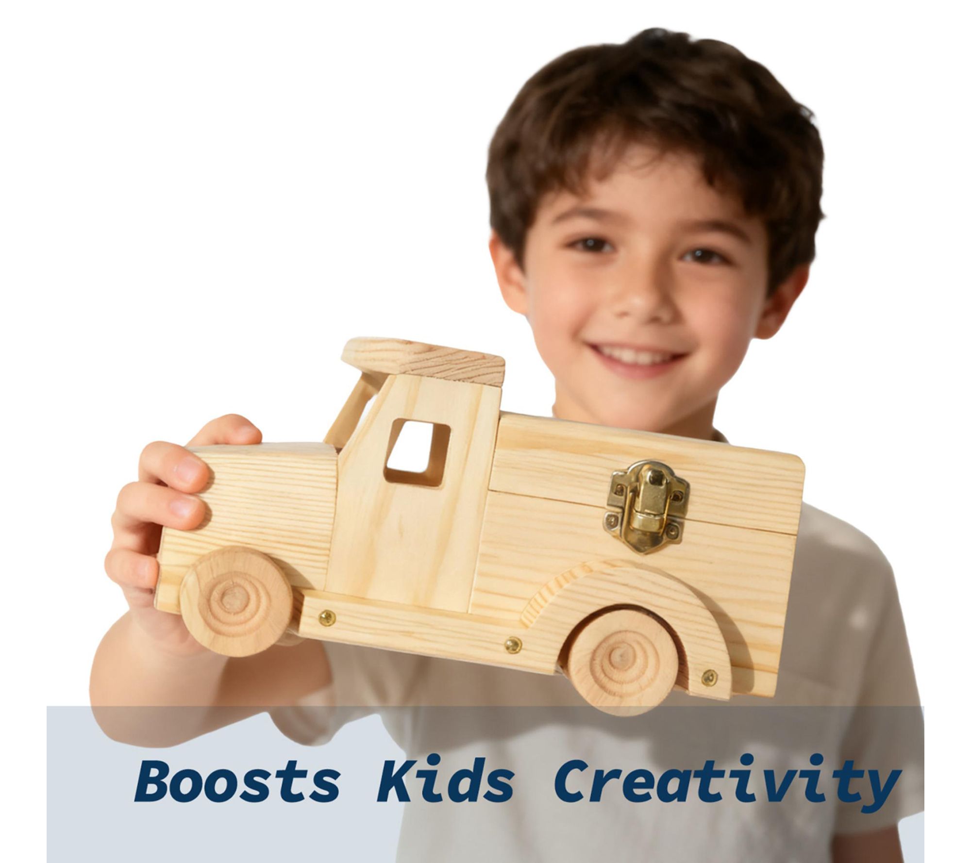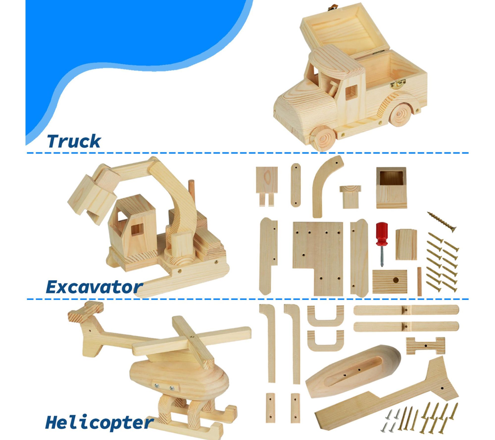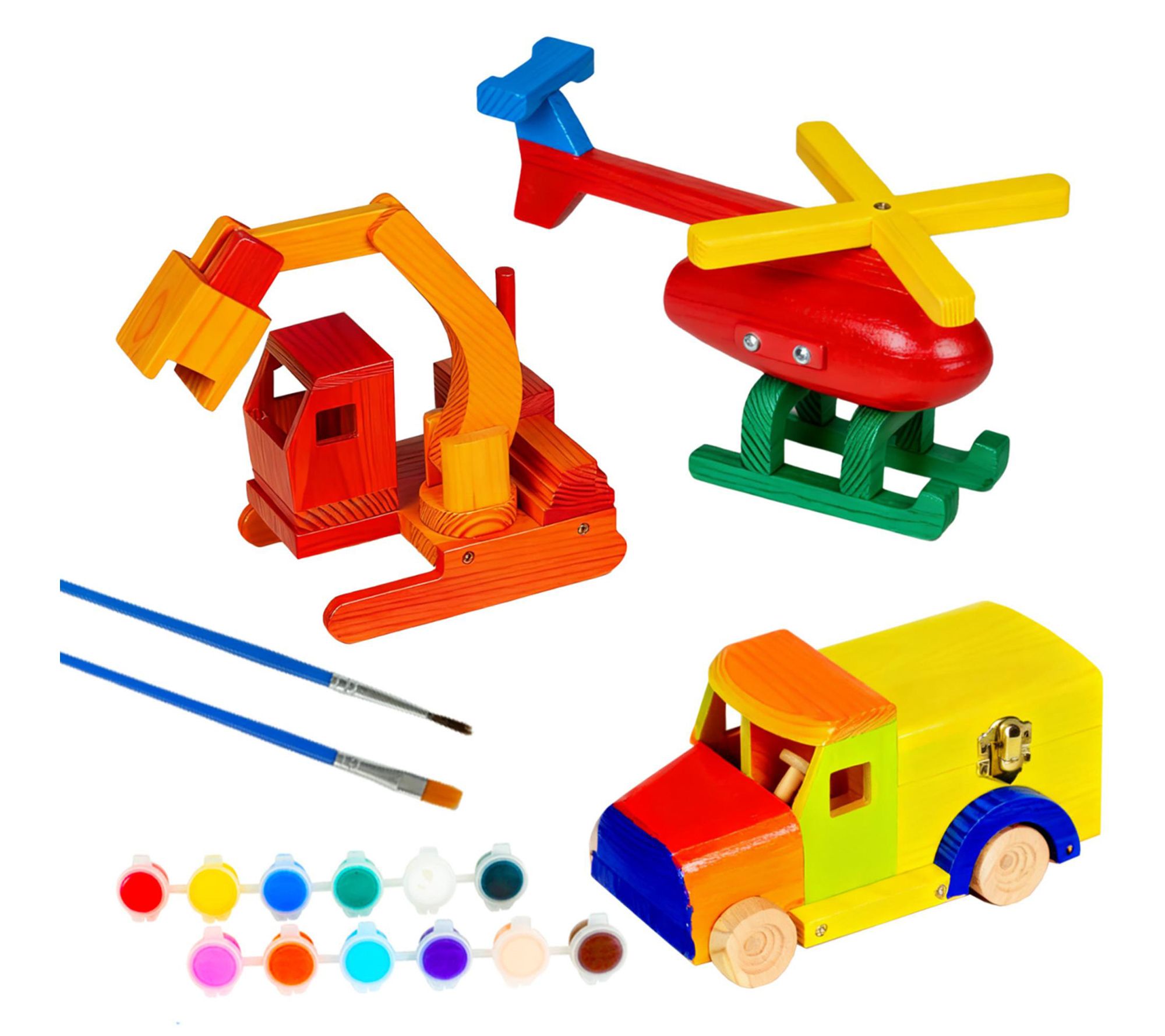 • Includes three wooden vehicles, 12 tempera paints, two brushes, mini screwdriver, screws, wood pieces