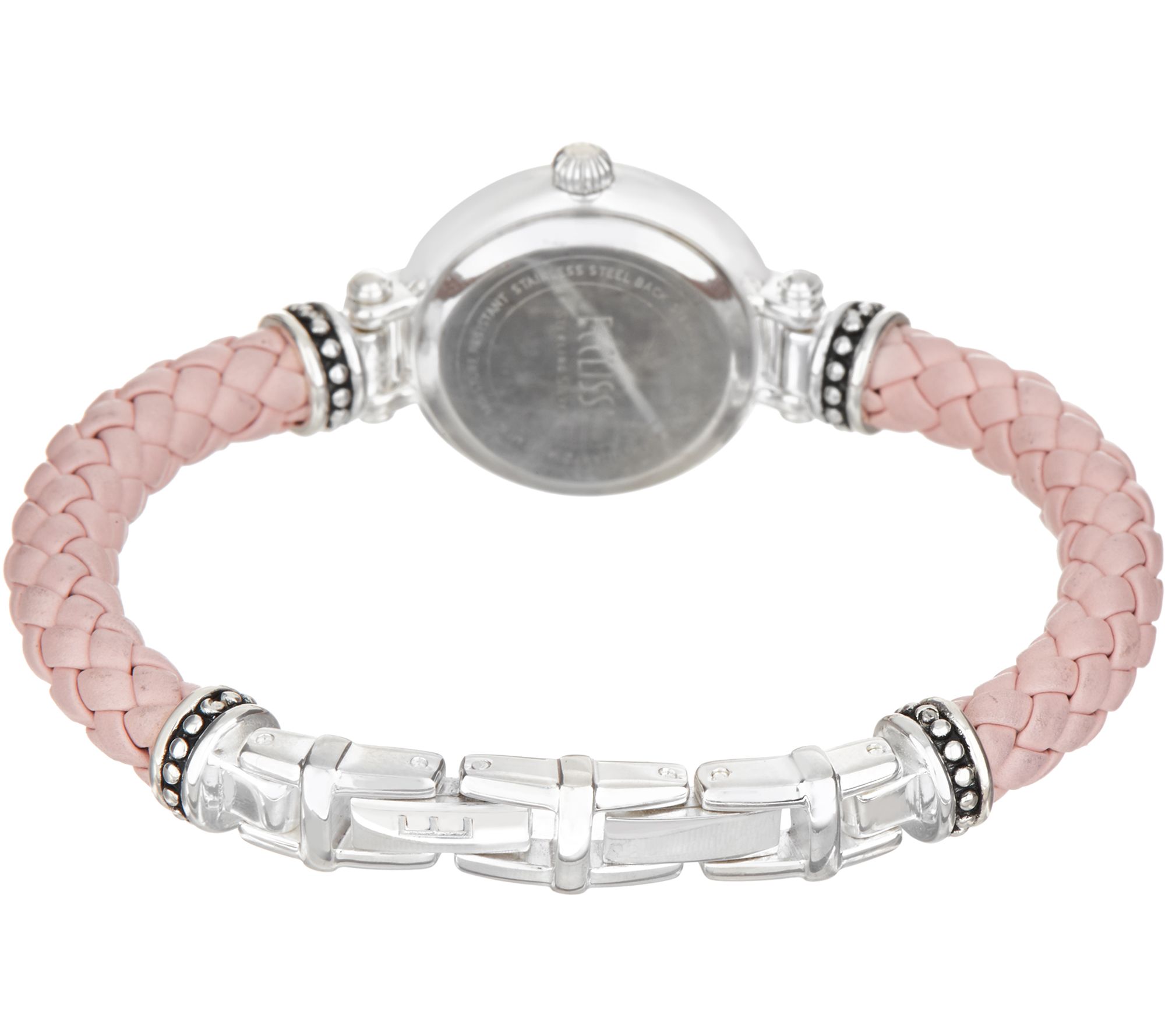 An oxidized sterling silver case with a beautifully beaded halo sits atop a stately braided leather band. From Ecclissi.
