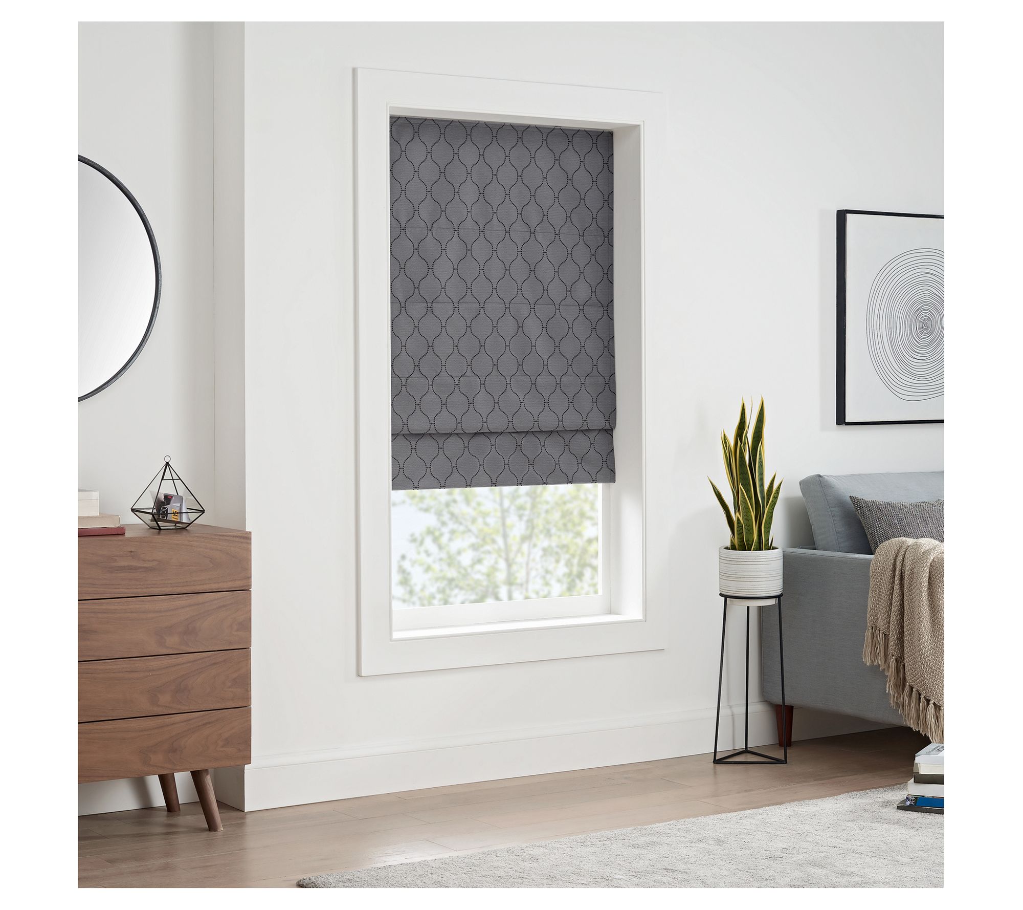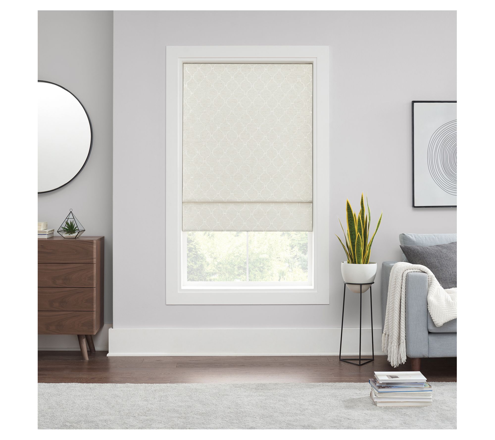 Bring style and sophistication into your space with help from this Darien cordless blackout Roman shade. Not only does the fabric look beautiful, it also helps block out light for enhanced privacy. From Eclipse.