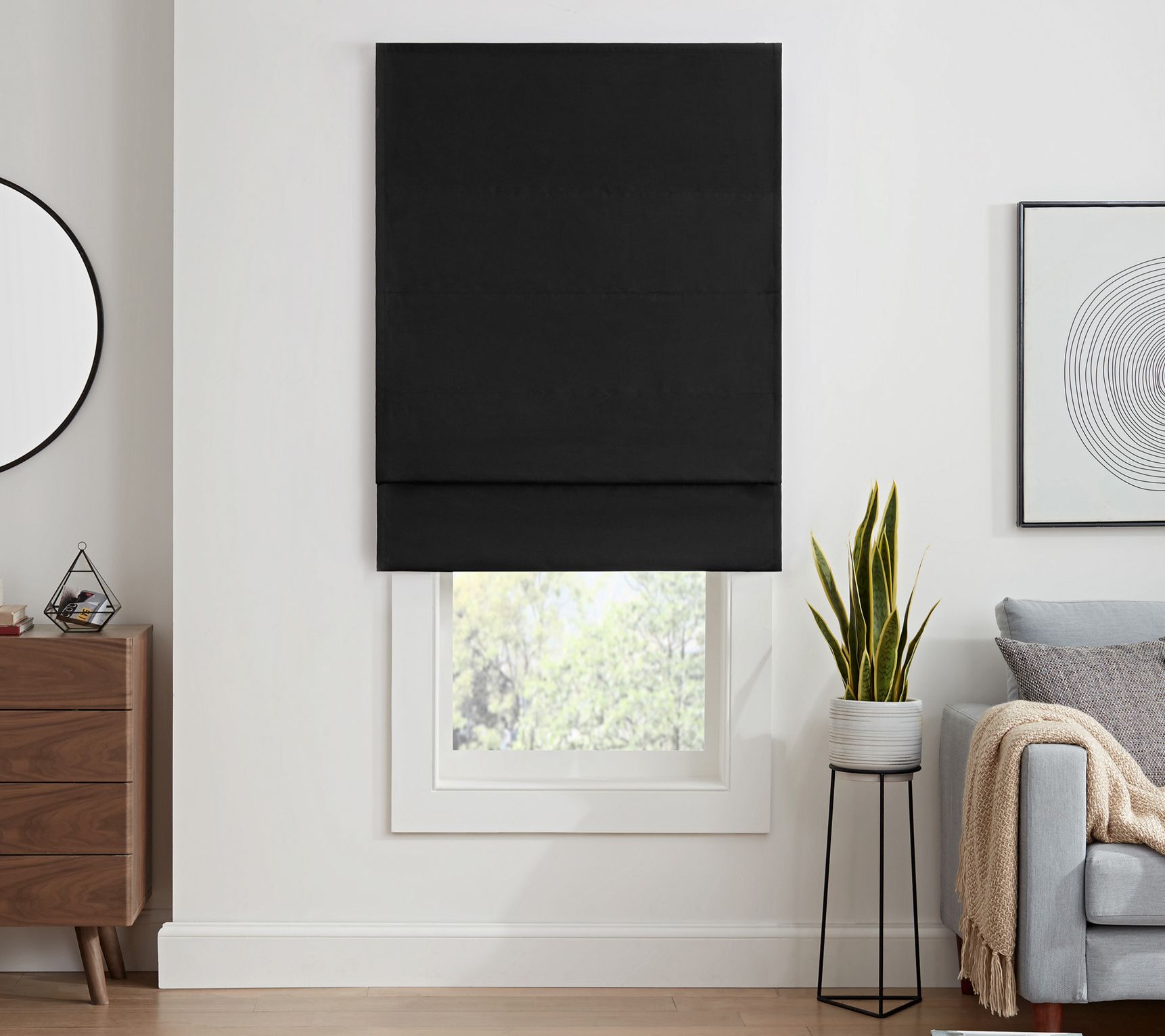 Designed to darken any room, this black out Roman shade blocks incoming light and provides privacy. The chic and sleek look is cord free--so no fretting over knotty messes. From Eclipse.