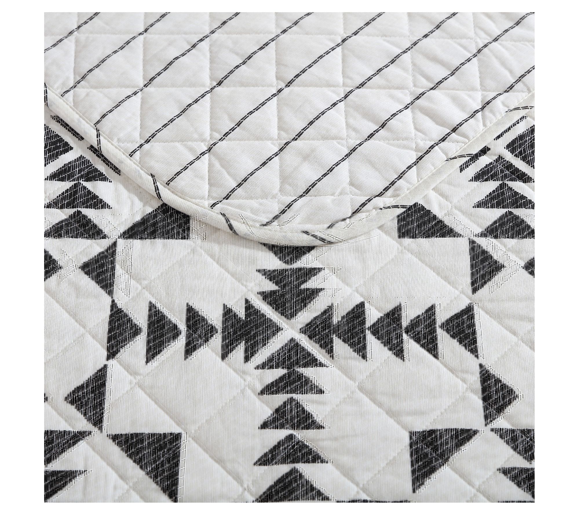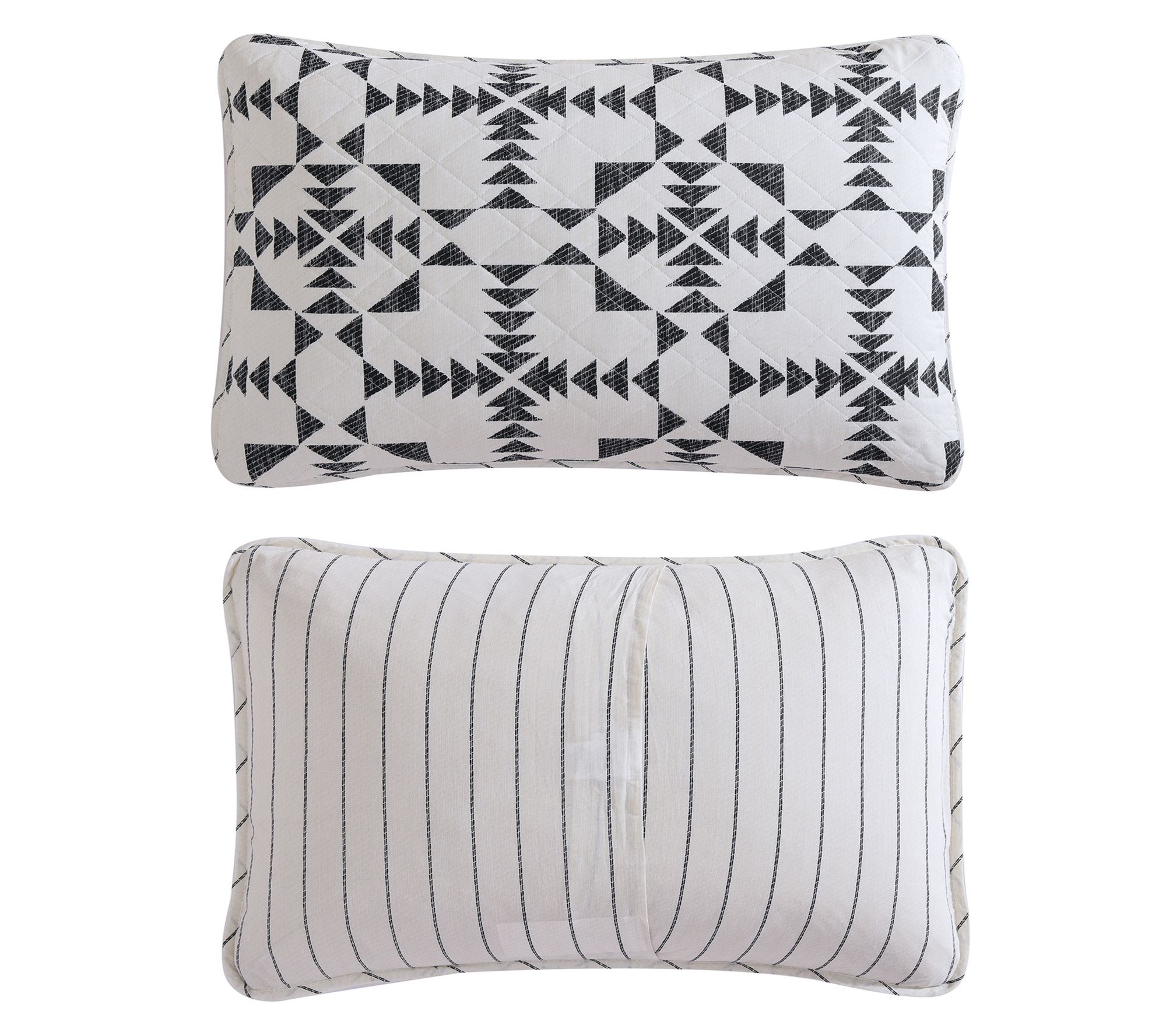 Bring the spirit of the American west into your bedroom with the Eddie Bauer Arrowhead quilt and sham set. Featuring iconic Southwest triangle motifs in charcoal on an ivory background, this set adds a touch of rugged charm to your decor. The quilt reverses to a modern charcoal pinstripe, offering versatile styling options. From Eddie Bauer.