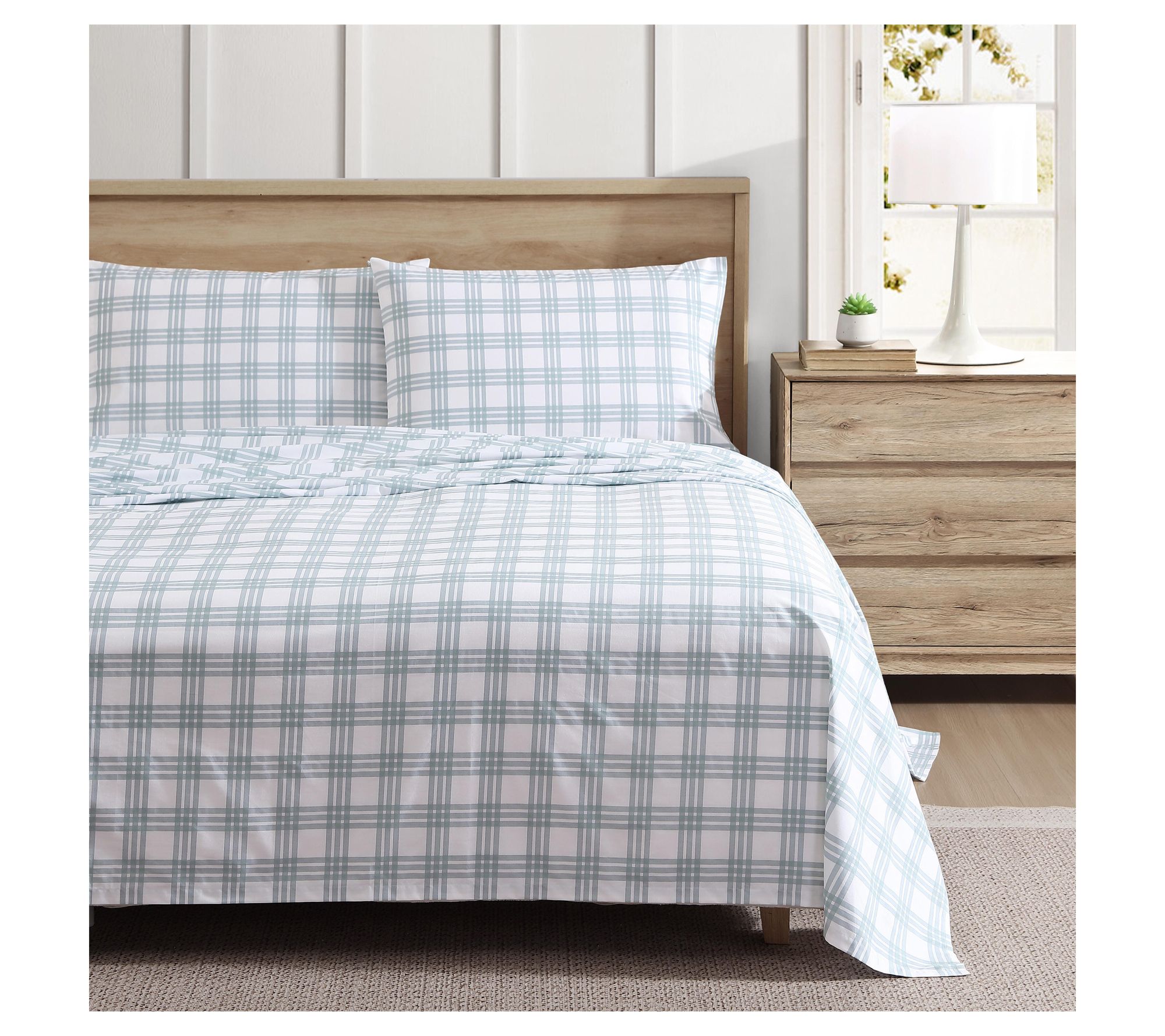 Transform your bedroom into a cozy retreat with this charming sheet set featuring a subtle plaid design that effortlessly complements any decor. The crisp cotton ensures your bedding stays cool and comfortable through the night. From Eddie Bauer.