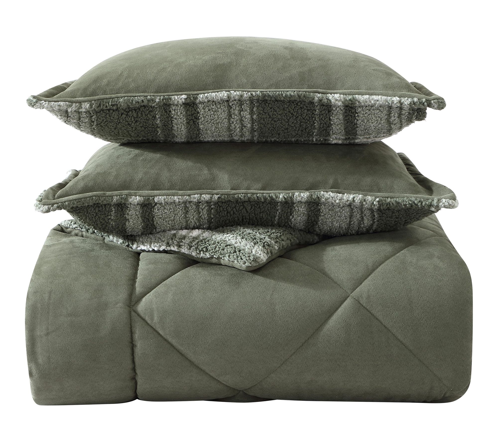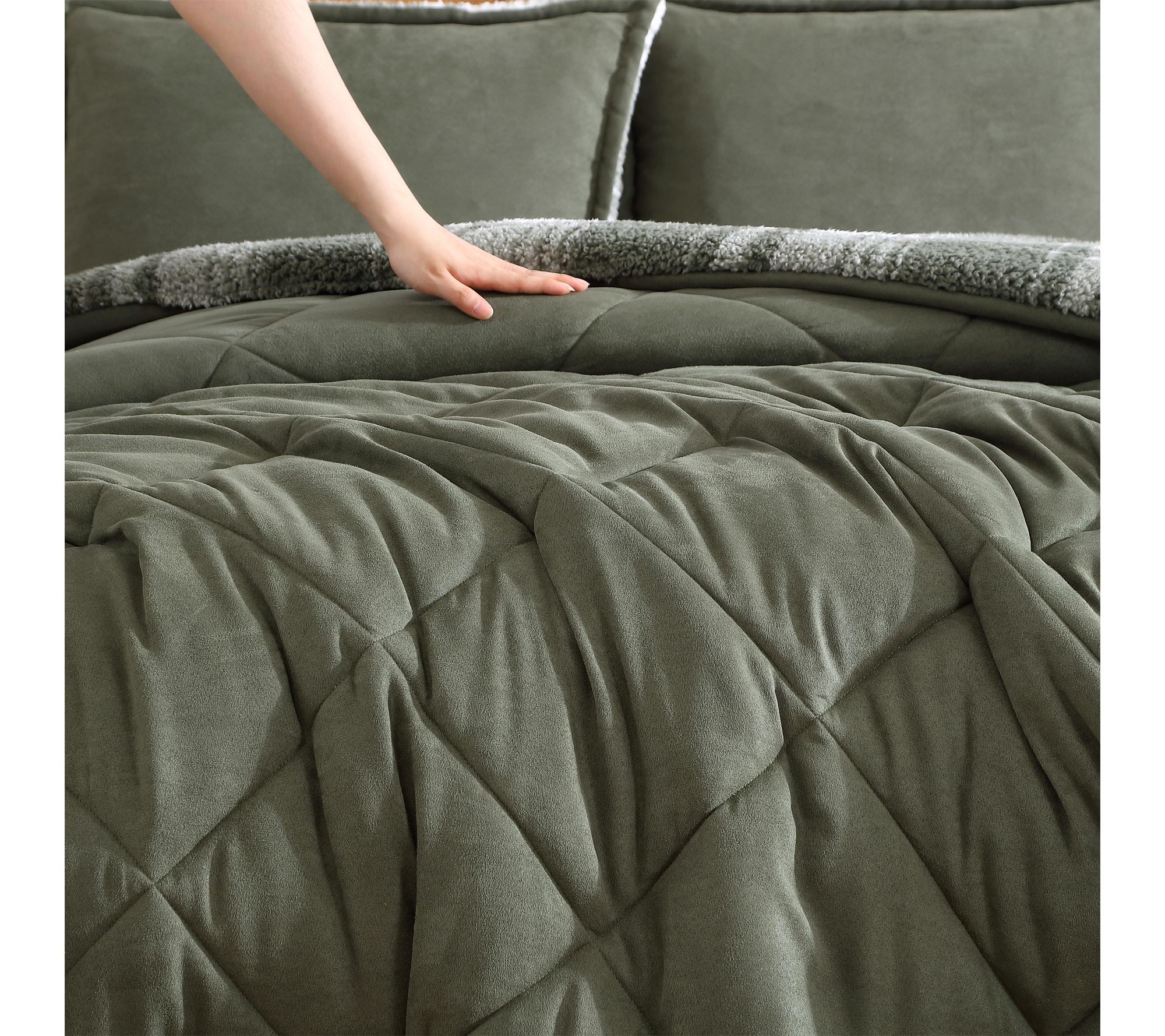 Settle in for a cozy escape as this comforter set brings the inviting charm of a cabin retreat to your bedroom. The rich green micro-suede face reverses to ultra-plush faux shearling, wrapping you in warmth through chilly nights. Plush comfort, timeless style, and effortless care blend seamlessly for everyday relaxation from Eddie Bauer.
