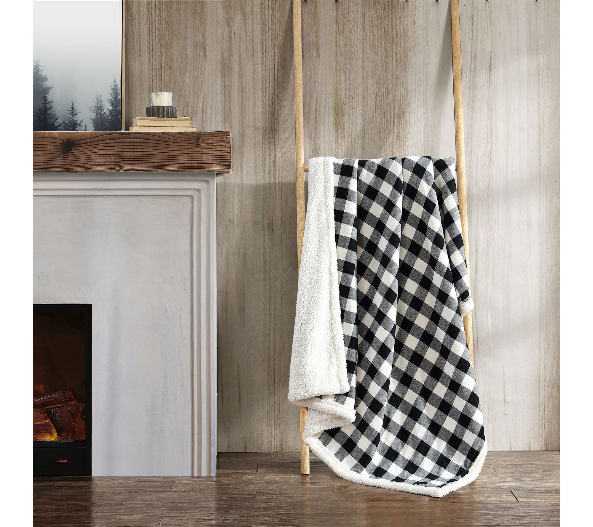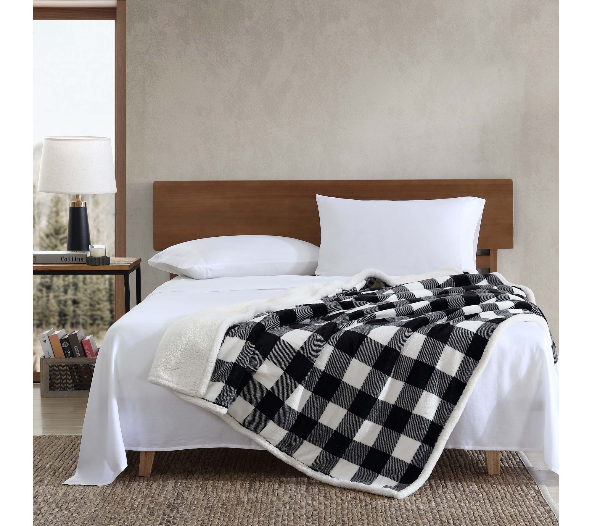 • Iconic cabin plaid on one side; reverses to faux shearling popcorn fleece for added warmth