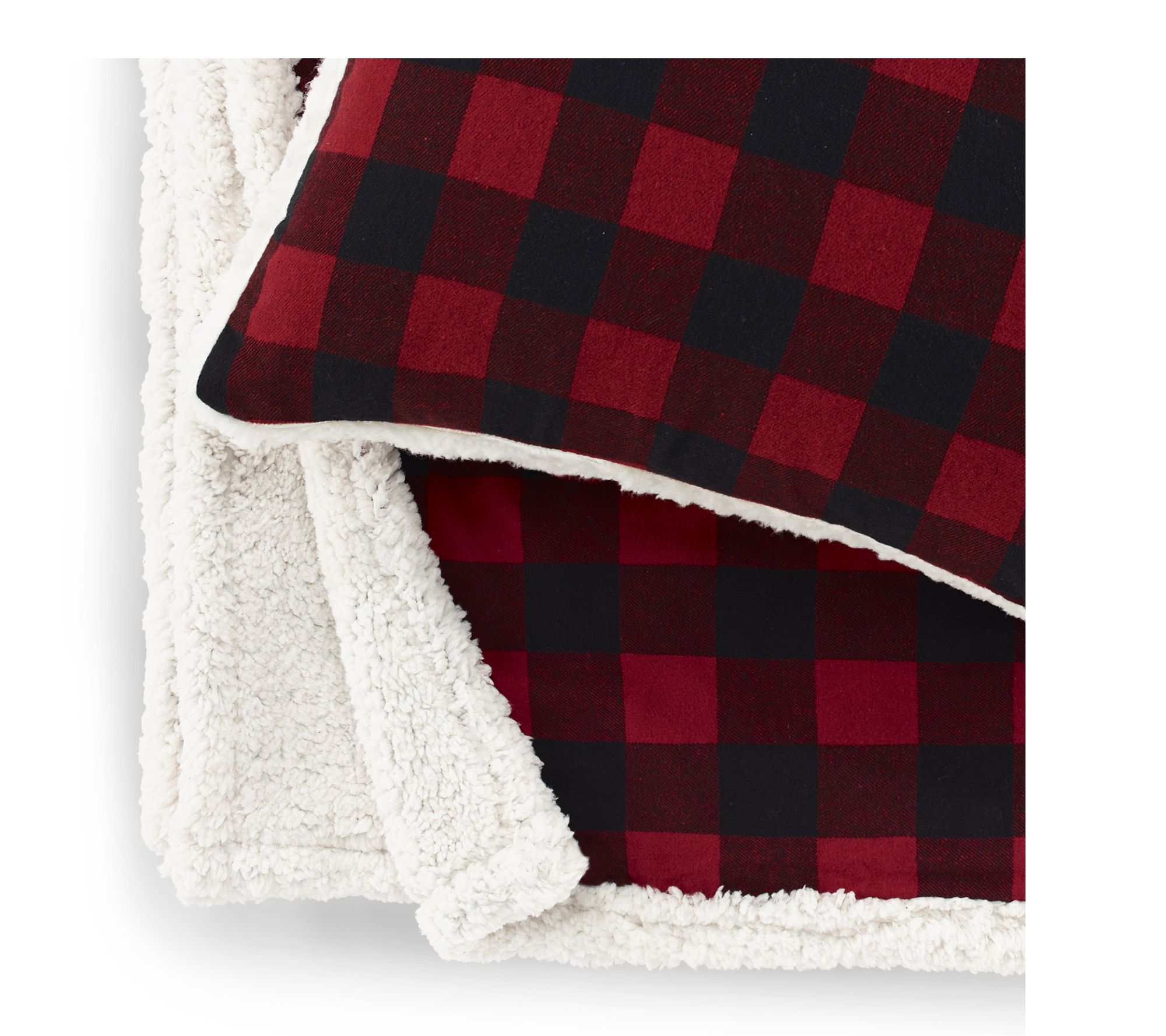 Transform your living room or bedroom into a cozy retreat with this throw and pillow set, featuring a classic cabin plaid design in rich red and black hues. Plush sherpa-style fleece and soft cotton offer warmth and comfort, making every evening spent curled up with a book or movie feel extra inviting. From Eddie Bauer.