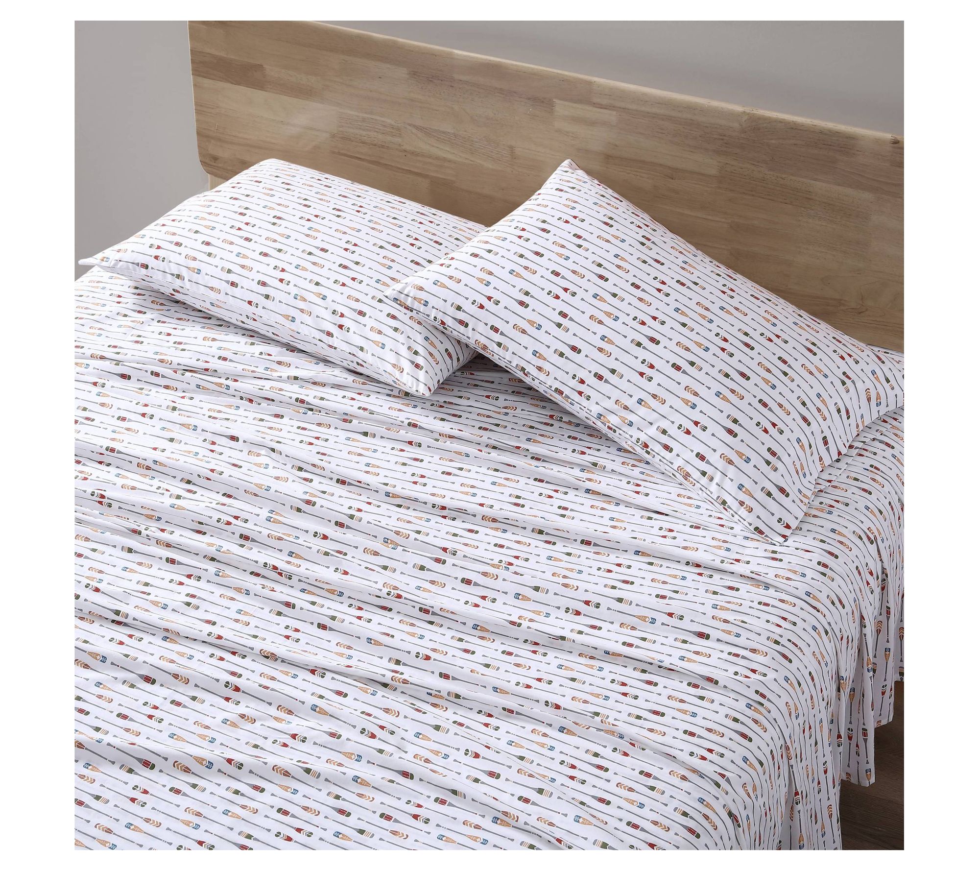 A gentle update for your bedroom retreat, this king cotton sheet set invites cozy relaxation with playful canoe and paddle prints that inspire memories of lakehouse escapes. The crisp percale grows softer over time, making every night's sleep feel a bit more comforting. From Eddie Bauer.