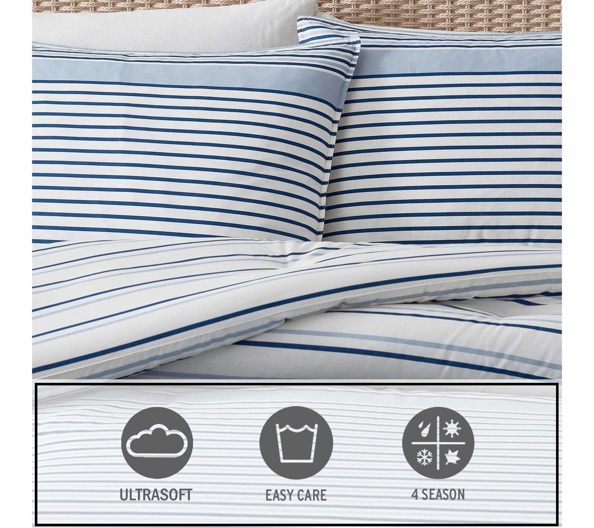 Create a relaxing retreat with this twin comforter set that transforms your bedroom with subtle, muted blue stripes and inviting softness. Enjoy easy-care comfort all year long, thanks to a cozy down alternative fill and a two-piece closure on the sham that keeps things neat and tidy. From Eddie Bauer.