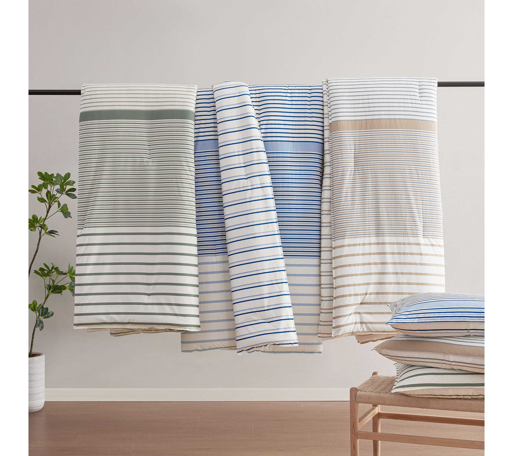 Cozy evenings start with the Eddie Bauer Cooper Stripe comforter set -- a soft cotton layer that brings classic stripes and year round warmth to your bedroom retreat. Its down alternative fill and tailored shams create an inviting space for restful nights, while the easy care design lets you focus on relaxation. From Eddie Bauer.