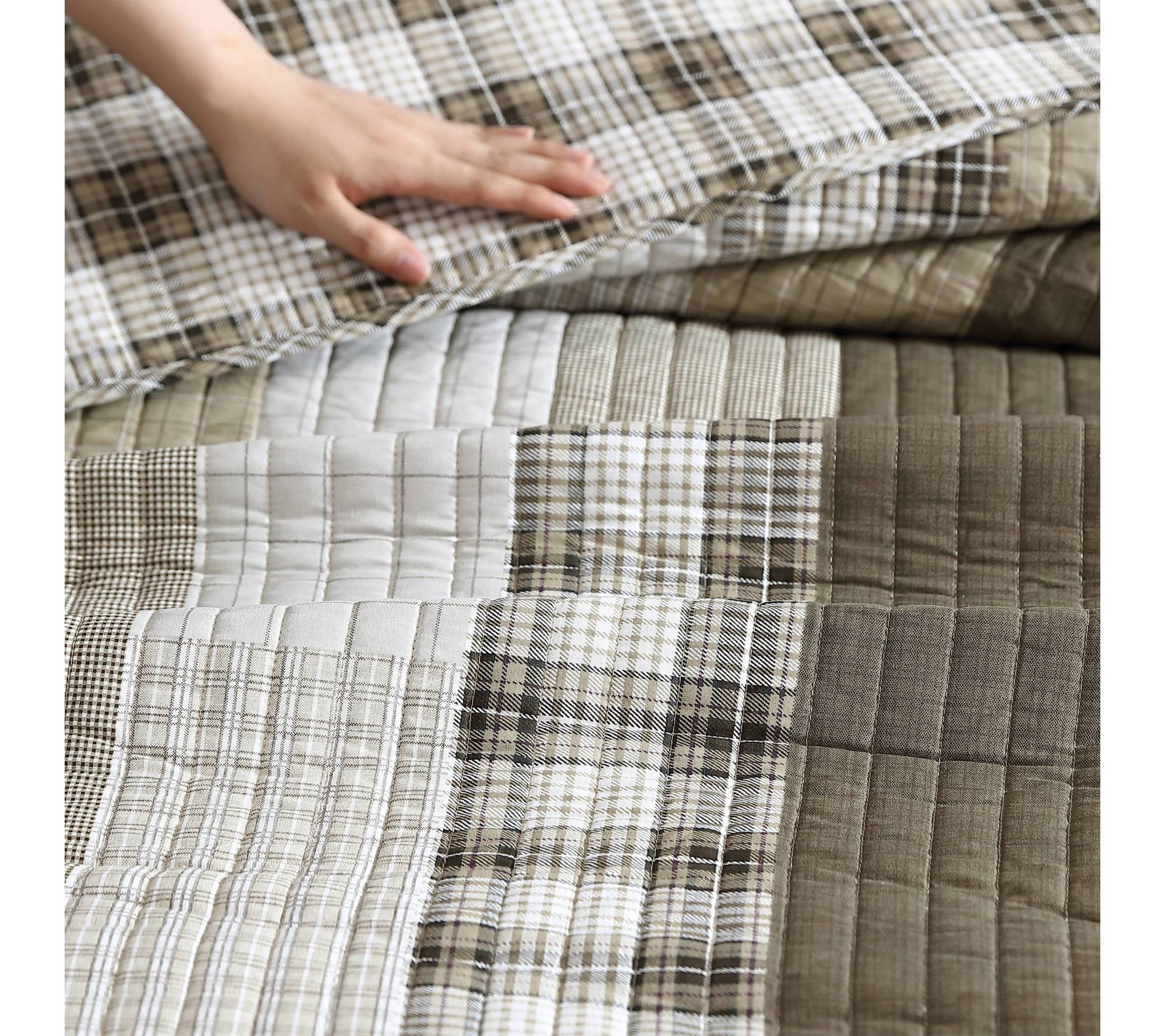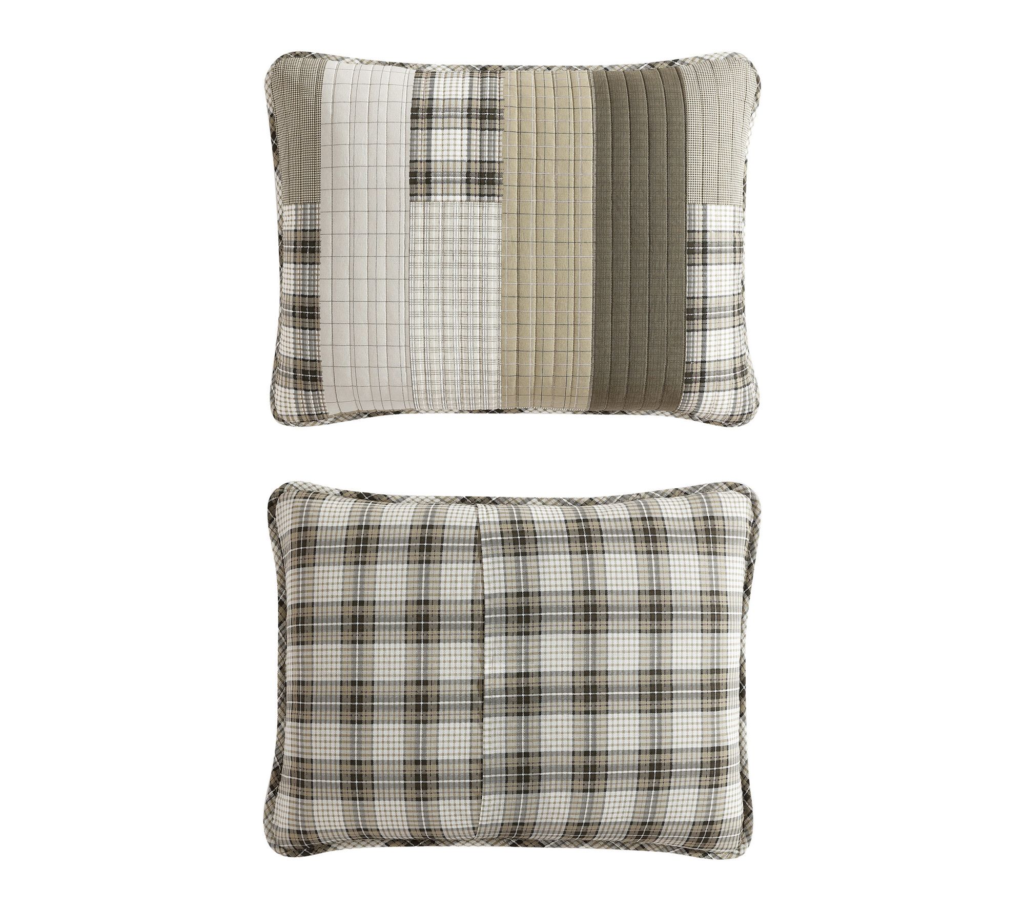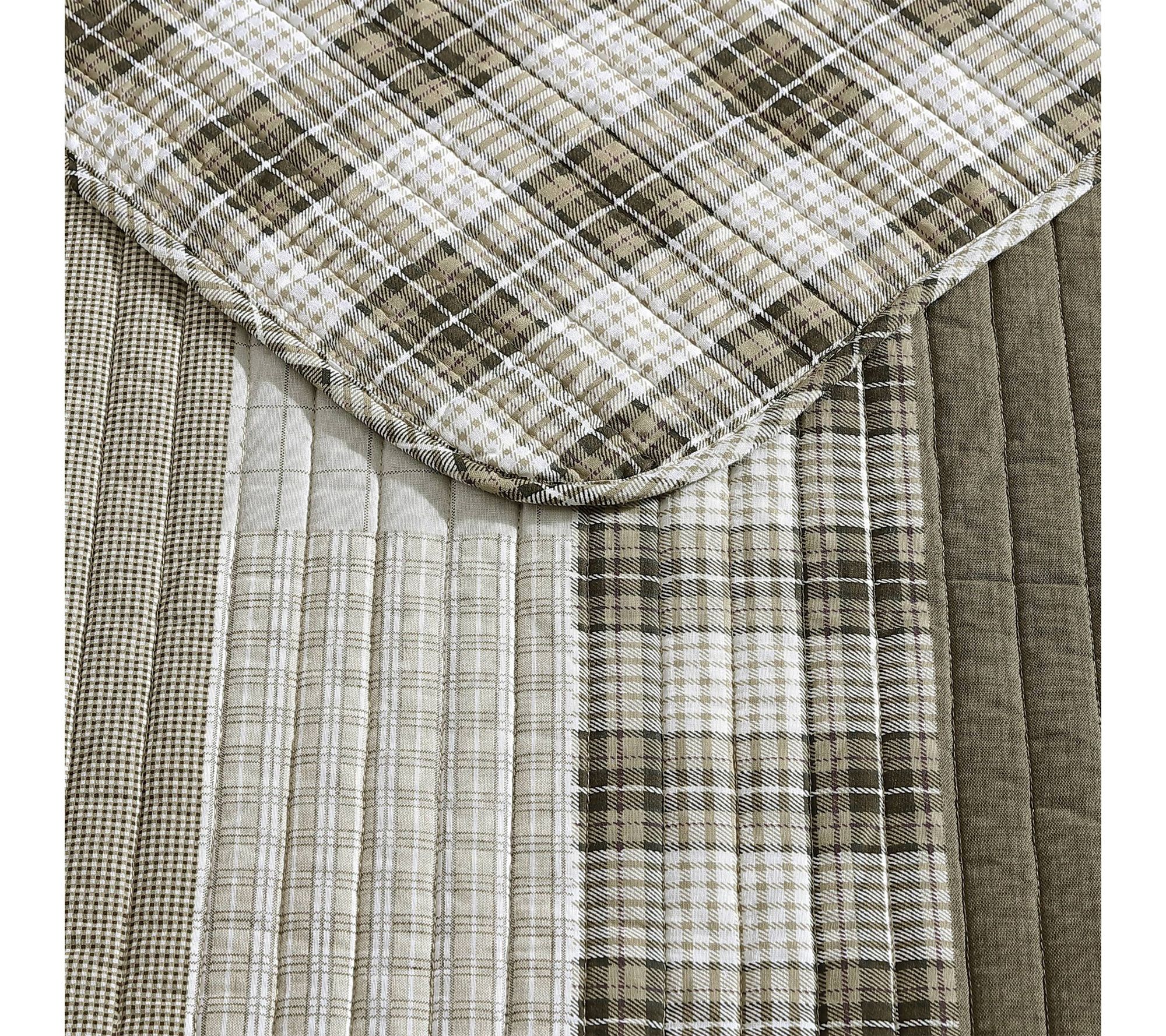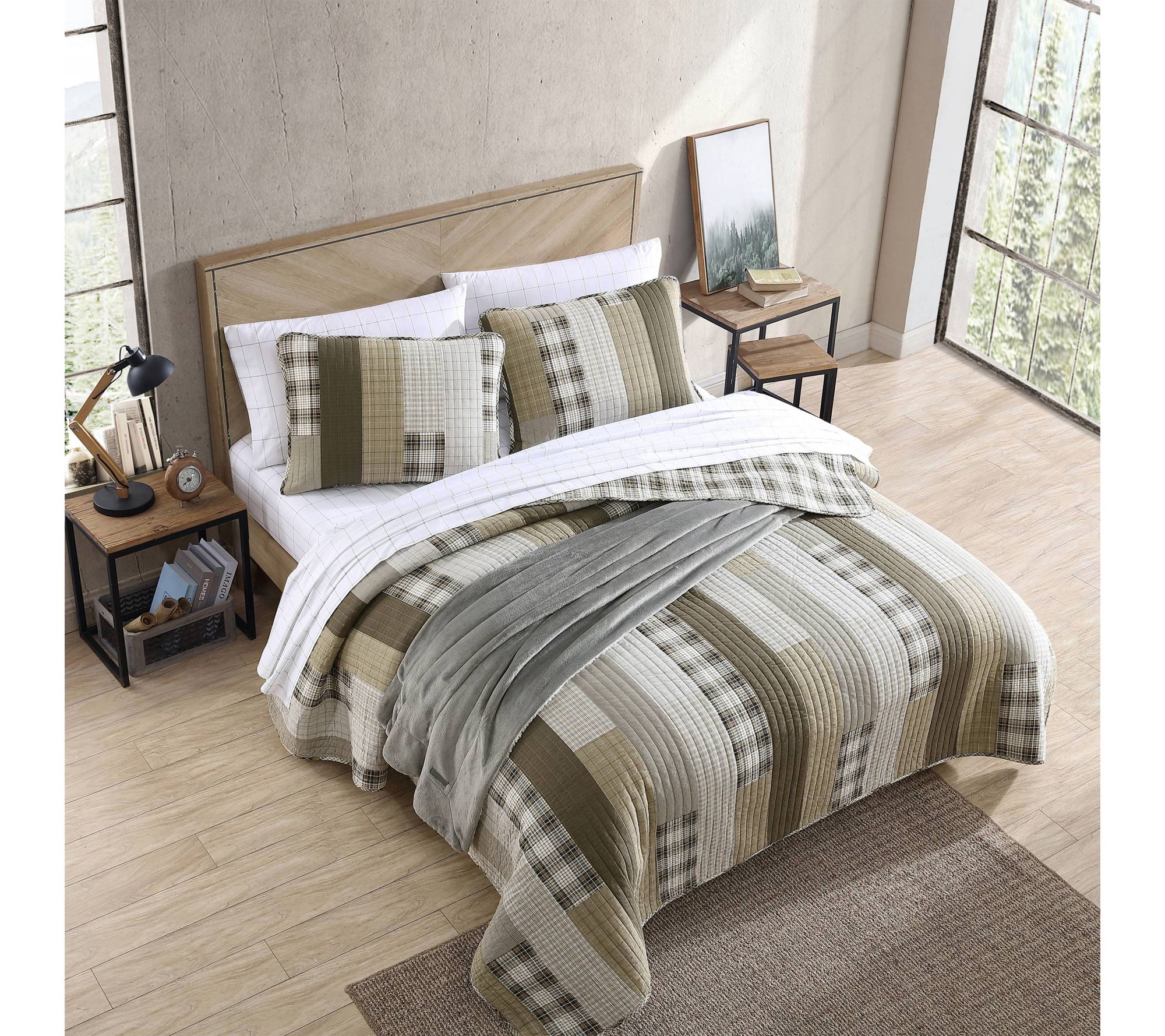 Soft, inviting, and endlessly versatile, this quilt set wraps your bed in cozy comfort thanks to its lightweight warmth and gentle texture. A sophisticated patchwork pattern in khaki and ivory flips to modern gingham for a fresh look whenever you feel like changing things up. Rounded corners and thoughtful channel quilting add detail while the included shams complete your space. From Eddie Bauer.