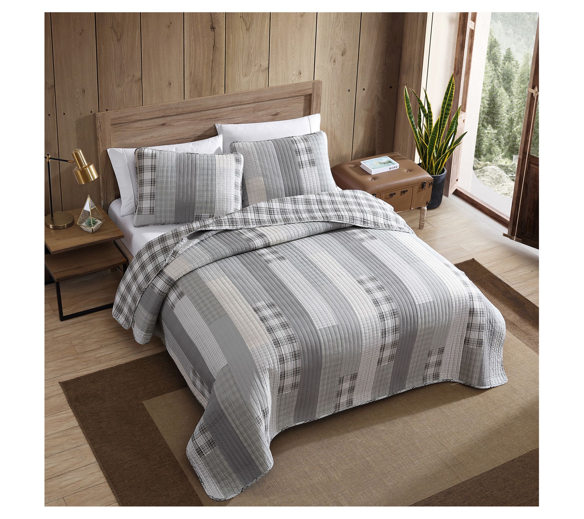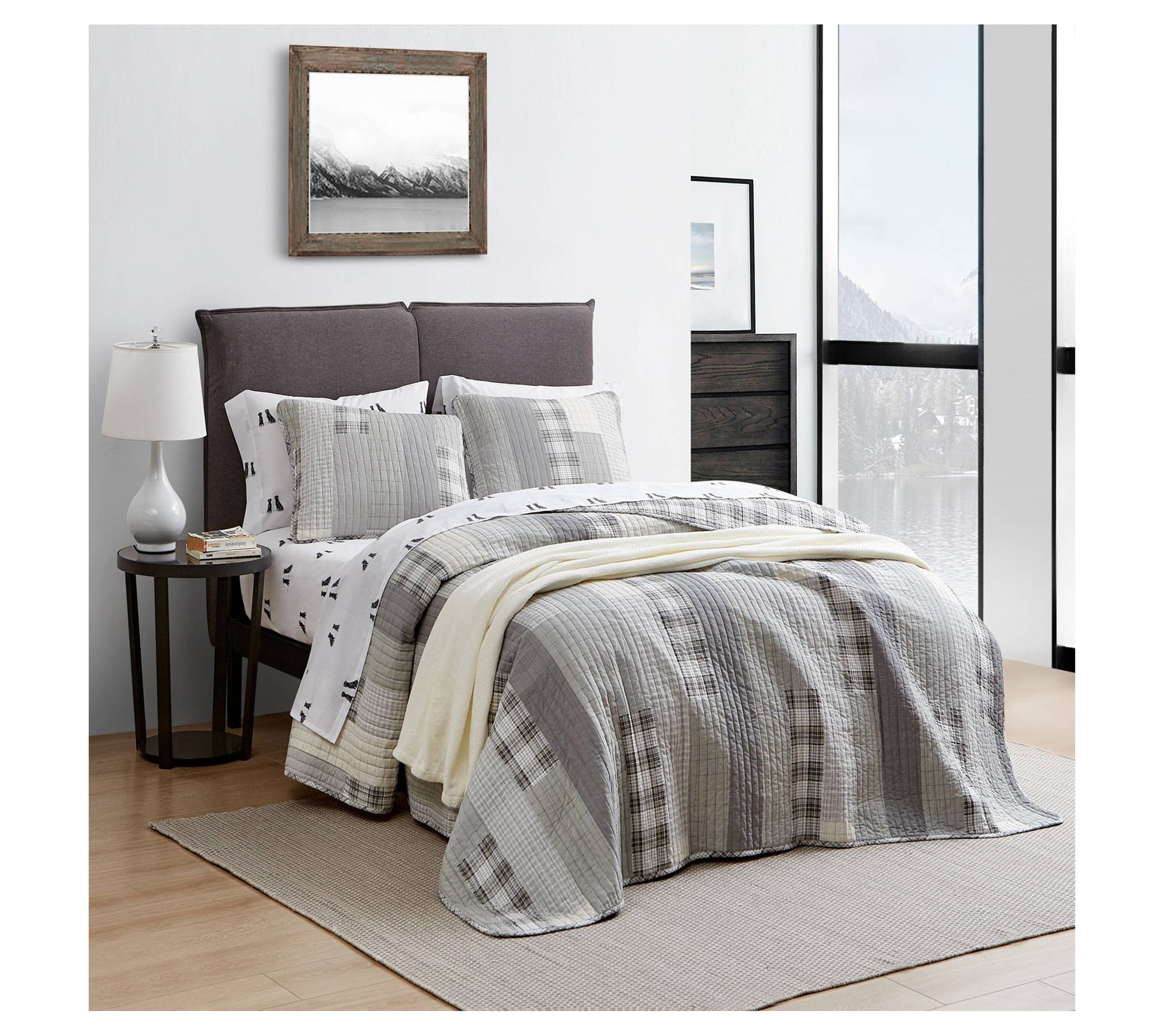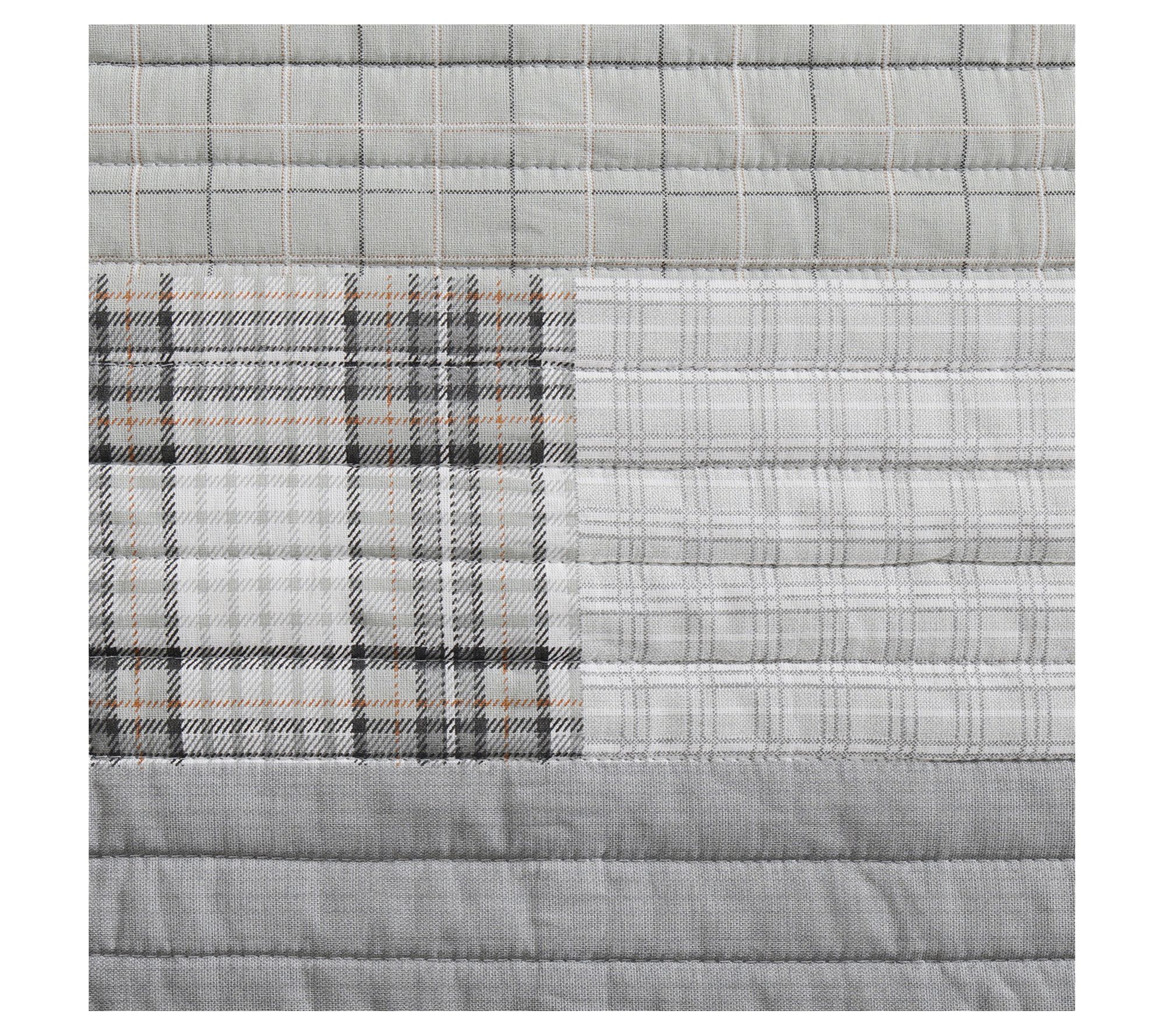 Get into bed with one of Eddie's favorite quilts -- the Fairview. This set features a monochromatic patchwork design in grey and ivory, reversing to a modern gingham. It's lightweight yet warm, making it perfect for year-round use. From Eddie Bauer.