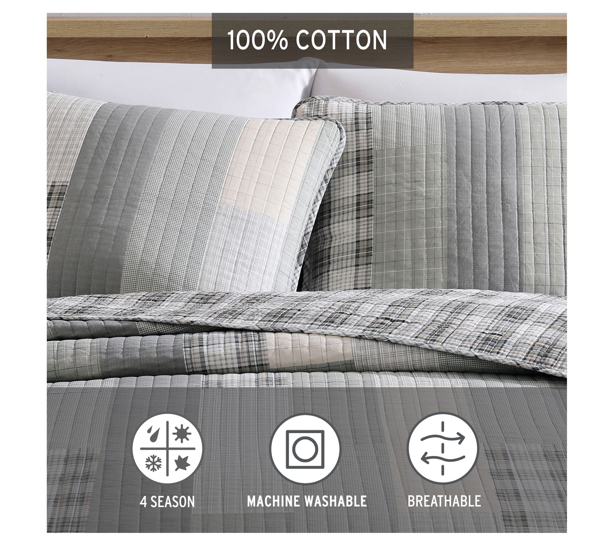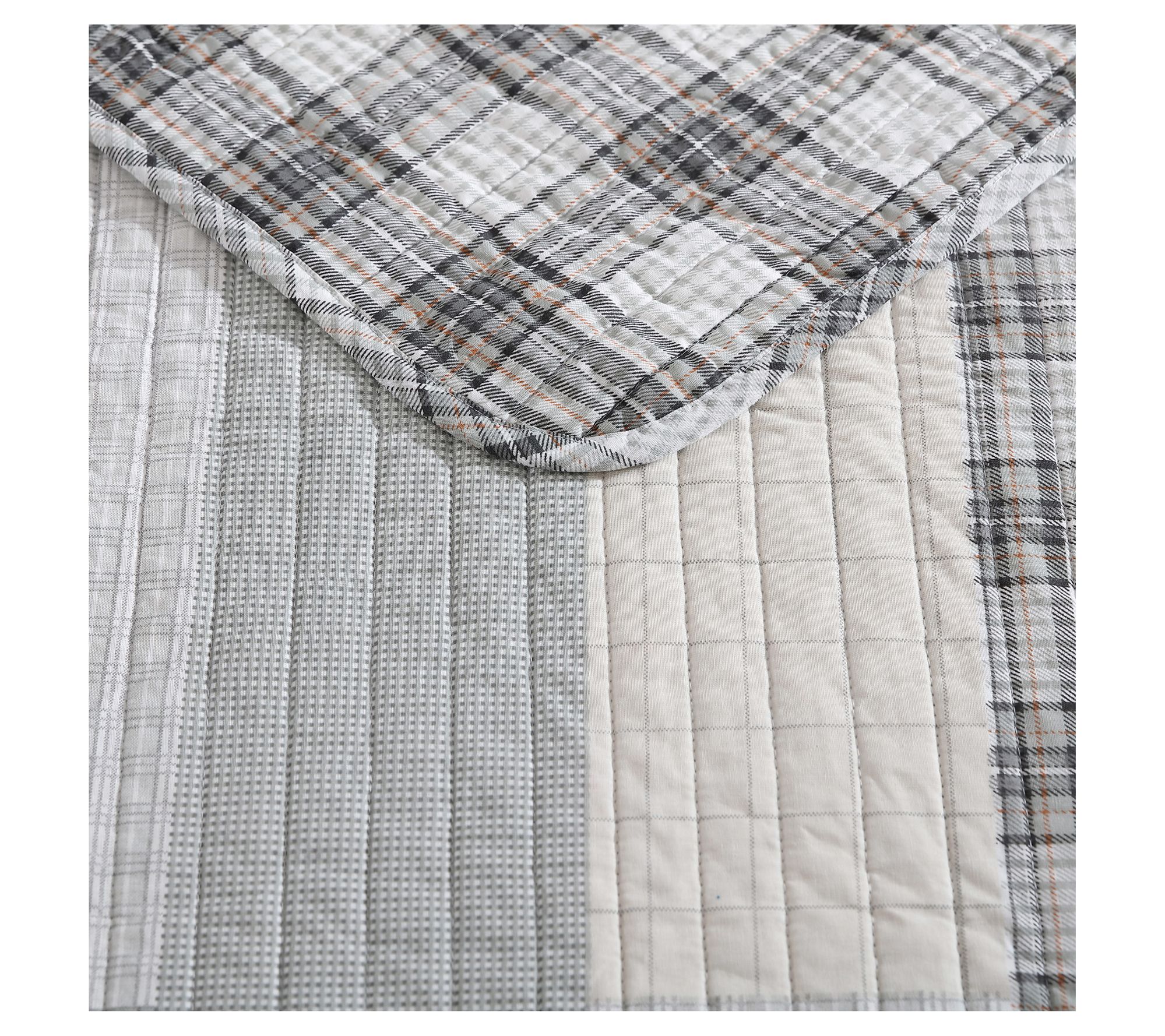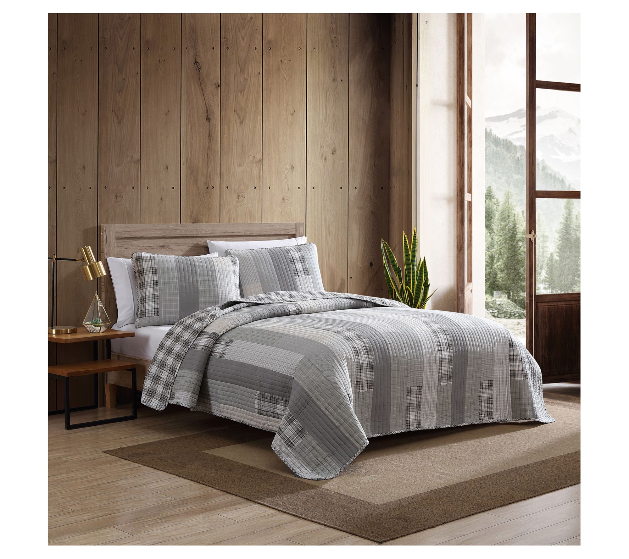 Get into bed with one of Eddie's favorite quilts -- the Fairview. This set features a monochromatic patchwork design in grey and ivory, reversing to a modern gingham. It's lightweight yet warm, making it perfect for year-round use. From Eddie Bauer.
