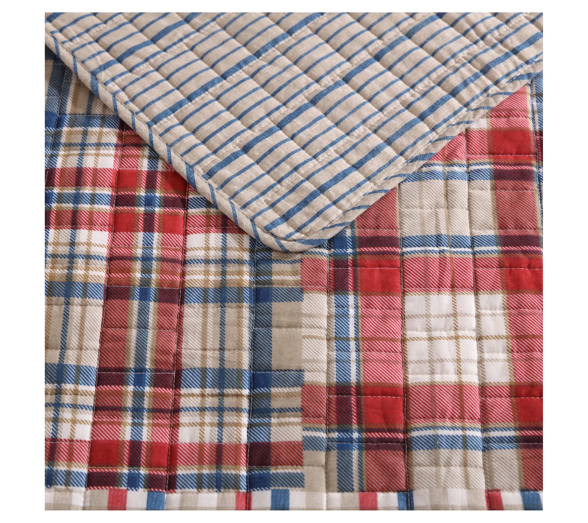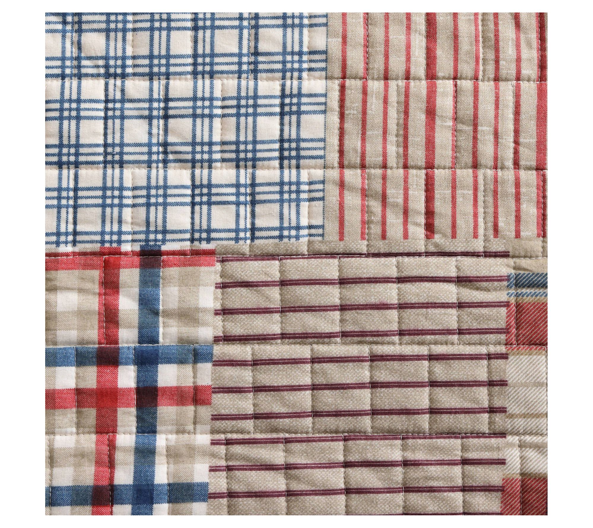 Elevate your bedroom decor with Eddie Bauer's Hawthorne quilt and sham set. This timeless patchwork plaid design in shades of khaki, red, blue, and ivory will add a warm and cozy feel to your space. The quilt reverses to a modern navy pinstripe, offering a fresh look. Made from 100% cotton and pre-washed for extra softness, this set is comfortable. From Eddie Bauer.