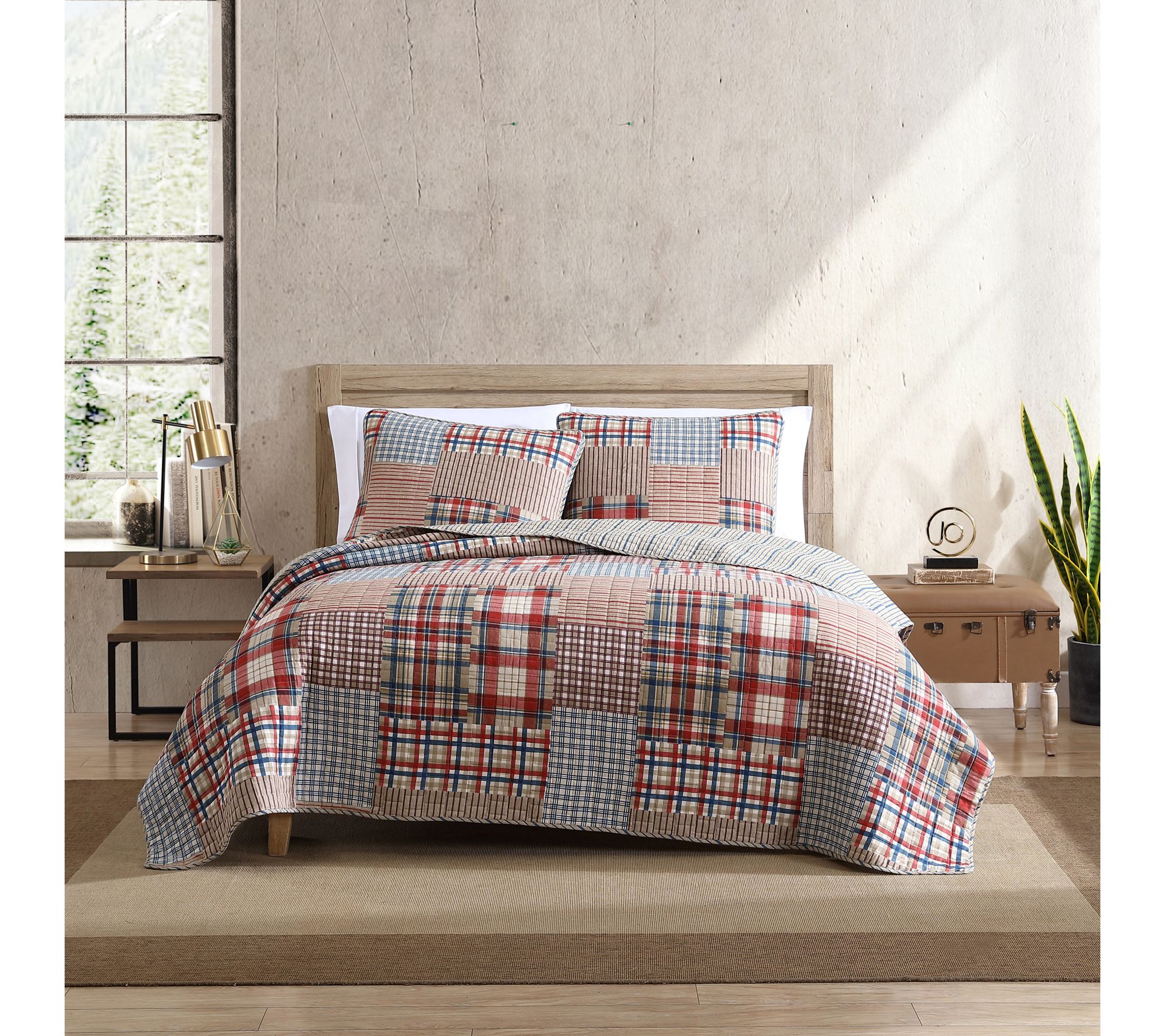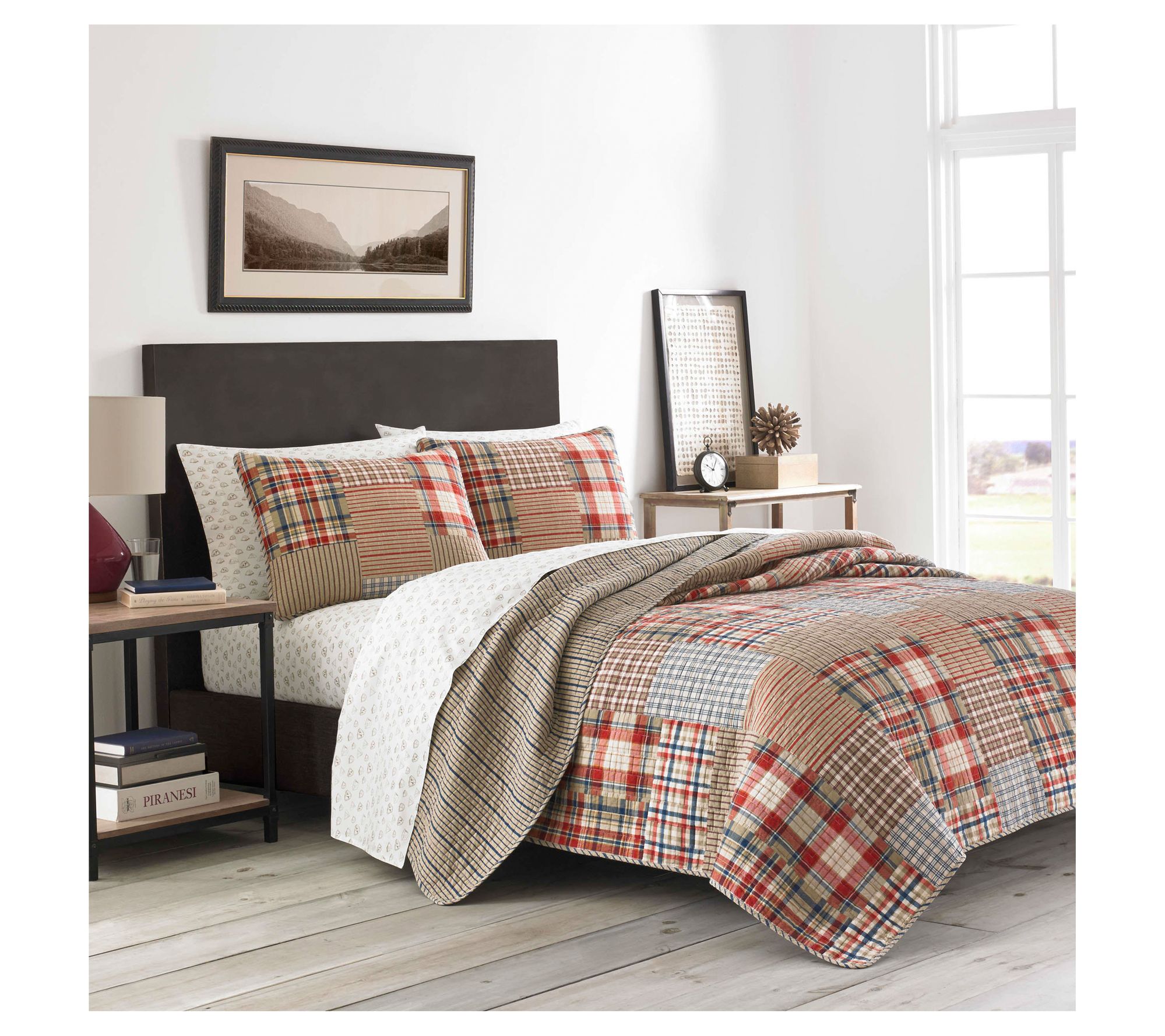 Eddie's favorite heritage Hawthorne collection brings a timeless touch to your bedroom with its patchwork plaid design in shades of khaki, red, blue, and ivory. Reversing to a modern navy pinstripe on a khaki ground, this set offers two stylish looks in one. The quilt and sham set is pre-washed for added softness and comfort. From Eddie Bauer.
