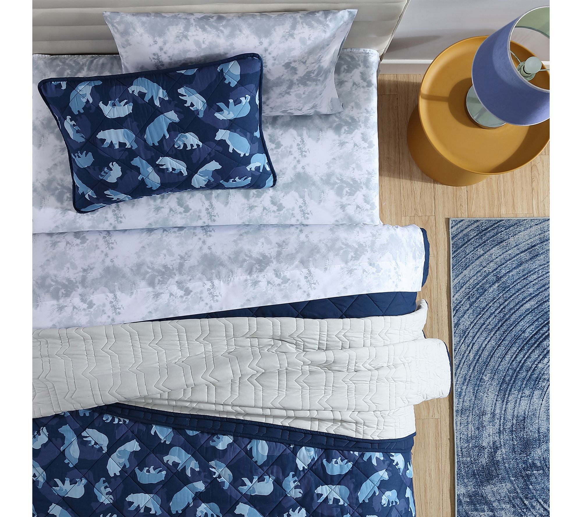 Whether it's a cozy night at home or a sleepover with friends, this camp camo bear quilt set surrounds your child's bed with warmth and character. Fun stitching and sturdy construction bring playful style to any room, while easy-care fabric means less fuss for busy parents. From Eddie Bauer.