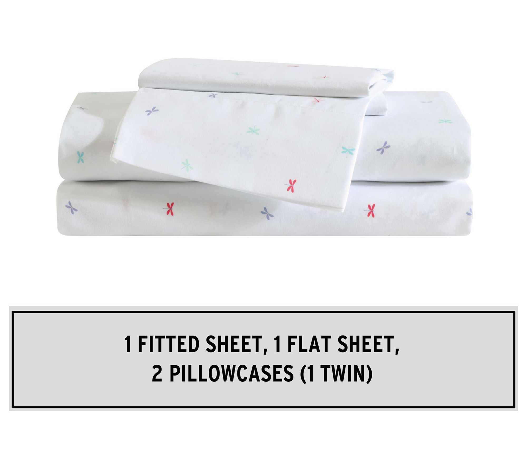 • Includes flat sheet, fitted sheet, and two pillowcases