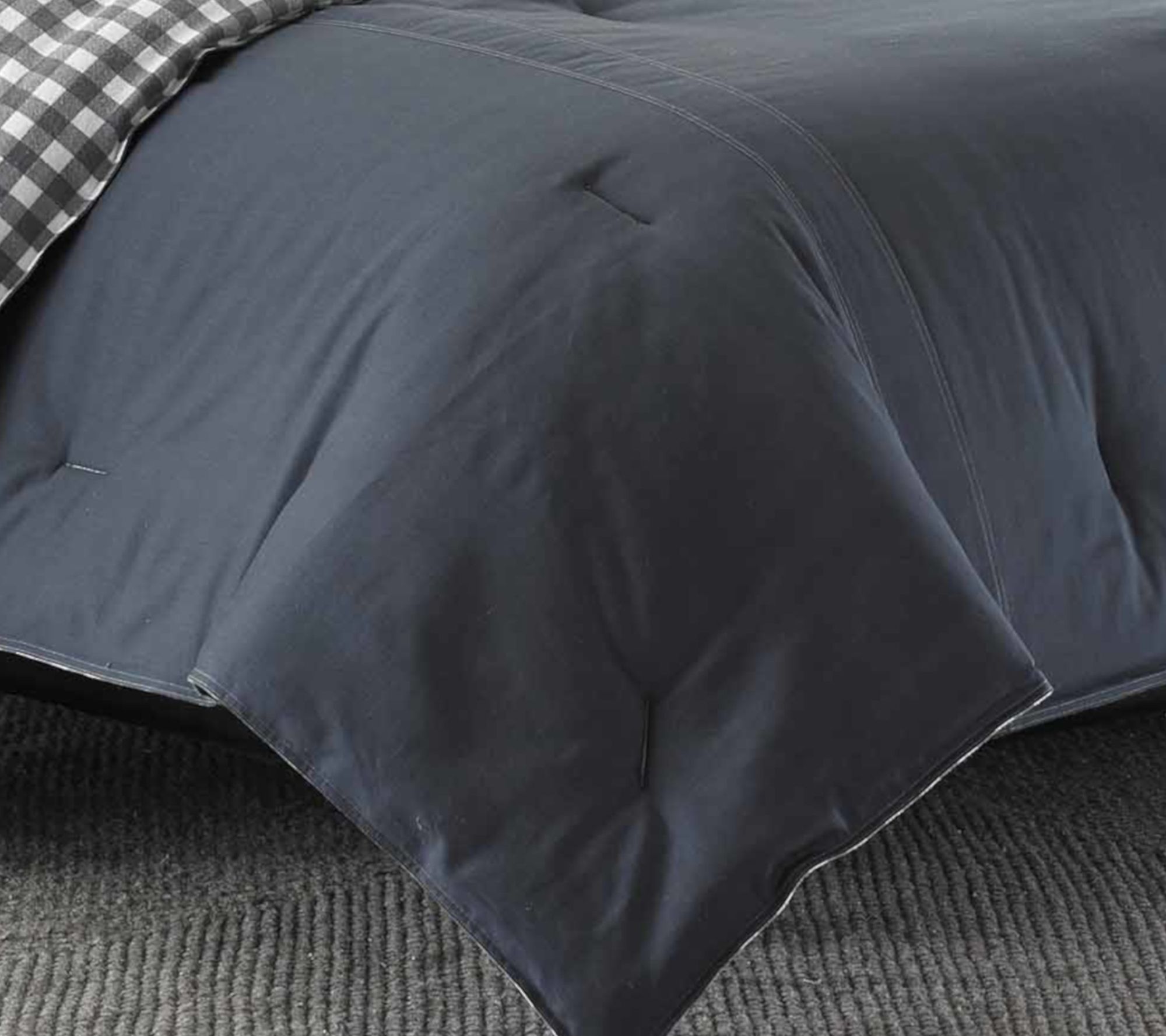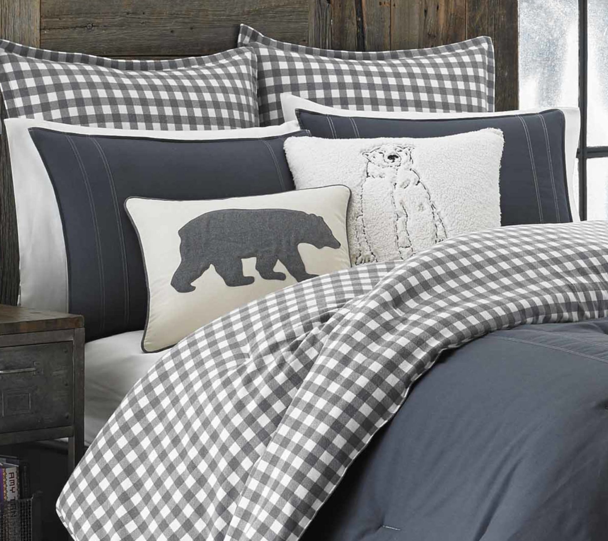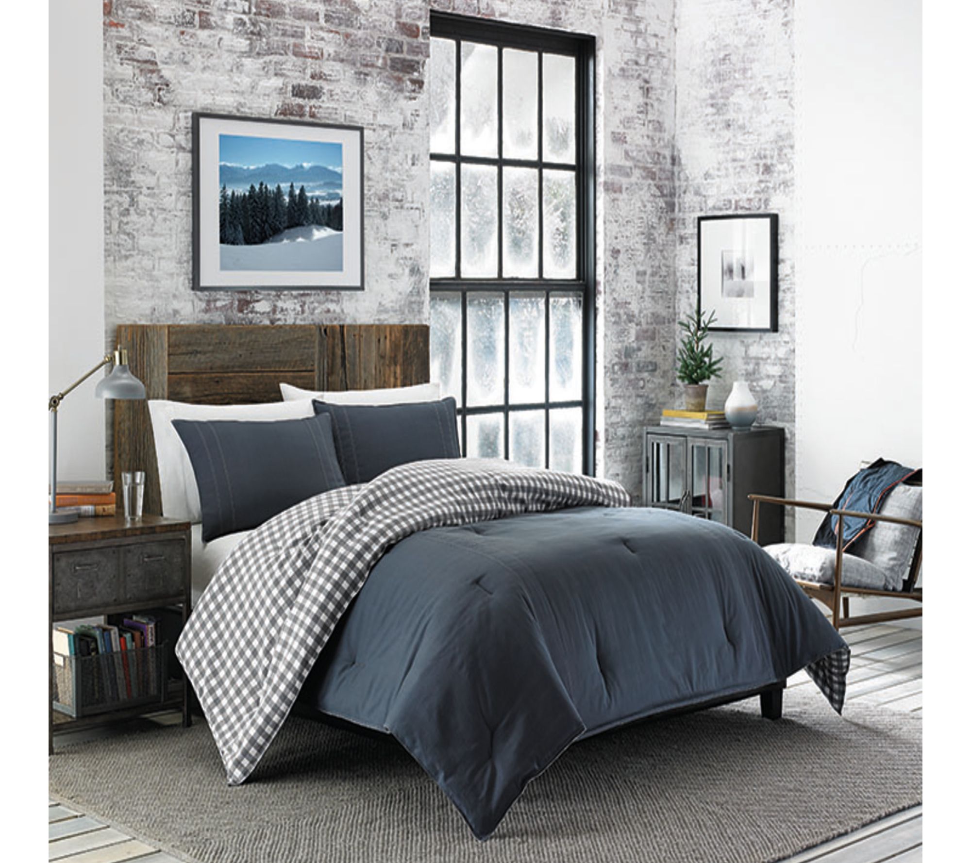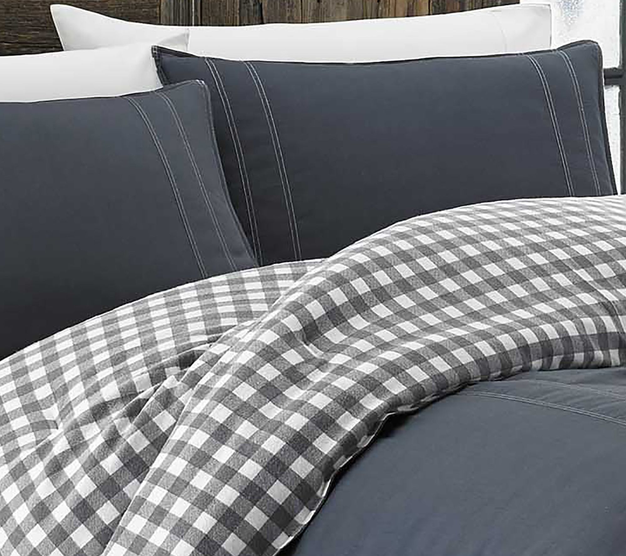 Soft cotton brings inviting comfort to your bed, while the Kingston grey reversible comforter set refreshes your room with versatile style. A solid twill face adds subtle texture, and the cozy flannel reverse features a classic charcoal and ivory buffalo plaid print -- just flip it for a different look whenever you want a change. From Eddie Bauer.