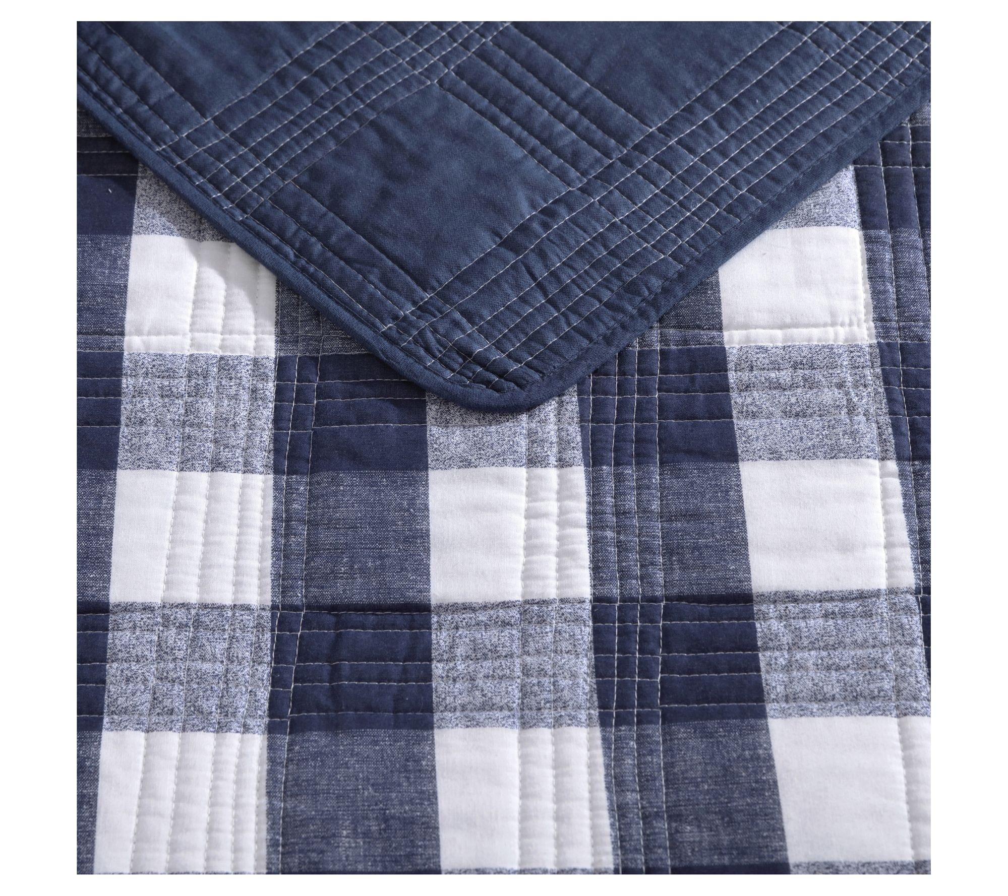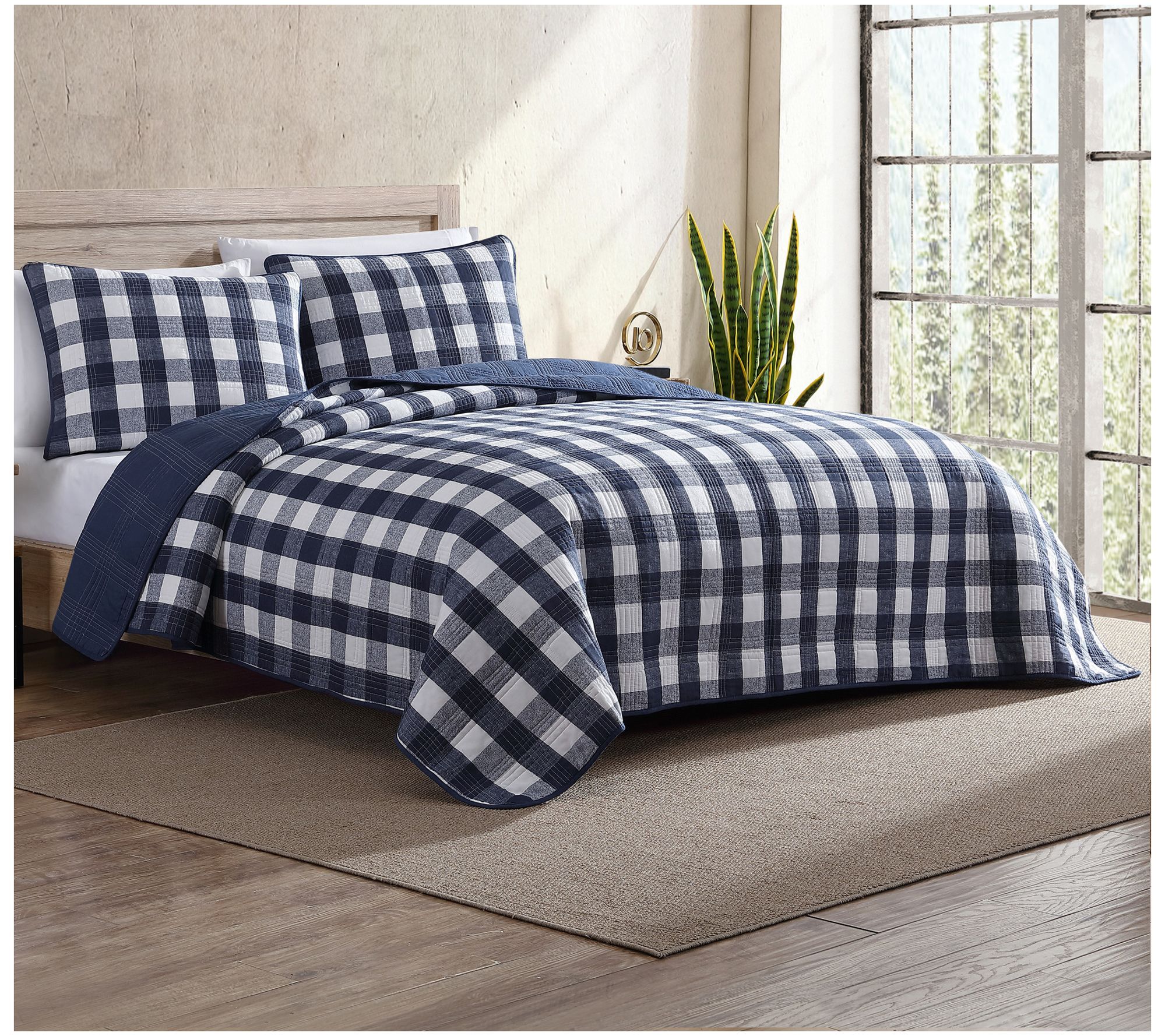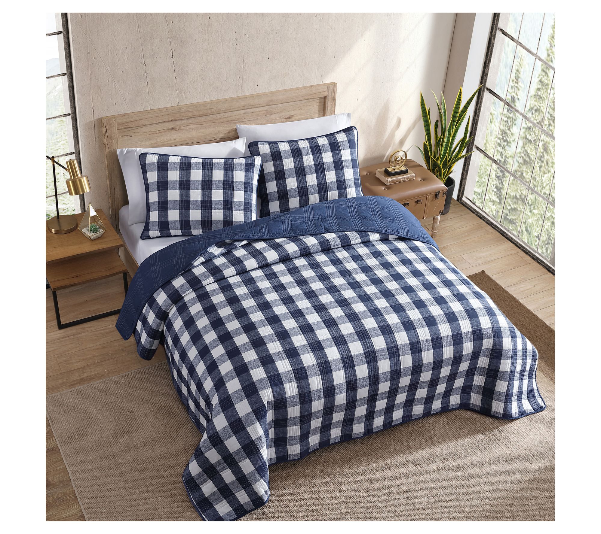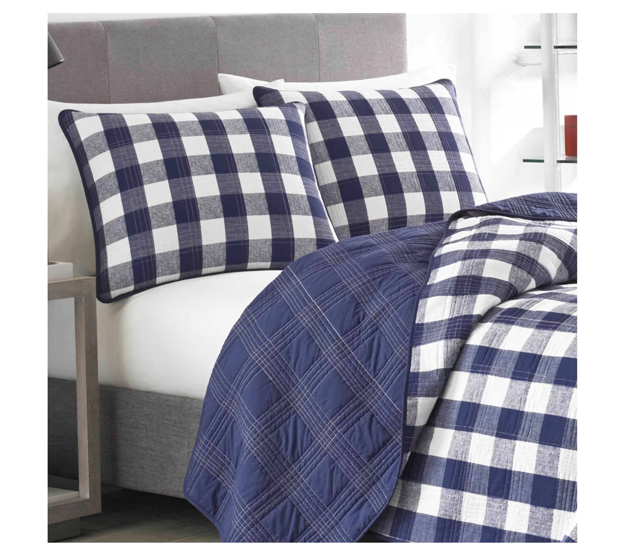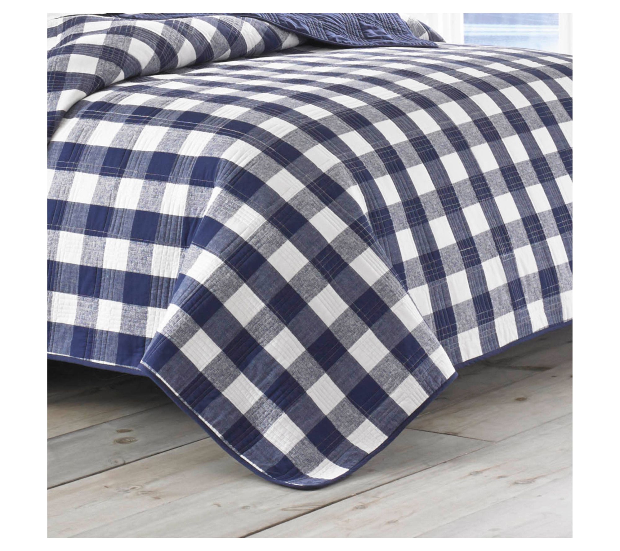Add a touch of classic charm to your bedroom with this Eddie Bauer Lakehouse plaid quilt and sham set. Featuring a modern check pattern in soothing shades of navy and white, this set effortlessly combines style and comfort. From Eddie Bauer.