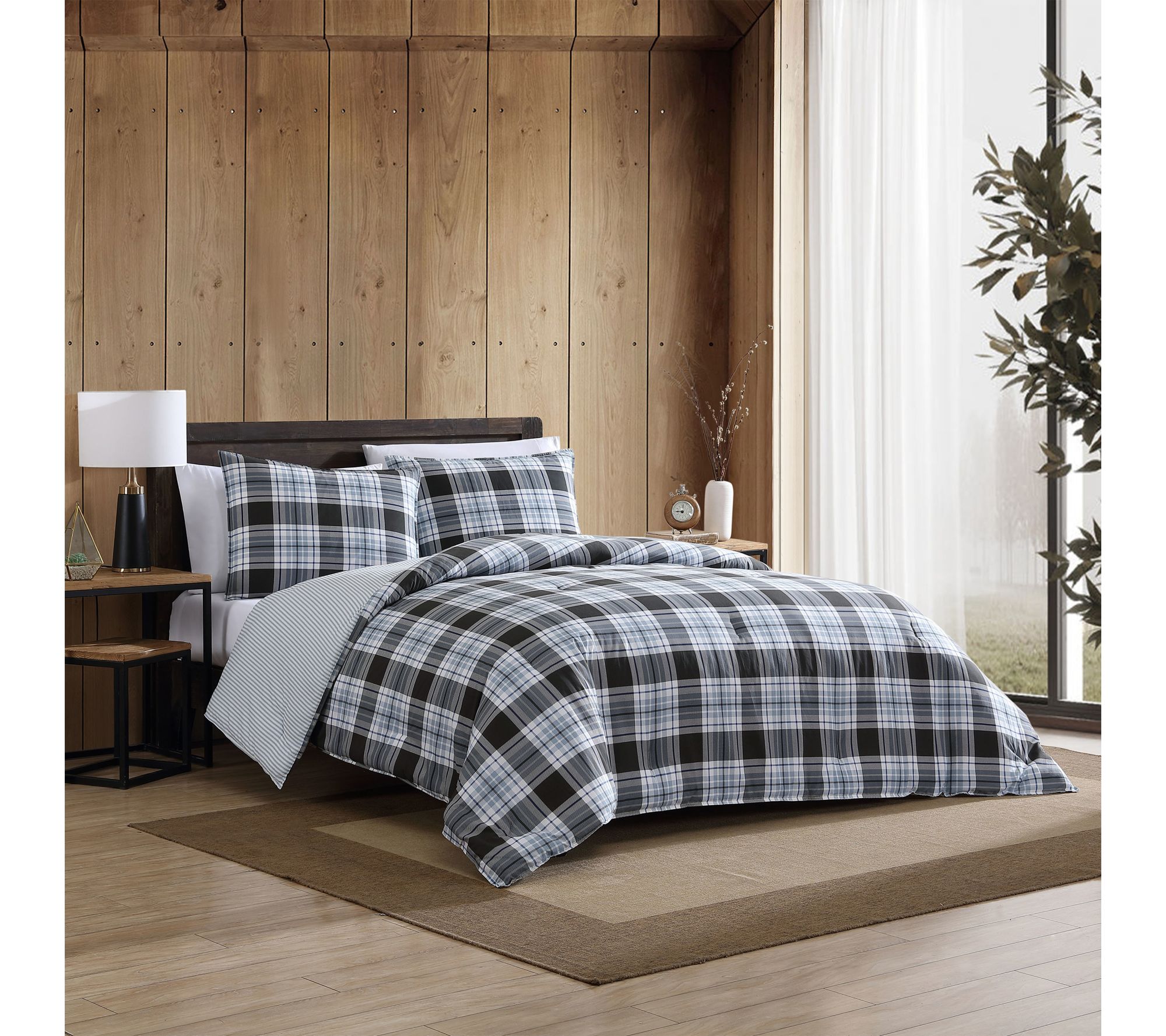 Layer on comfort and style with this Eddie Bauer Lewis Plaid Navy Cotton Full/Queen Comforter Set. The tailored double-stitched edges and classic plaid pattern bring a cozy, updated touch to evenings spent unwinding or weekend mornings lounging in bed. Crisp stripes on the reverse offer a modern vibe for a versatile look, seamlessly fitting into any bedroom setting. From Eddie Bauer.