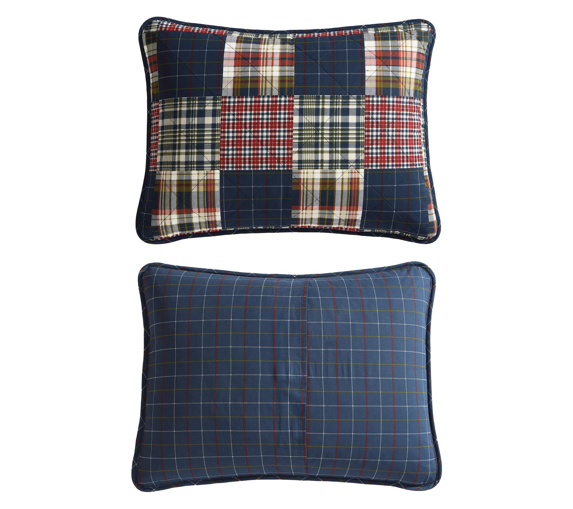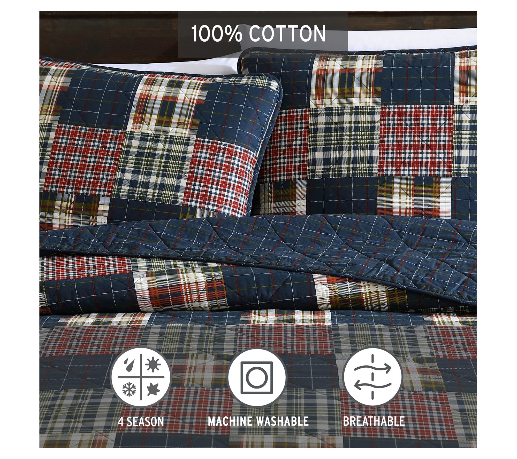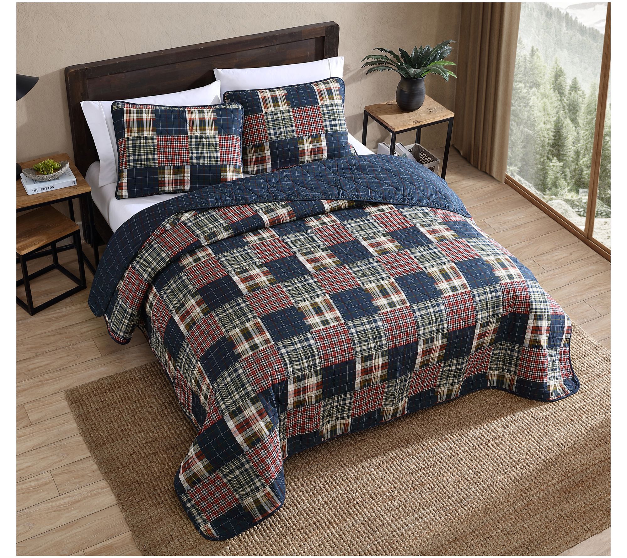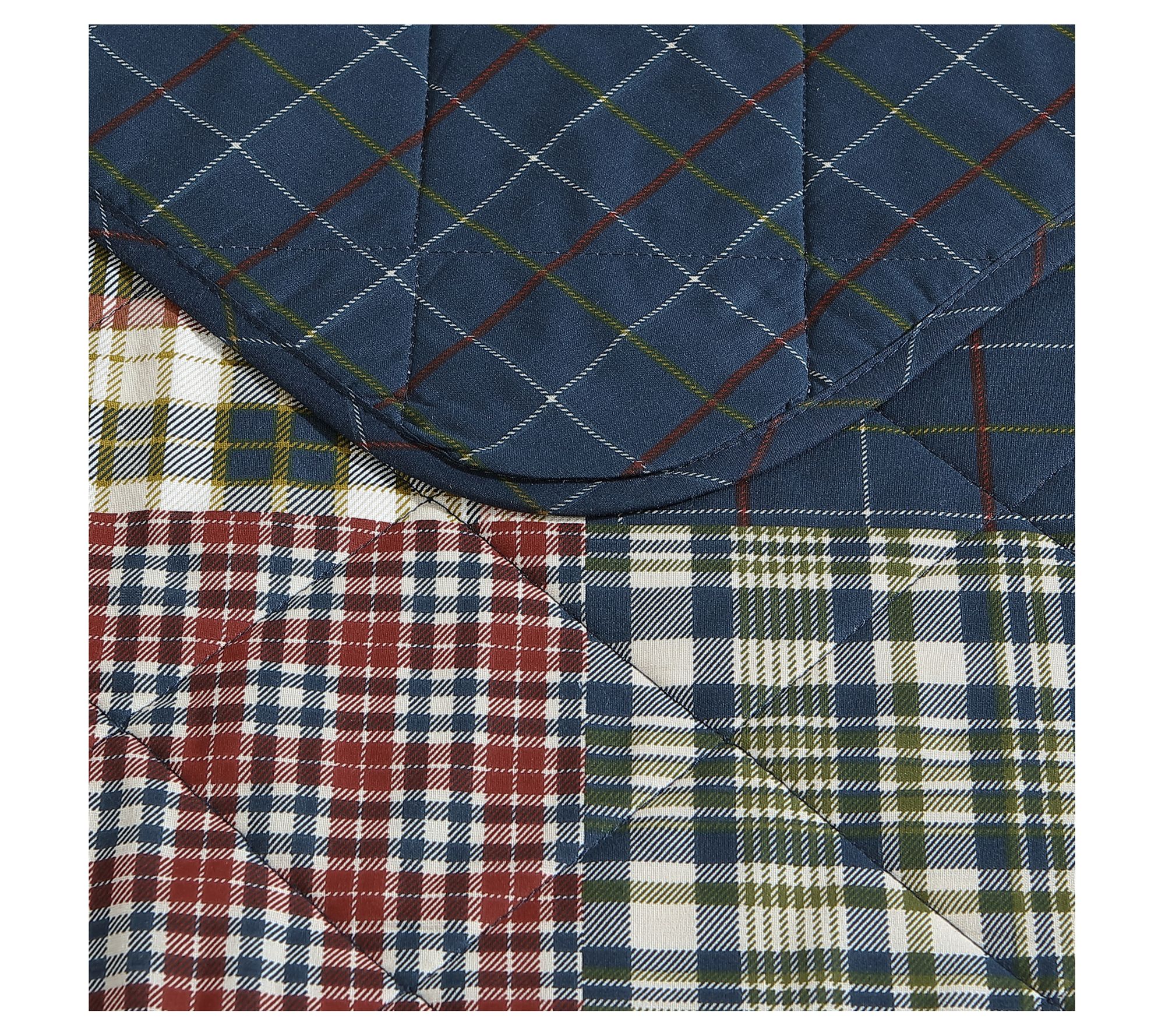 Give your bedroom a cozy and timeless look with the Eddie Bauer Madrona plaid quilt and sham set. Featuring a traditional plaid design in multi-colored patchwork with navy grid print on the reverse, this set adds warmth and style. From Eddie Bauer.
