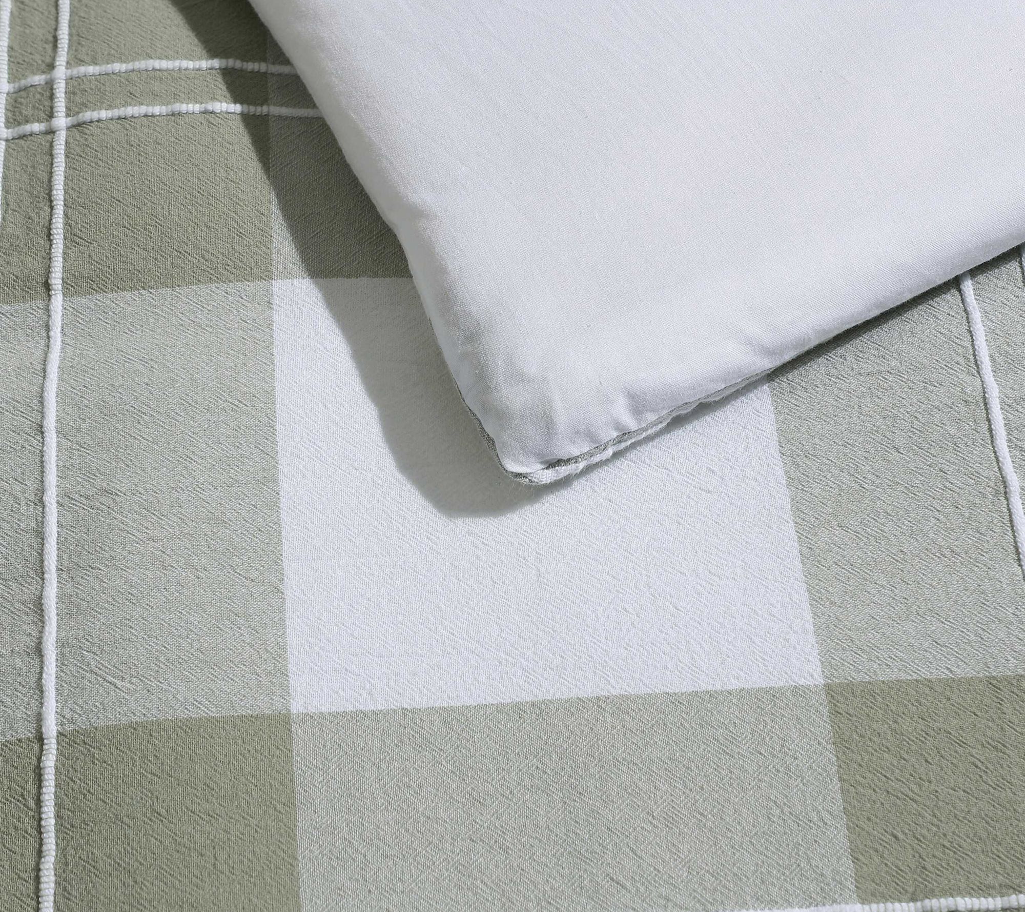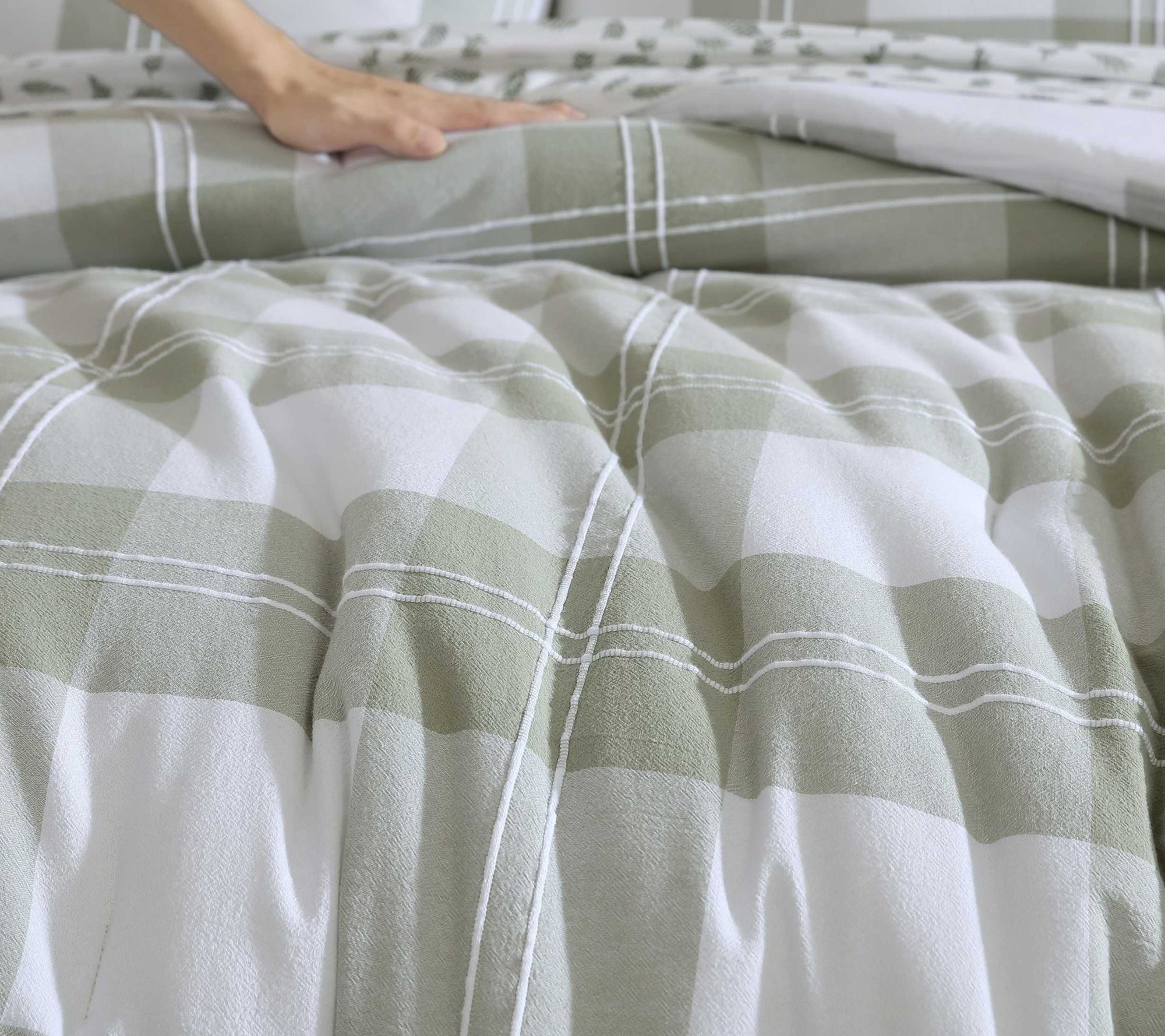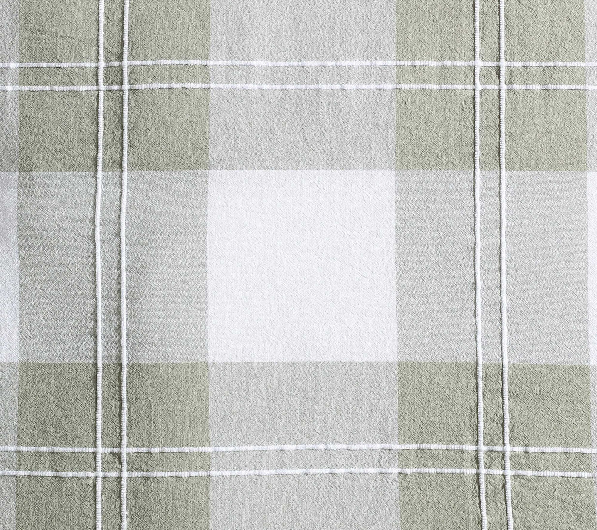 • Soft green and white yarn-dyed plaid adds nature-inspired style