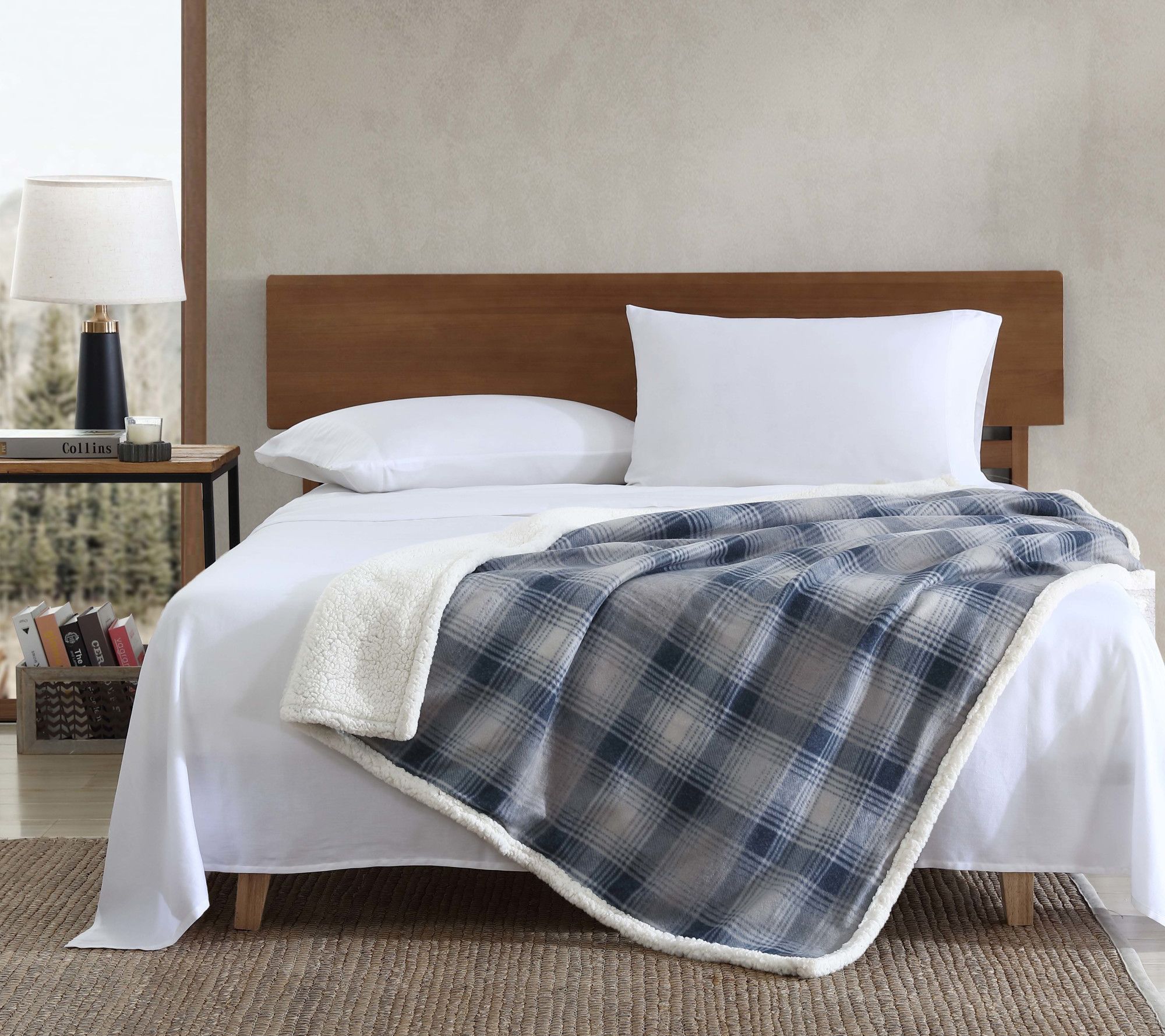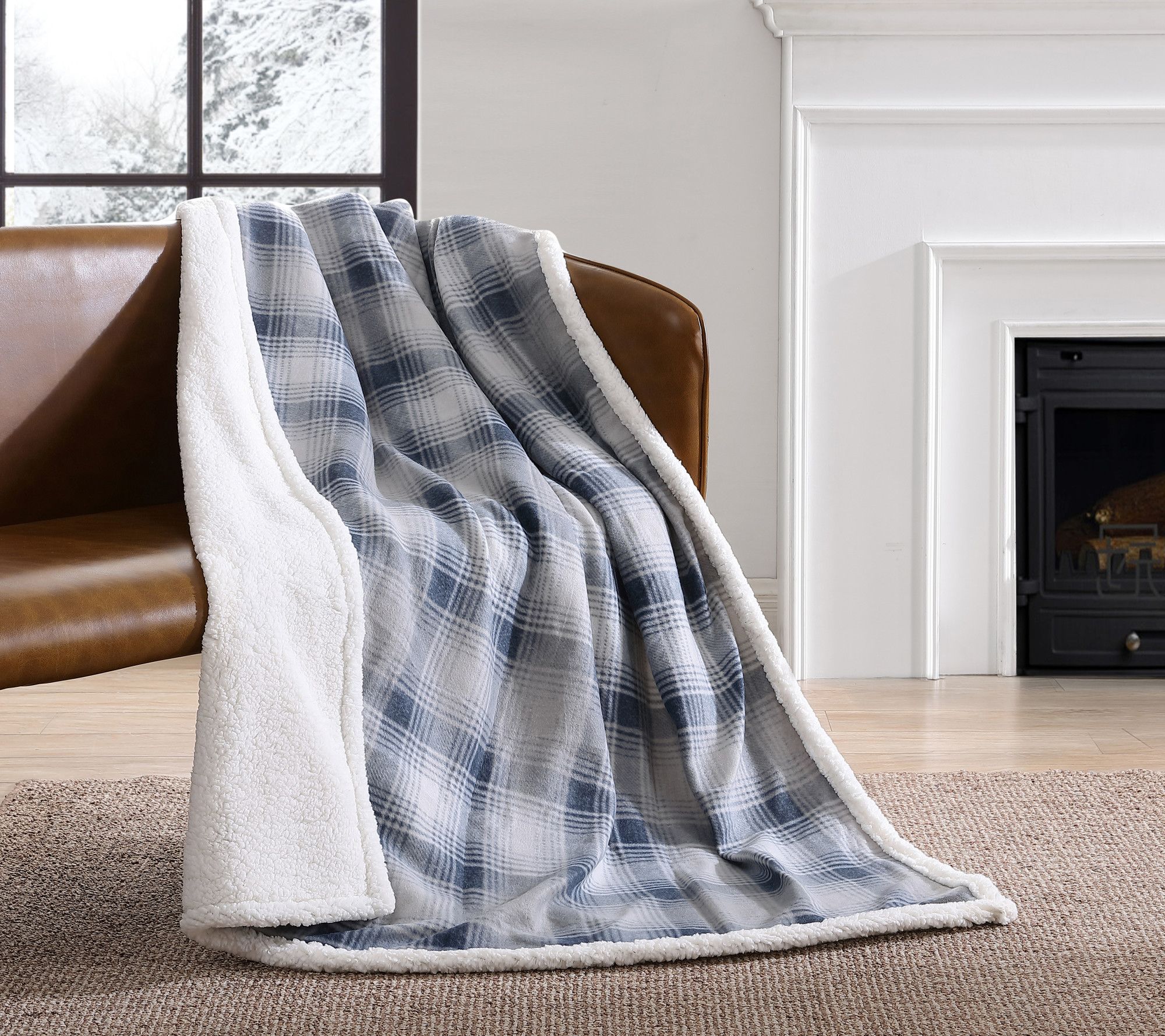 Cozy evenings and on-the-go adventures alike call for this throw -- crafted in a classic blue Nordic plaid and trimmed with plush faux-shearling, it's reversible for extra versatility. A soft popcorn fleece back makes it inviting to snuggle up at home or easy to pack for your next trip. From Eddie Bauer.