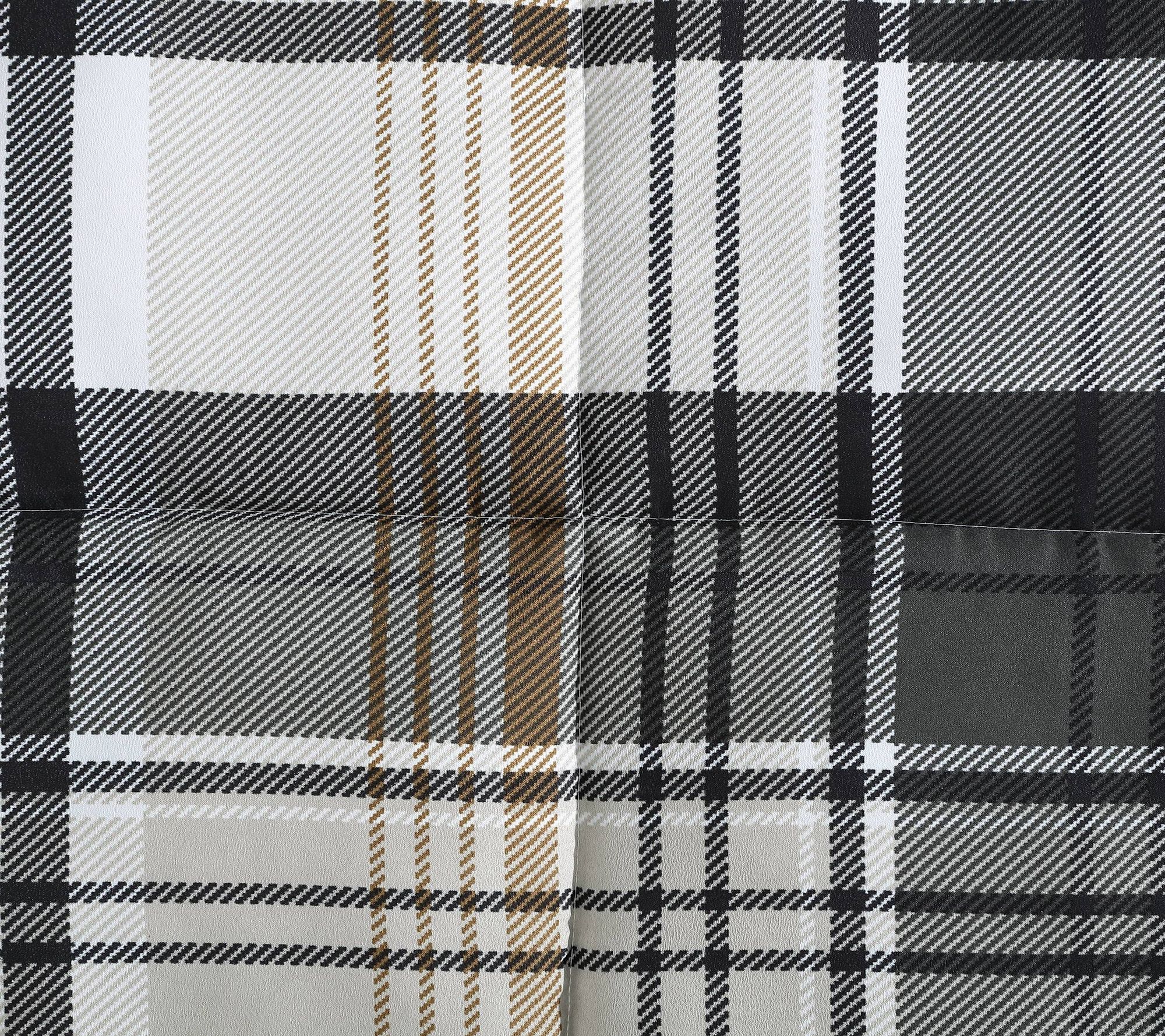 • Large-scale plaid design in beige, black, white, and coppery tan
