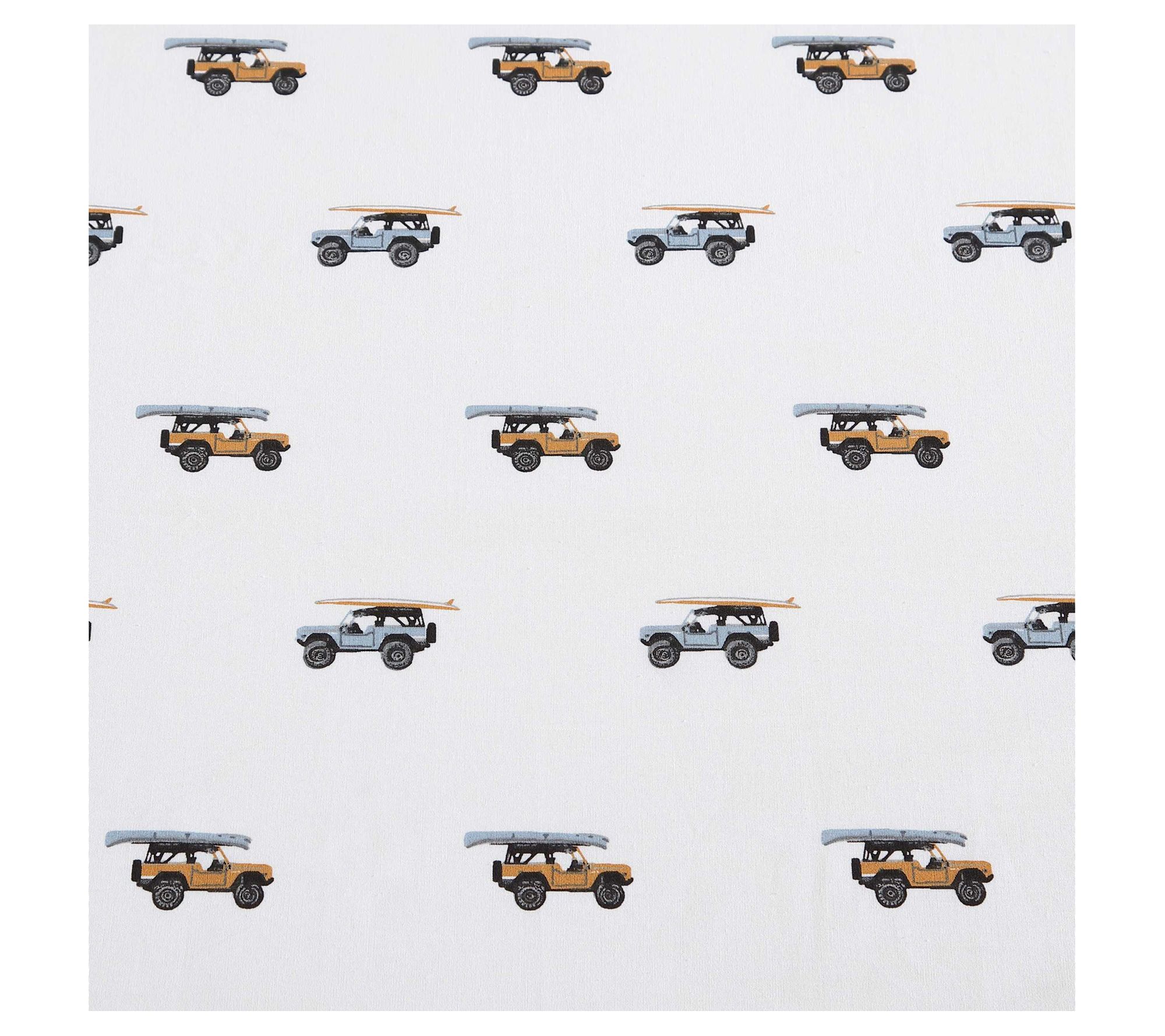 Bring the playful spirit of the coast to your bedroom with this Eddie Bauer Out To The Beach king sheet set, adorned with vibrant blue and orange jeeps and surfboards. Soft cotton percale delivers a crisp, comfortable feel, while the matching print creates a breezy, coordinated look that brightens any space. From Eddie Bauer.