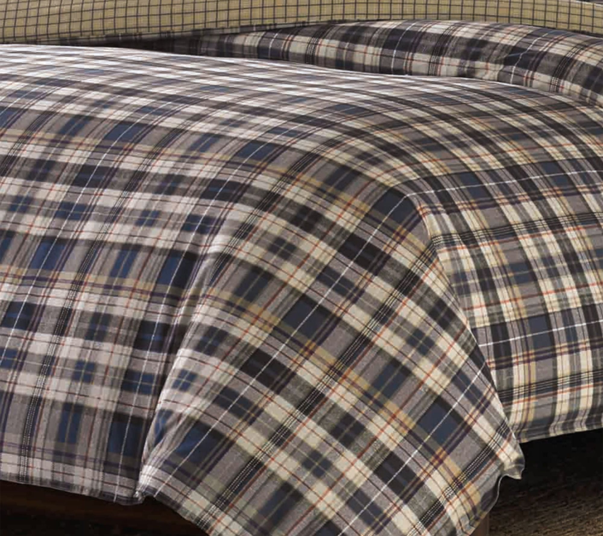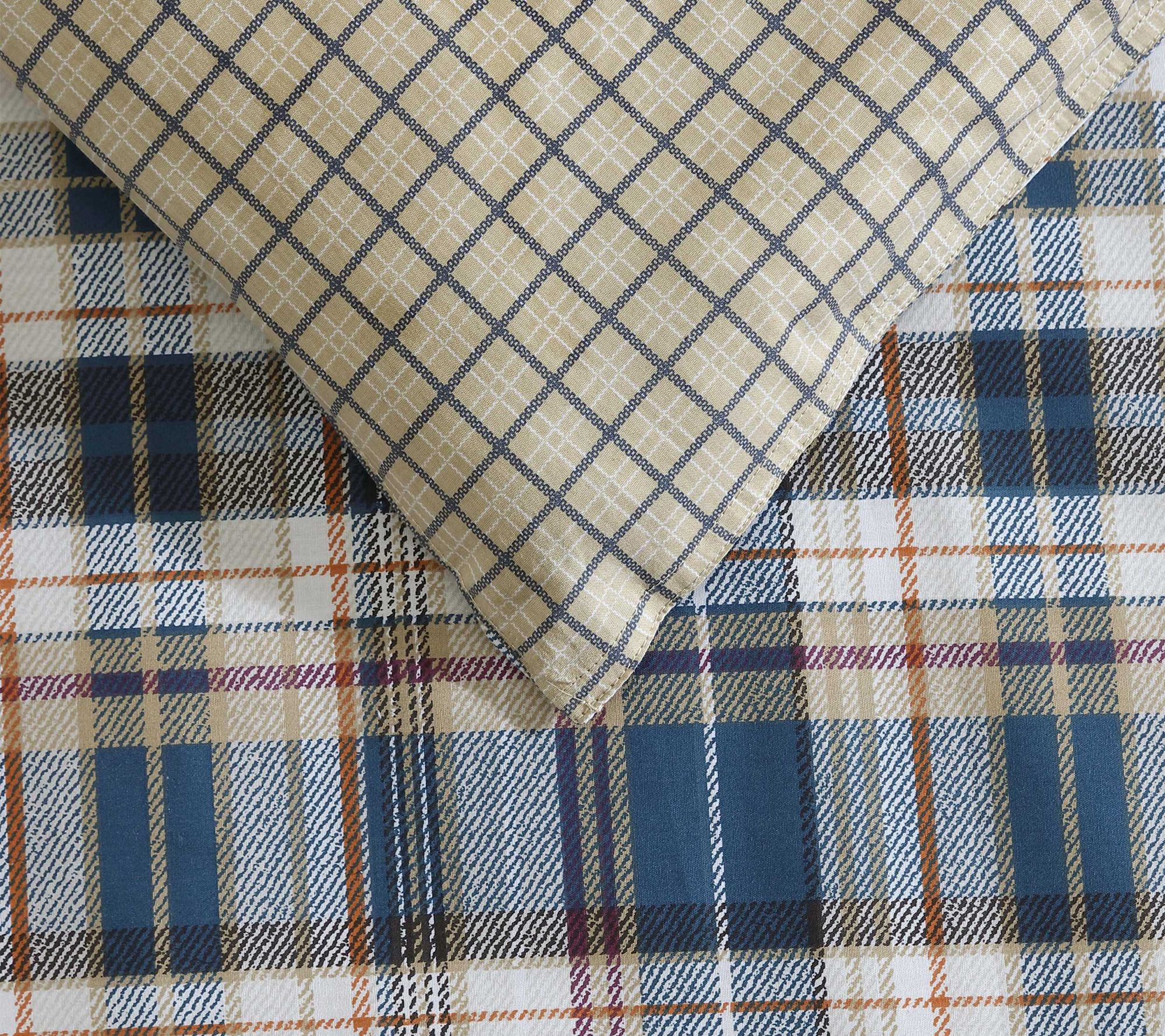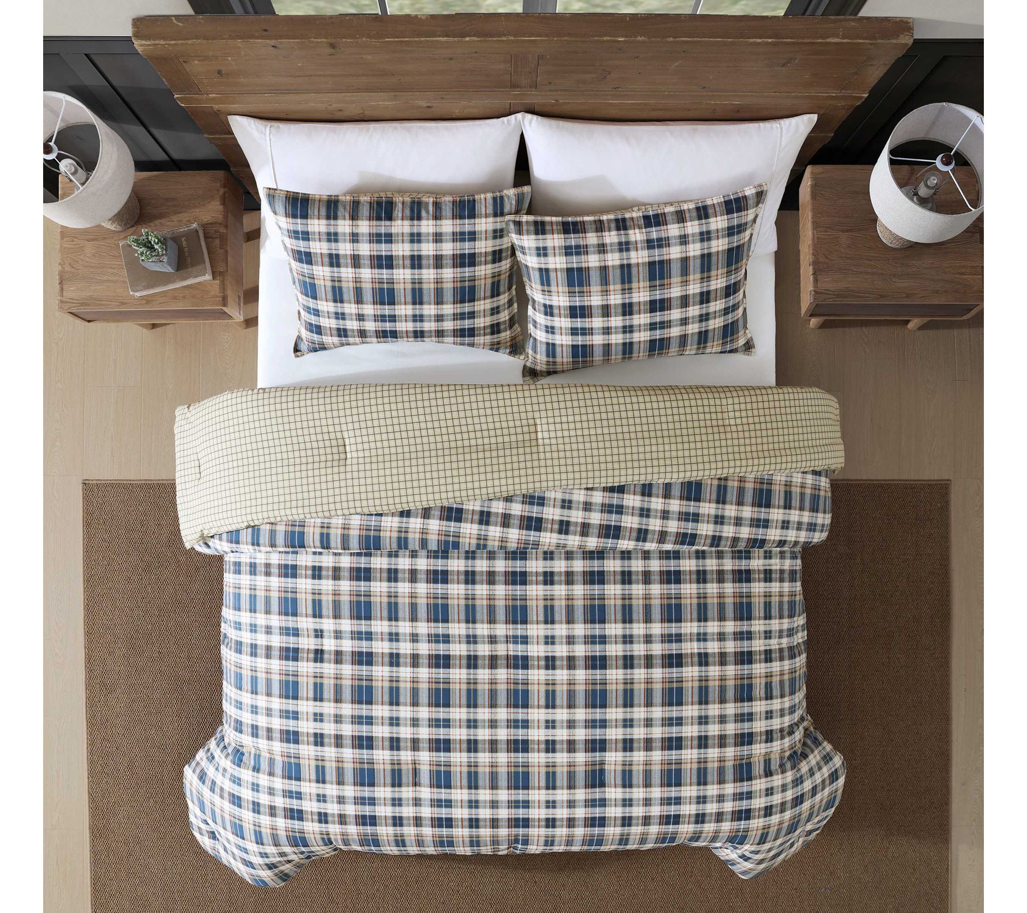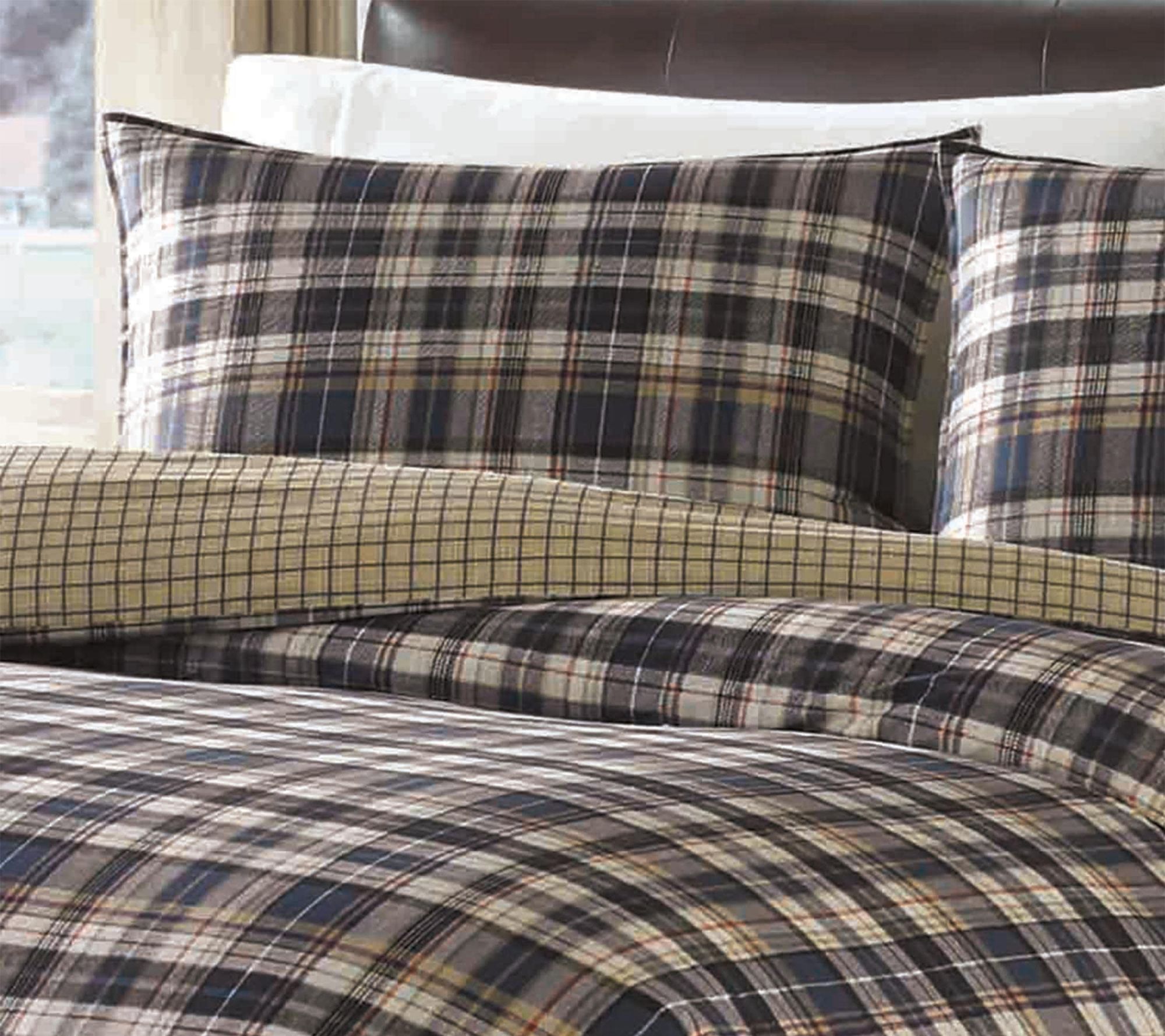 Experience the cozy embrace of classic style with the Eddie Bauer Port Gamble Blue Cotton King Comforter Set. Rich tartan plaid in indigo, saddle, and putty tones, paired with a scarlet accent, brings tailored elegance to your bedroom. Flip the comforter for a neutral check pattern and refresh your space with menswear-inspired charm. From Eddie Bauer.