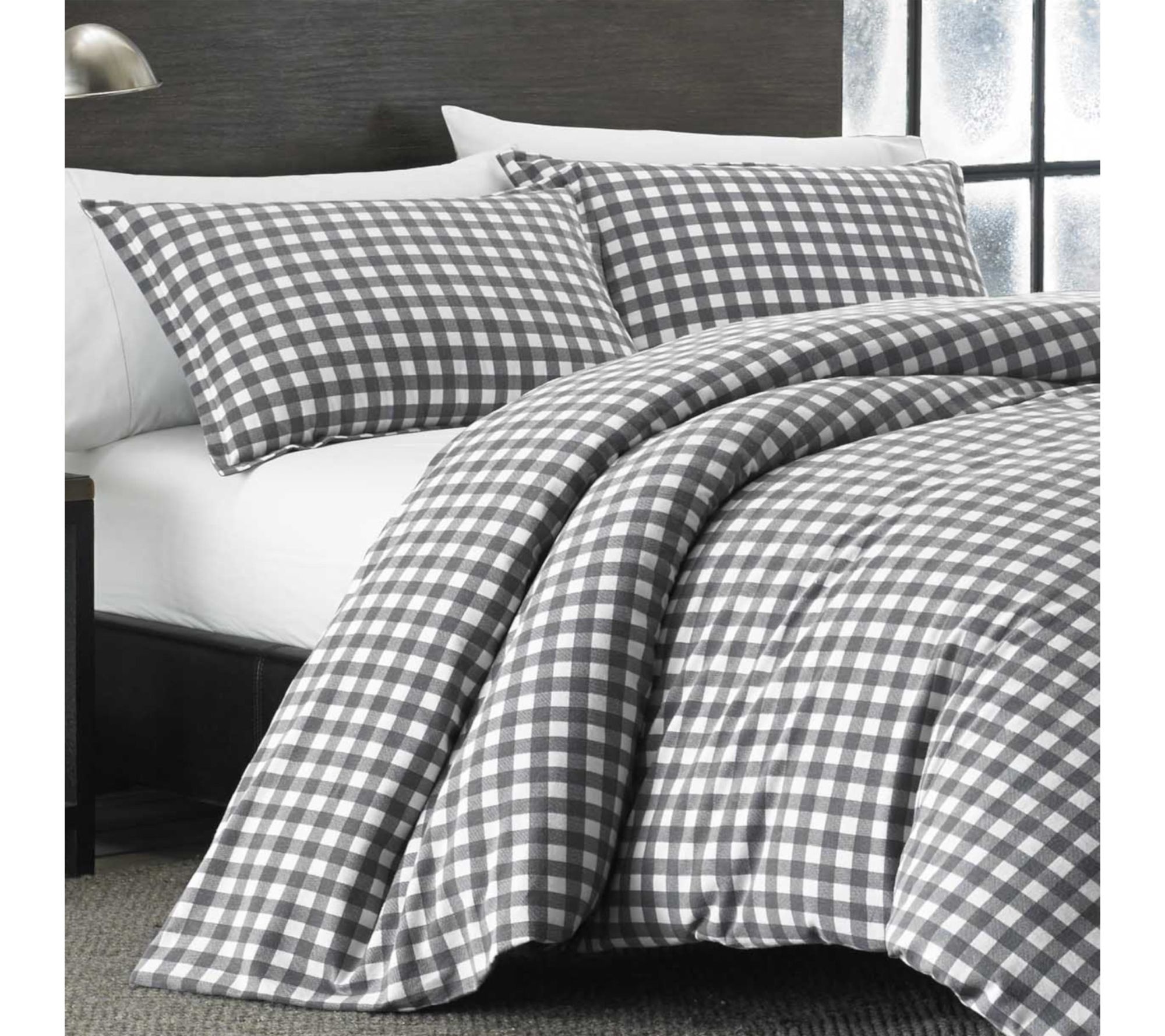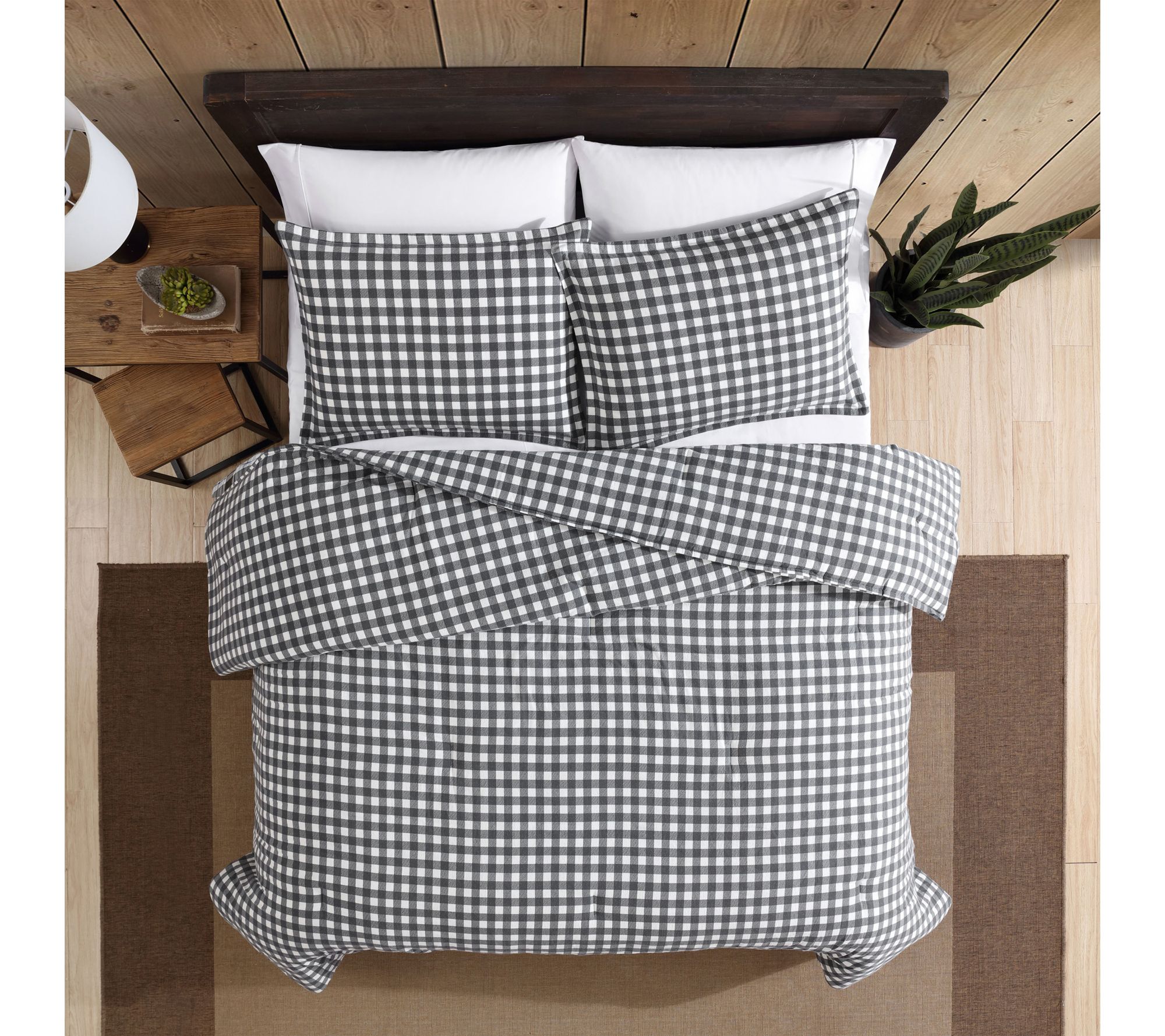 Give your bedroom a welcoming makeover with this cotton comforter set, styled in modern stripes and finished in calming shades of charcoal grey and white. Whether you're relaxing after a long day or cozying up for a restful night's sleep, the soft flannel texture brings an inviting warmth that's easy to maintain. From Eddie Bauer.